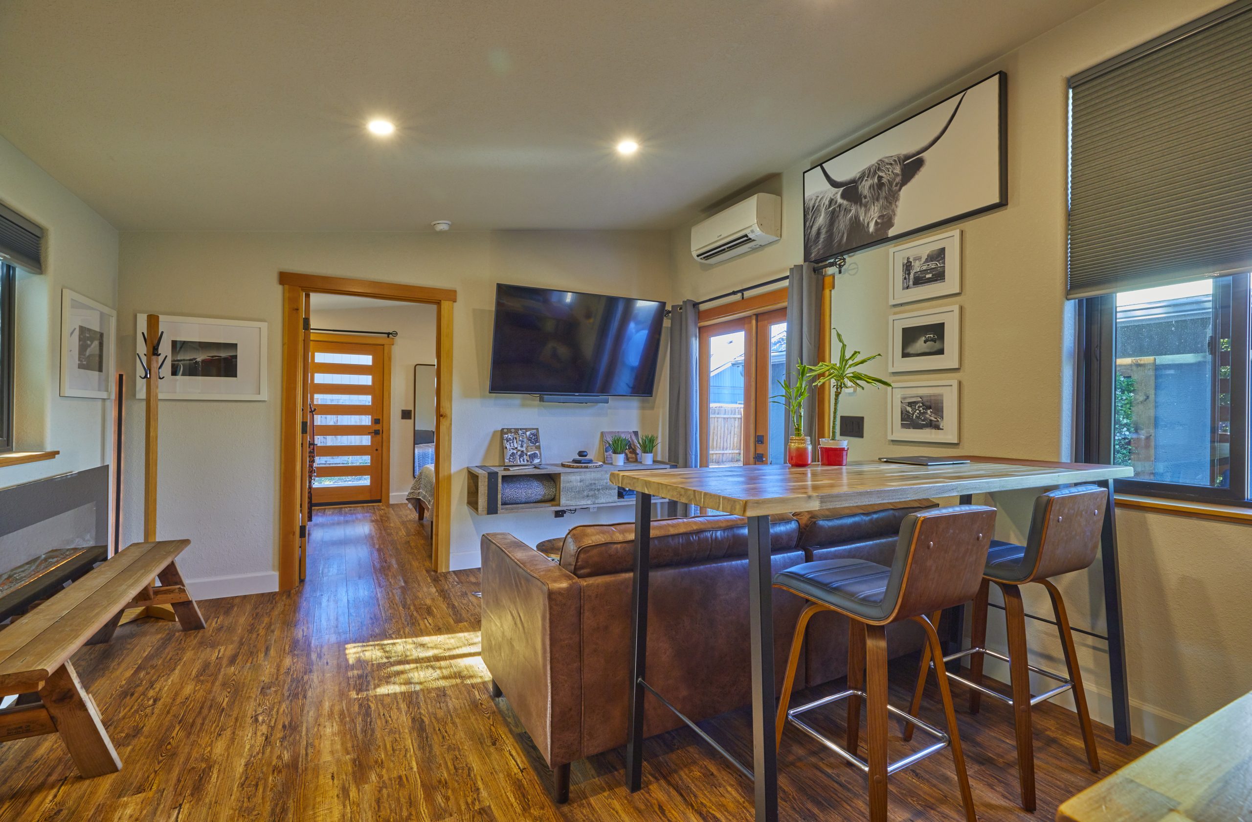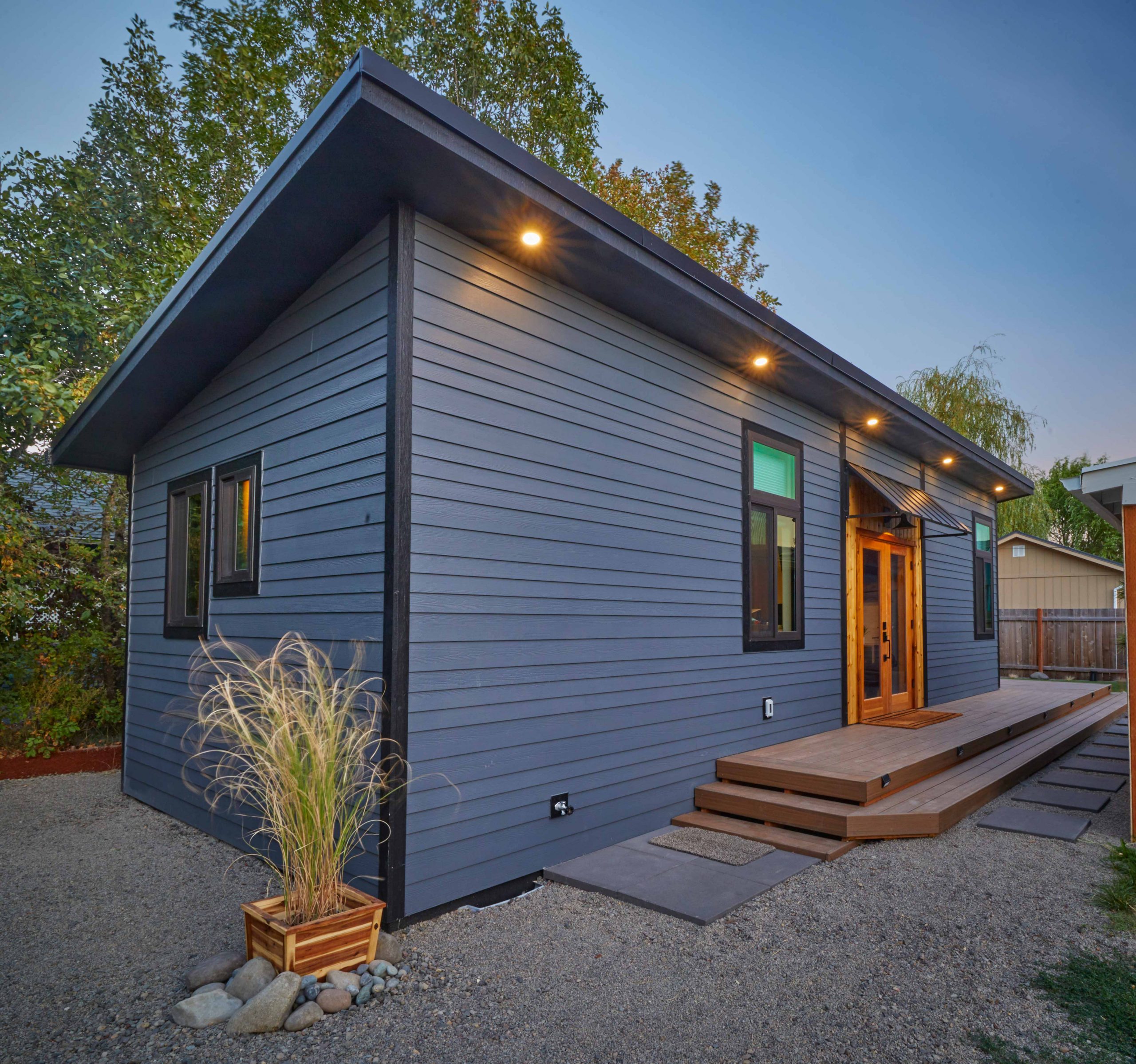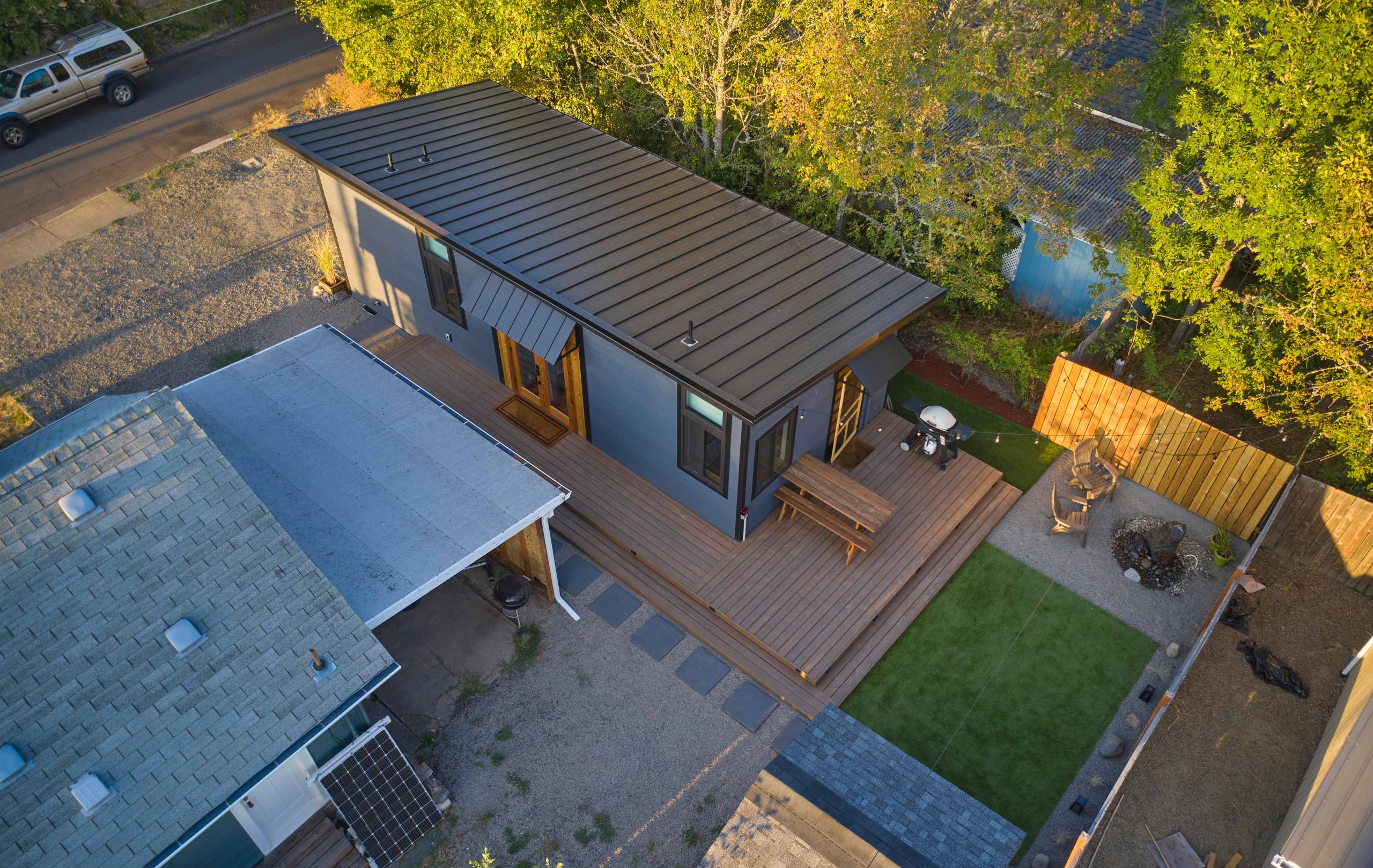 At almost 500 square feet, this light-filled unit is a perfect middle ground between tiny homes and larger scale ADUs. Although small, the home provides more than enough living space for its occupants, a generous bedroom and well-sized bath. A utility module and bedroom module anchor either end of the building, ensuring each space gets access to light and air. The central, open living space provides flexibility, while windows on both sides provide views, light, and a sense of expansion.