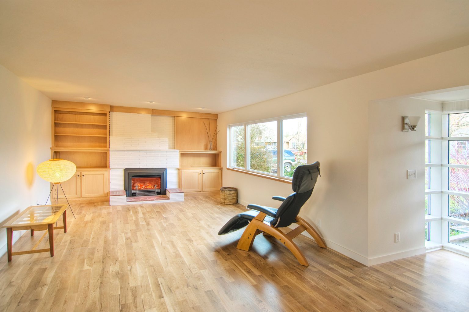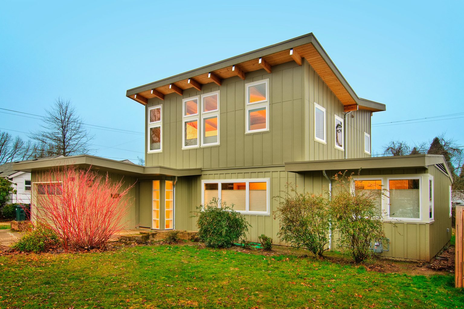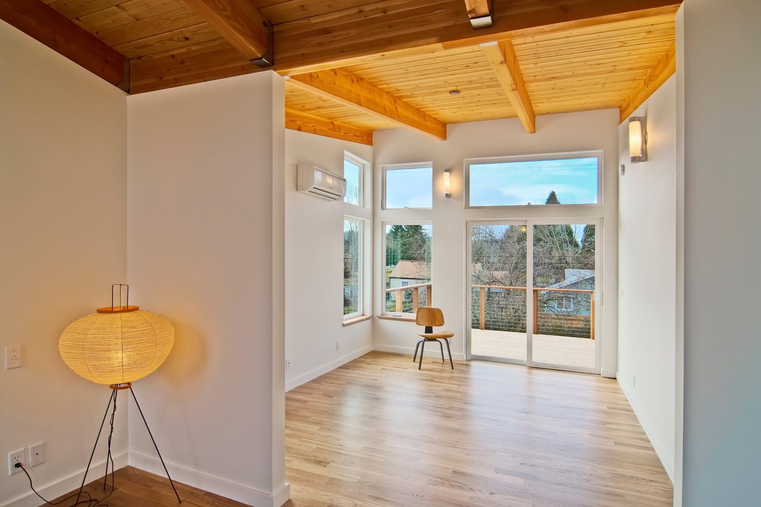 Clean lines, exposed structure, and a restrained modernist vocabulary reinforce the home’s existing character while introducing warmth and light. The new master suite, complete with a home office, is crowned by upward-sweeping eaves. Tall transom windows beneath this roofline flood the second floor with daylight and open the interior to expansive views.
