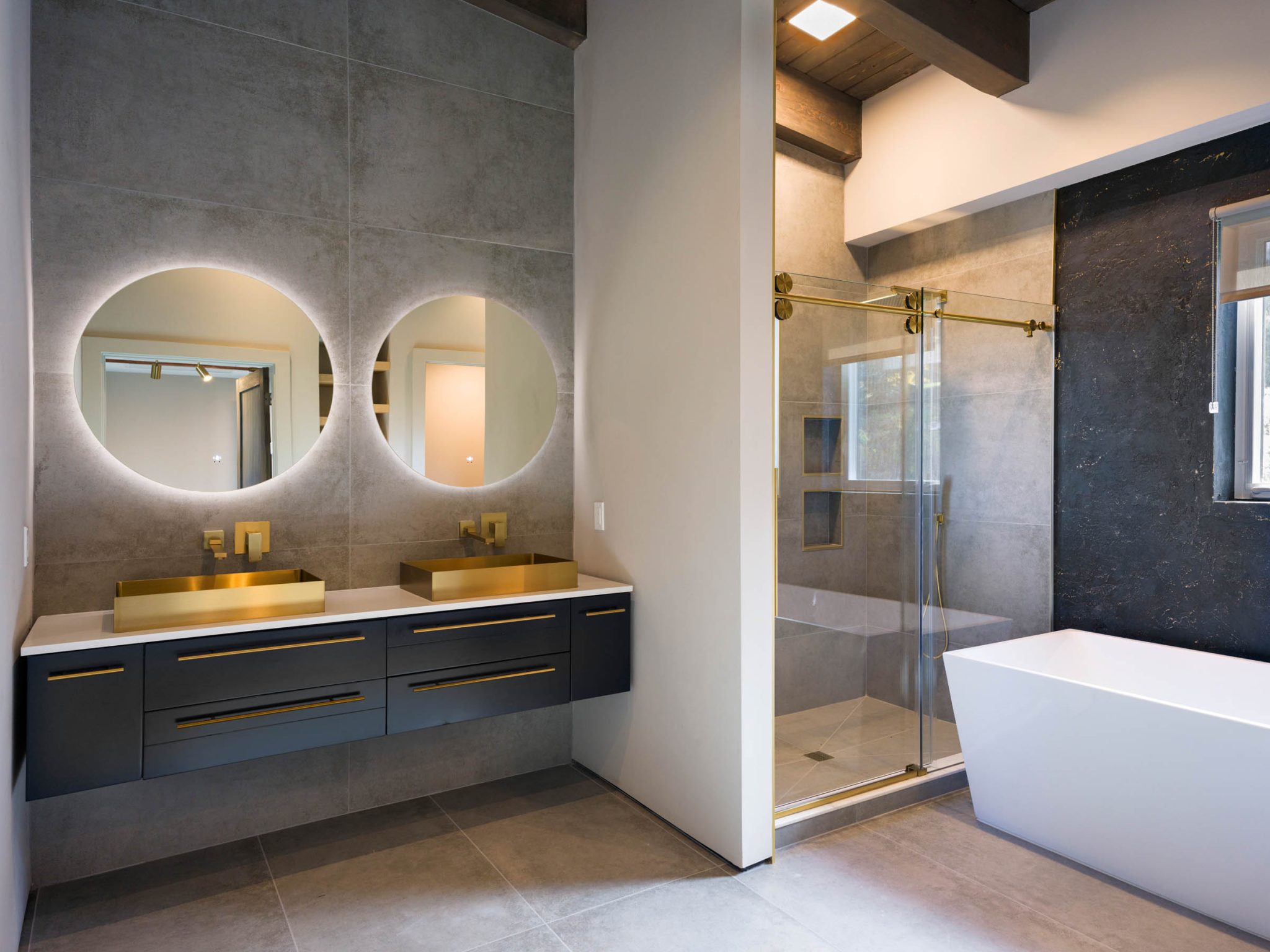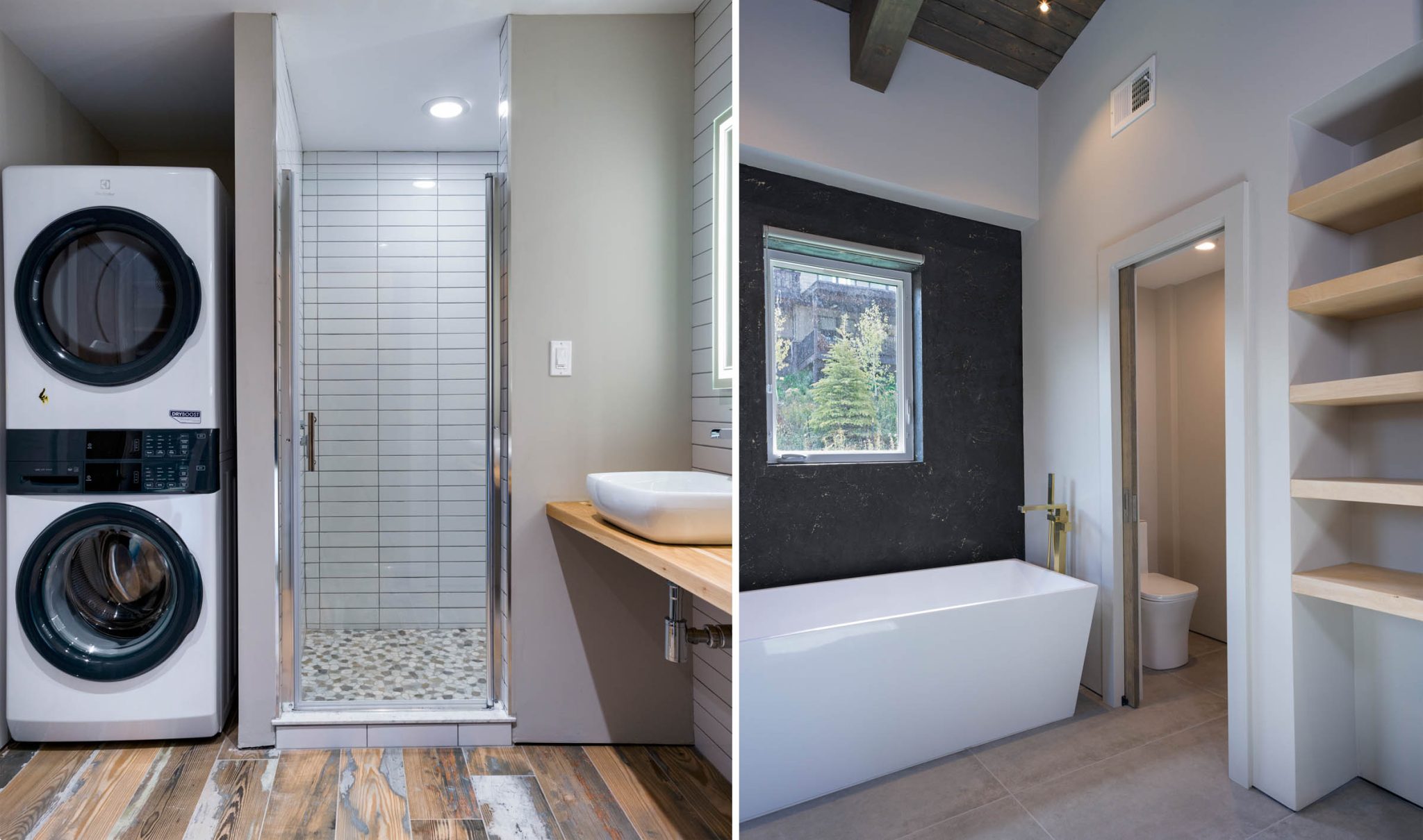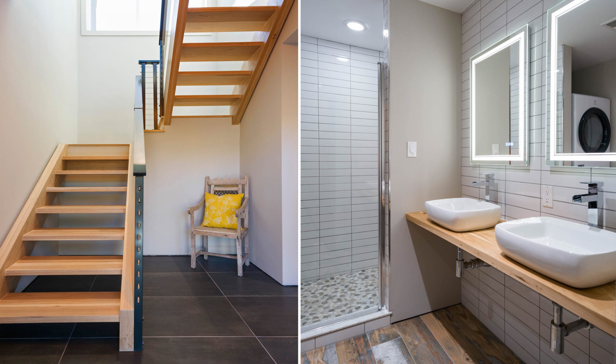 Inside, the home balances function and beauty through spaces tailored to how the family lives. The primary bathroom includes both a soaking tub and a walk-in shower, creating a calming retreat at the end of the day. Sustainability is integral to the design, with a hybrid timber-frame construction system that reduces material waste while providing structural efficiency. Exposed timber posts, beams, rafters, and structural roof decking celebrate the craft of construction and bring warmth, texture, and longevity to the interior spaces.