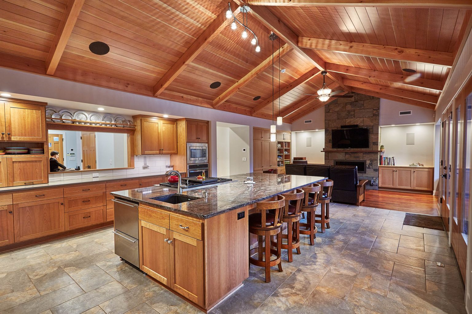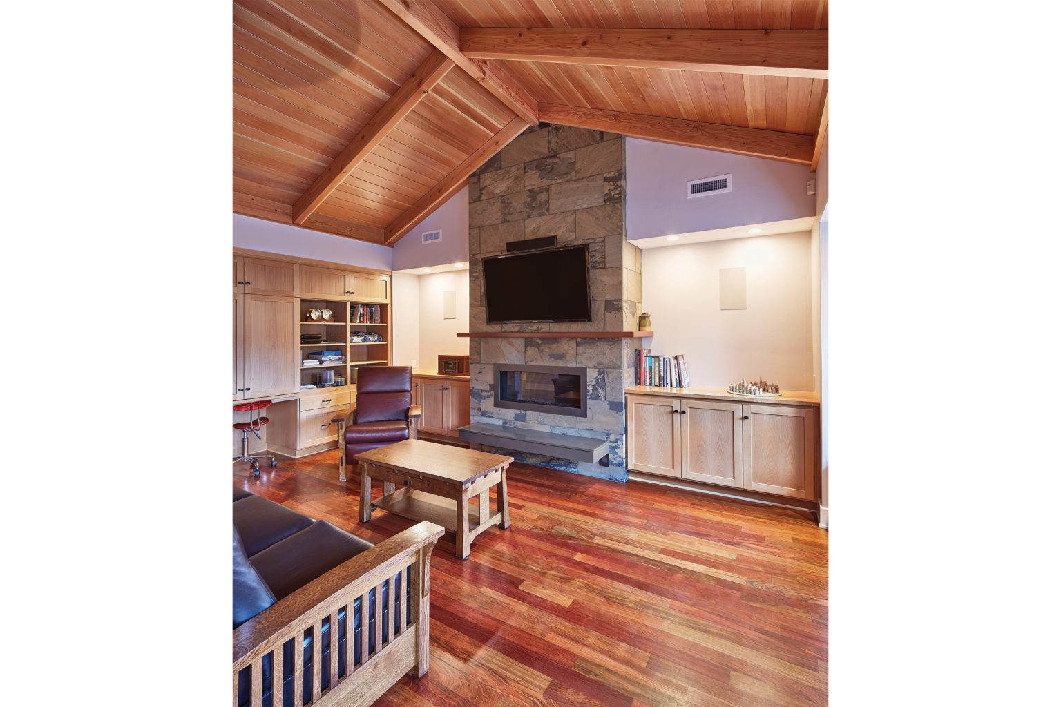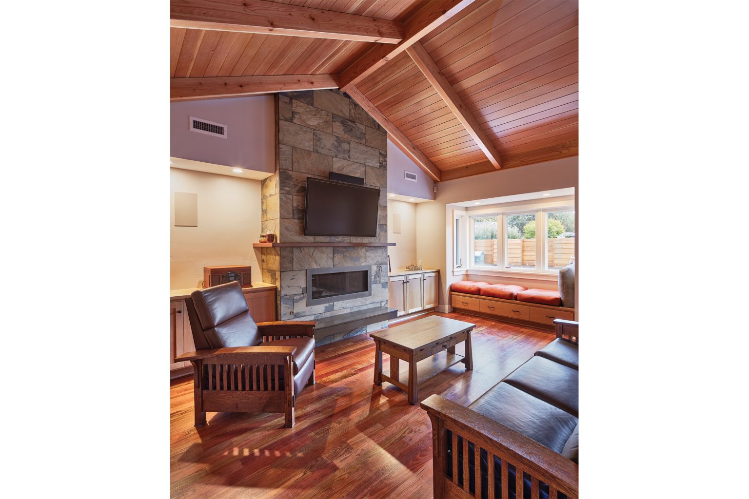 Renovations and additions allow a home to evolve with its owners. This extensive remodel transformed the Cal Young House into a place that balances openness with warmth and seamlessly connects to its setting. The great room serves as the heart of the home, featuring exposed wood and steel structure, custom built-ins, and expansive views of the yard and garden. A light-filled kitchen with finely crafted wood casework extends naturally onto the patio, encouraging outdoor living and dining. The refreshed exterior completes the transformation, giving the home a renewed presence that feels as inviting outside as it does within.