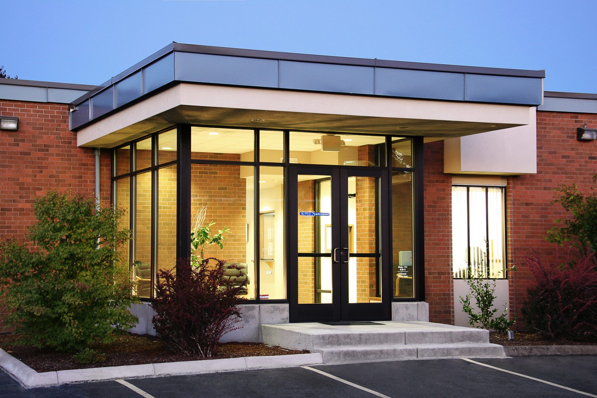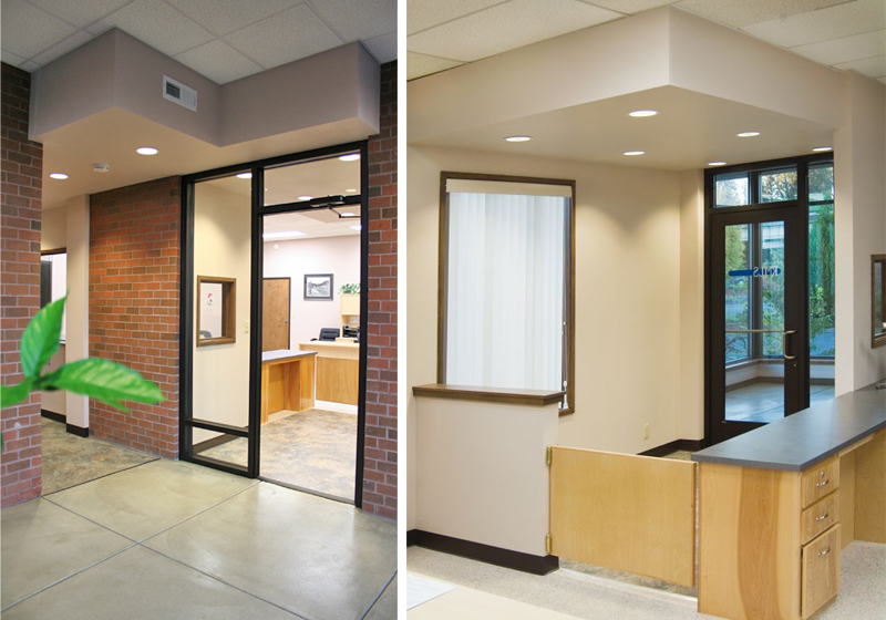 Two new lobbies centered on the east and west façades usher visitors and staff into the building. Conceived as glass cubes, the lobbies push outward into the garden and open onto the central interior hallway. Linking the indoors with the outdoors, the aluminum storefront envelope is topped with flat roofs, which cantilever to shelter the entry doors. The stucco soffits and sheet metal fascia are cued by existing building elements, and fit below the existing roof fascia, expressing the lobbies’ hierarchical import while maintaining human scale and without dominating the building form. These additions update the building’s image, add definition and character, and respect the existing building style.