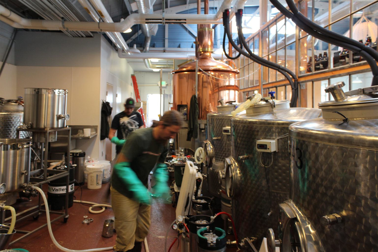 Existing building components and structure are reused and celebrated. The space accommodates a reclaimed brewhouse system and future expansion. High-efficiency systems replace all the outdated mechanical and electrical work. New thermal insulation upgrades the thermal envelope. Ample daylight bathes the space thanks to skylights, oversized windows, and a glazed overhead door. Shade trees and shrubs in new planters replace existing paving.