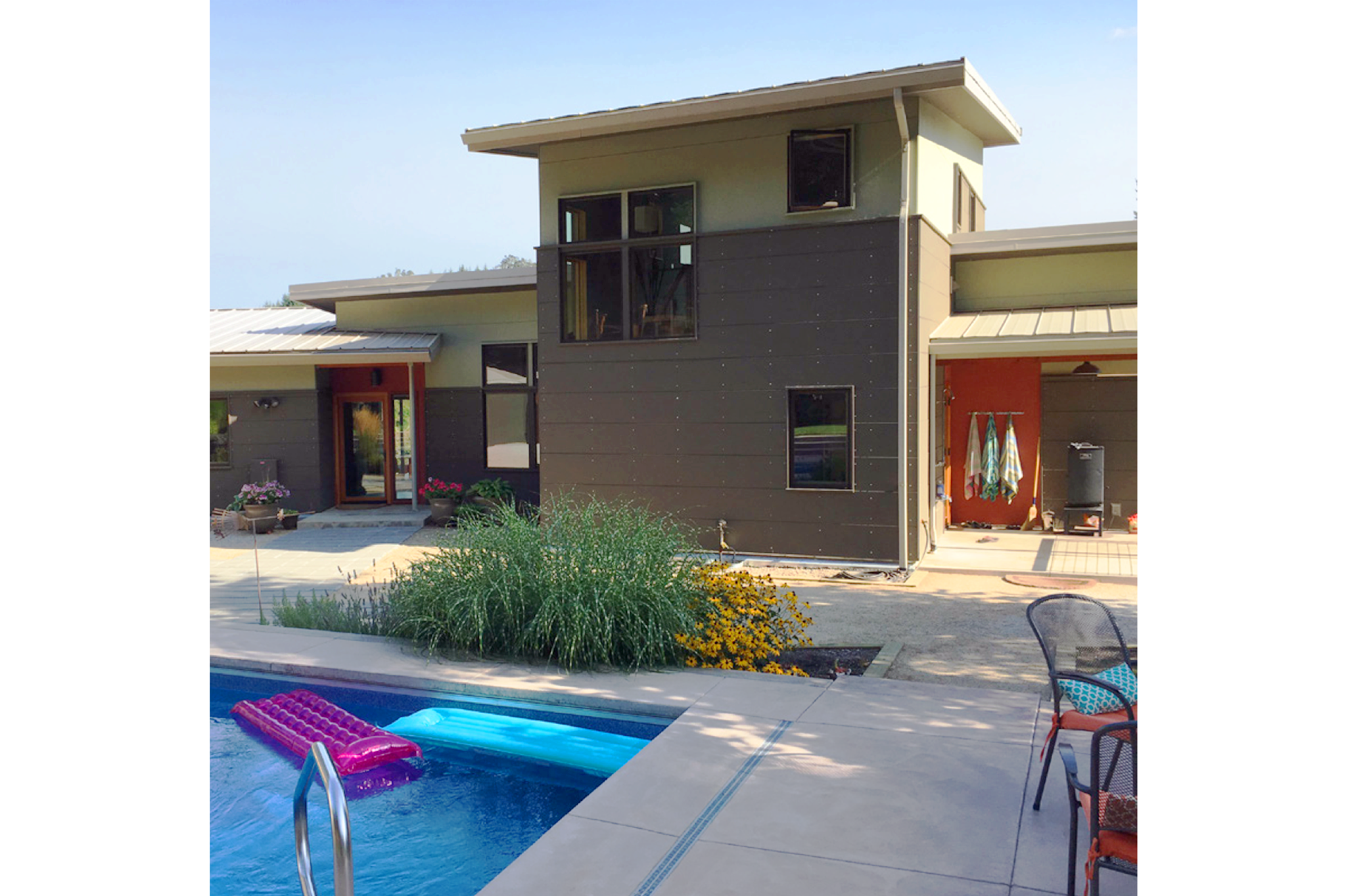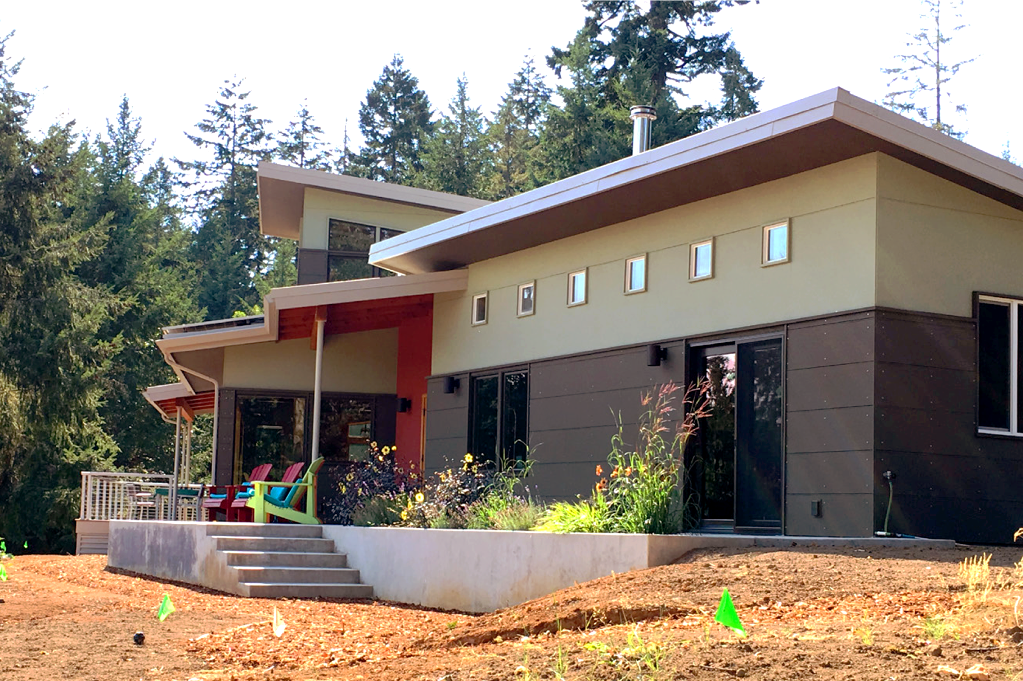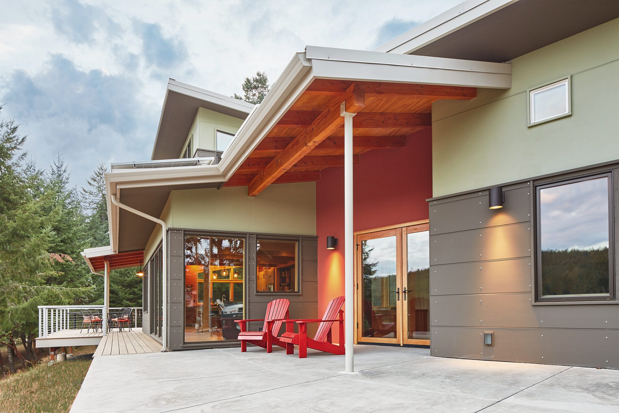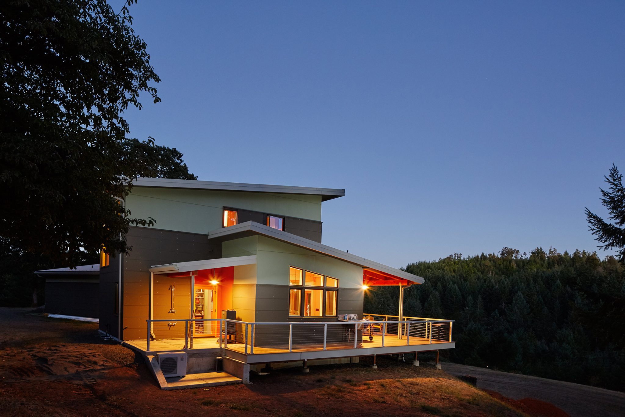 Wrapped in a double-insulated wall, the home is conditioned with a super-efficient heat pump split system. Abundant daylight is provided via windows, doors, clerestories and skylights. The south-facing roof carries a solar PV array, and deep overhangs reduce summer heat gain.