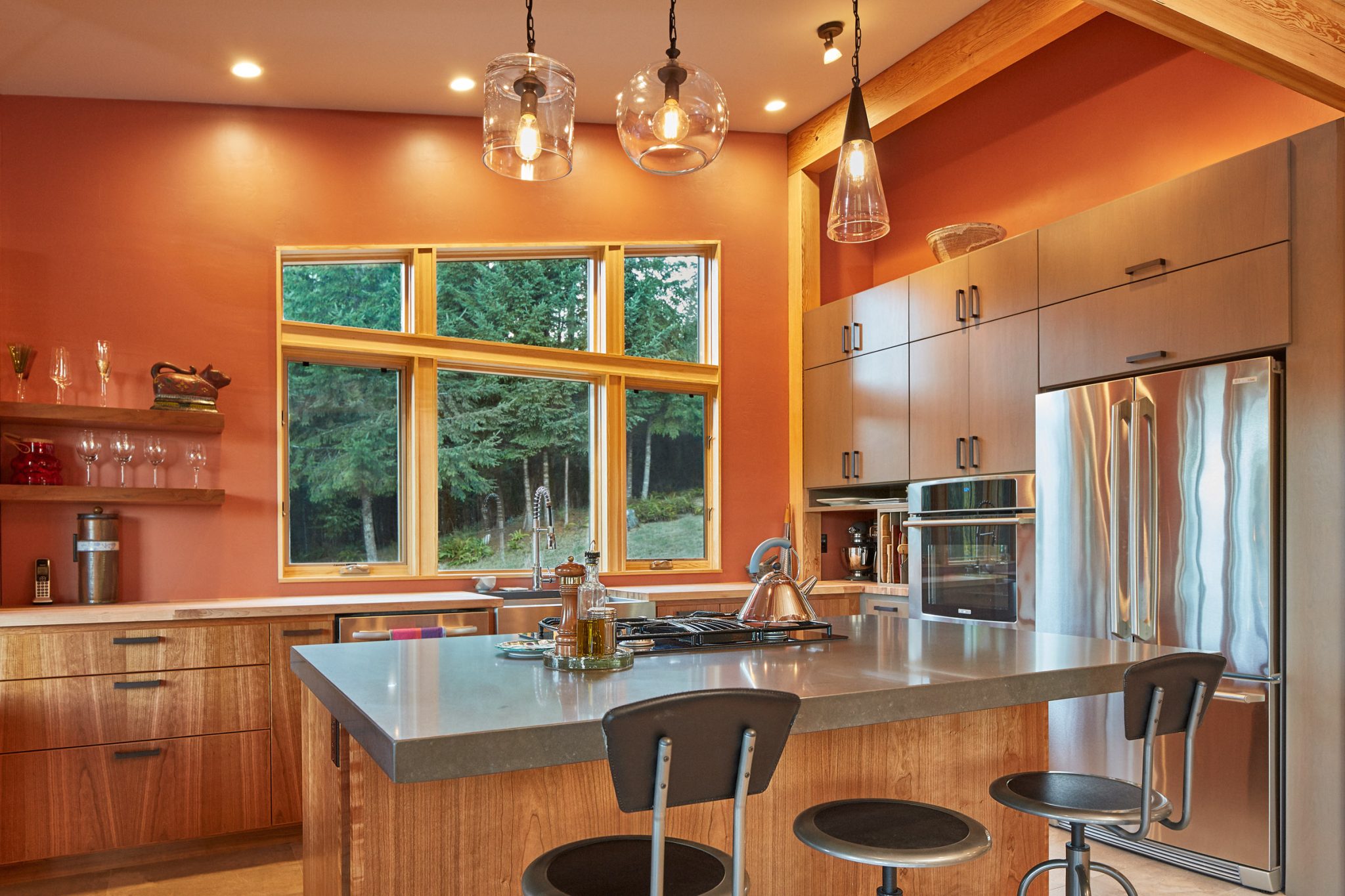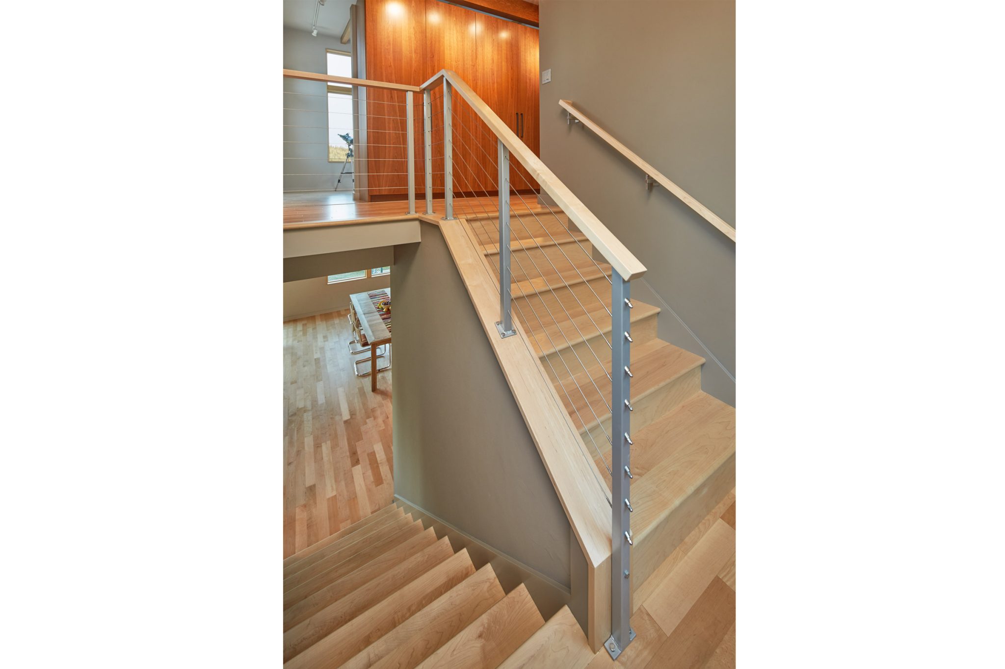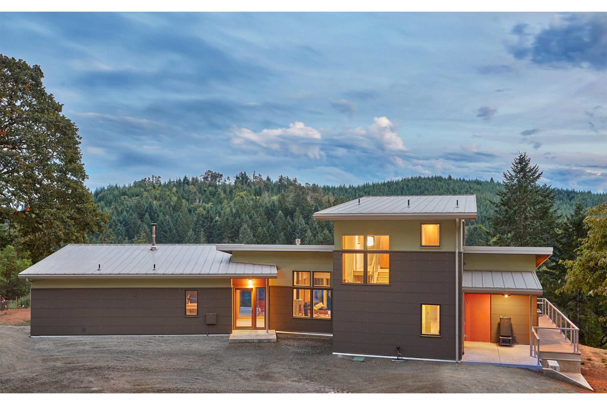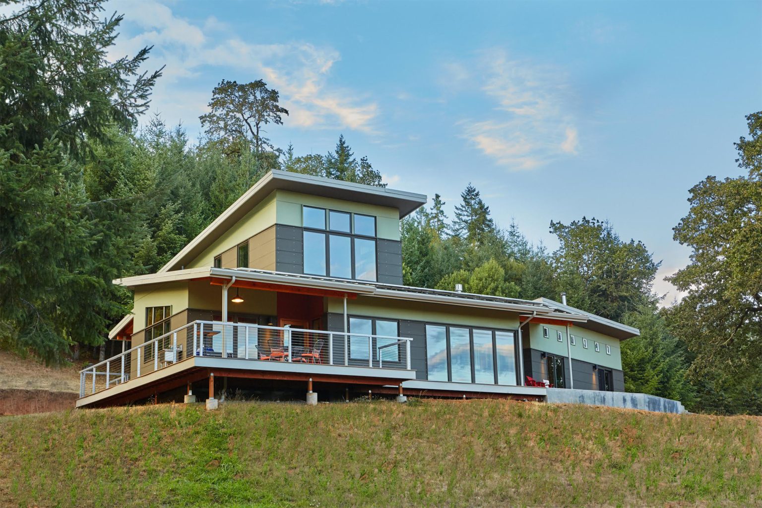 Wrapped in a double-insulated wall, the home is conditioned with a super-efficient heat pump split system. Abundant daylight is provided via windows, doors, clerestories and skylights. The south-facing roof carries a solar PV array, and deep overhangs reduce summer heat gain.