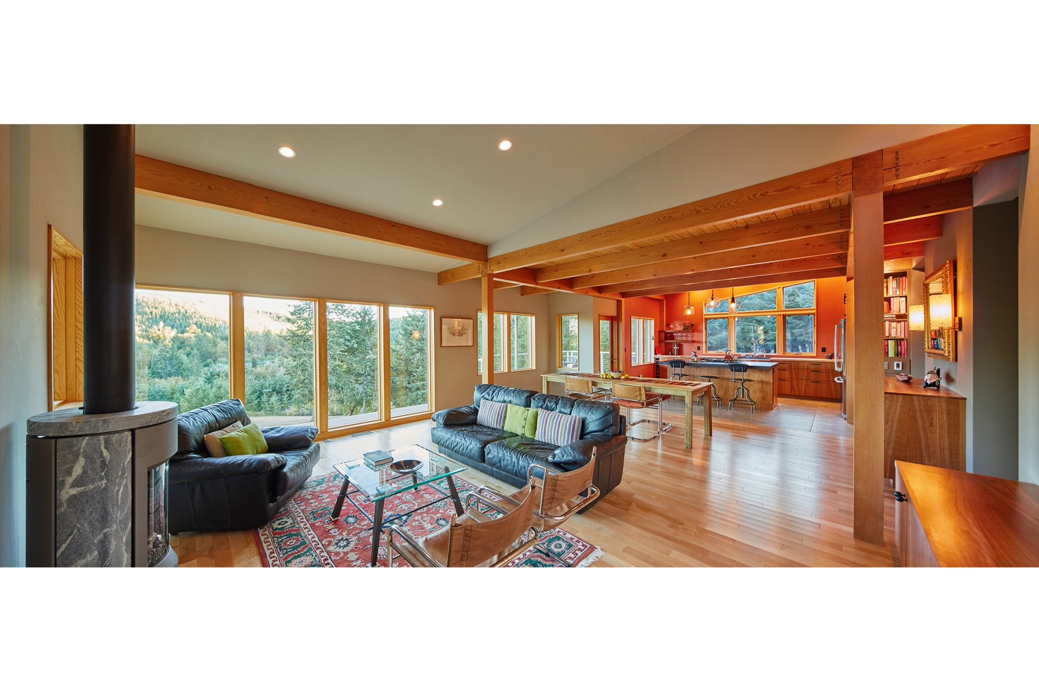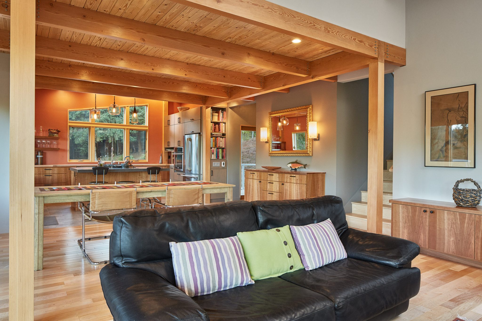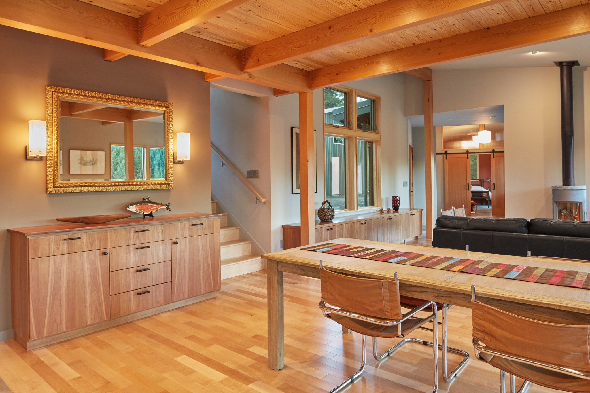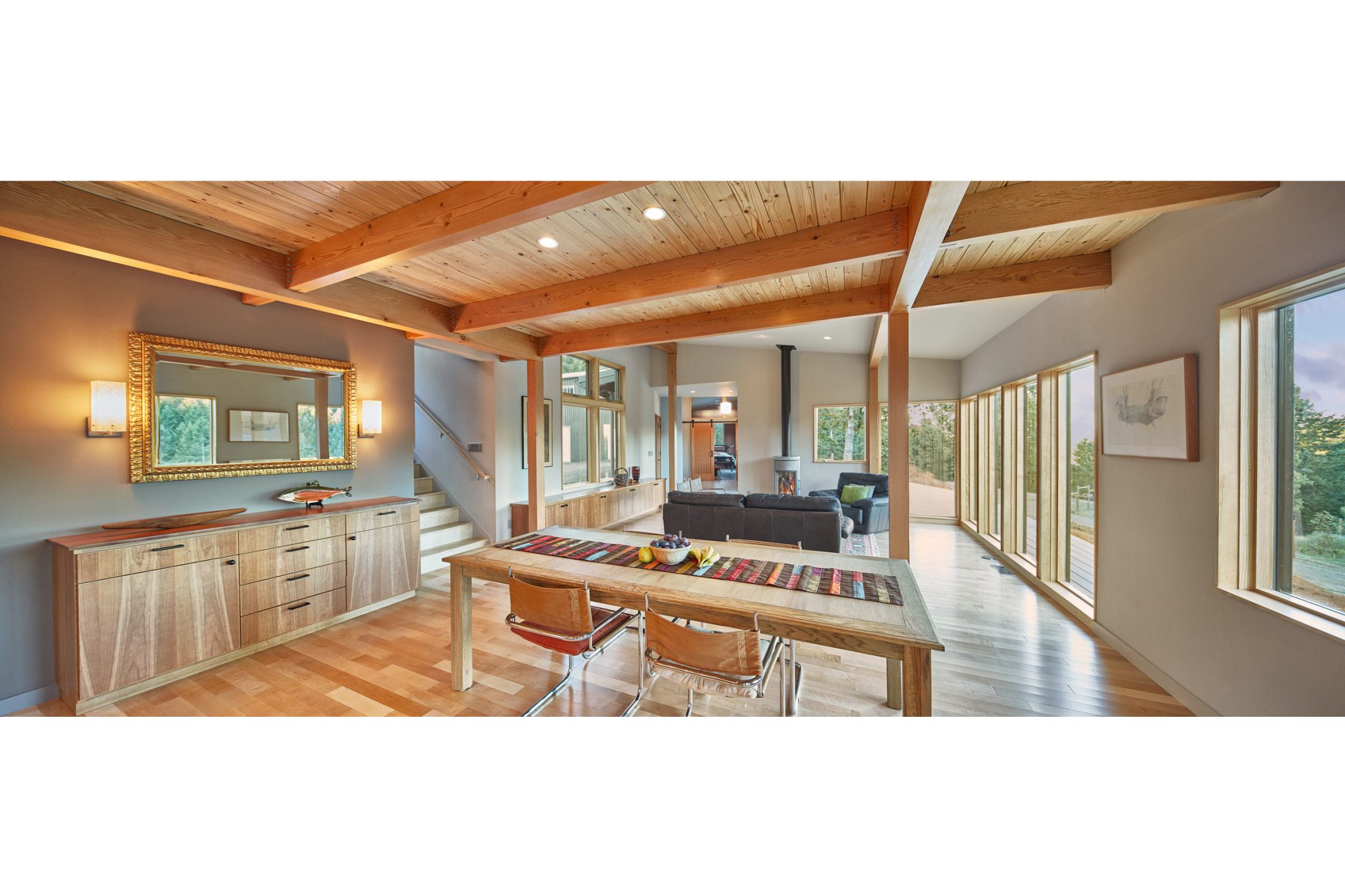 The great room’s lower roof lifts North towards the forested slope above, bringing consistent Northern daylight, while supporting a solar panel array and sheltering expansive, south-facing patios. The dining room’s stout timber-framed ceiling supports the second-floor master suite. Echoing the original cabin’s orientation, the upper roof tilts to the South, reaching up to the sun’s path and to distant views of the Cascades.