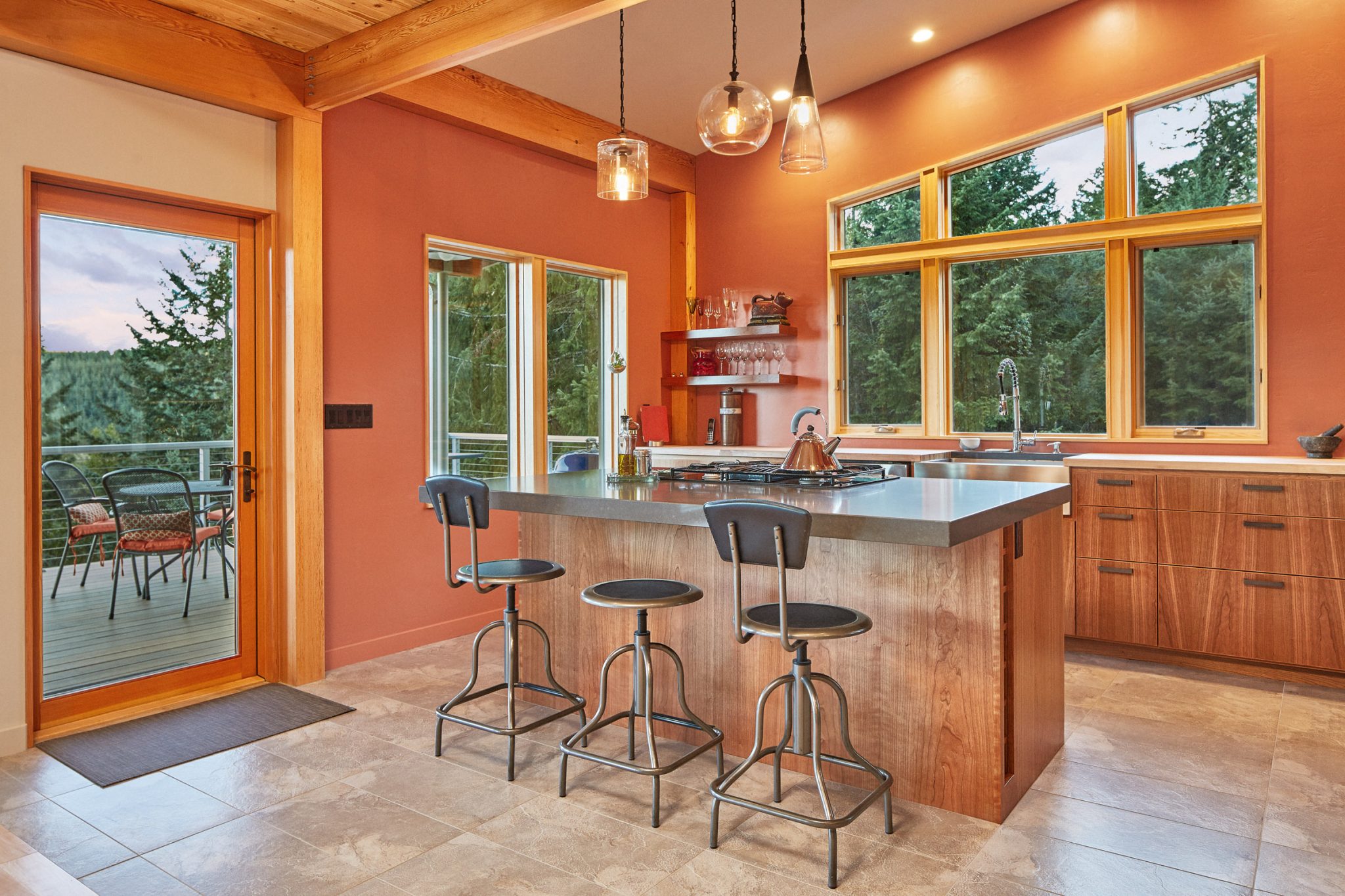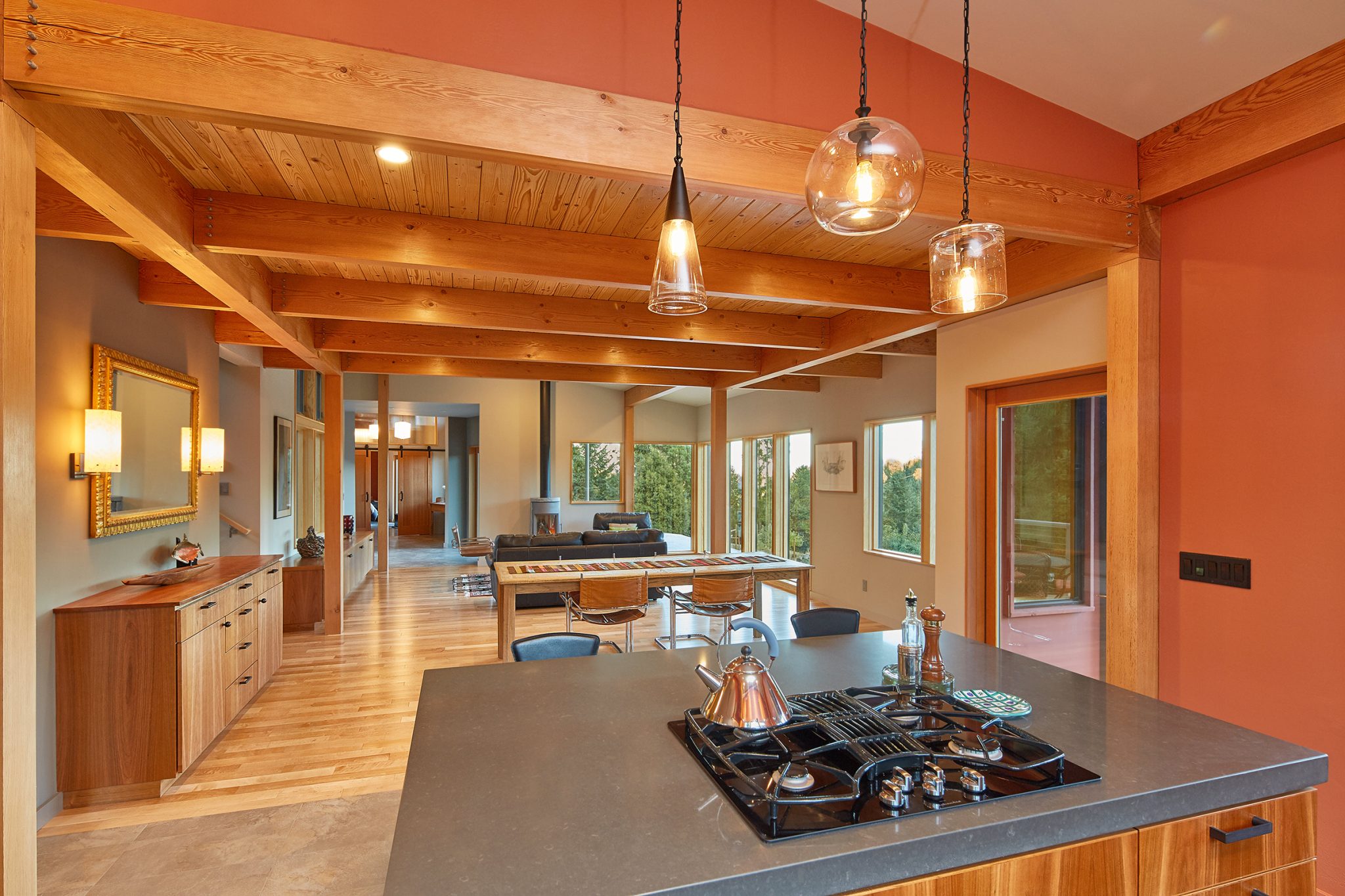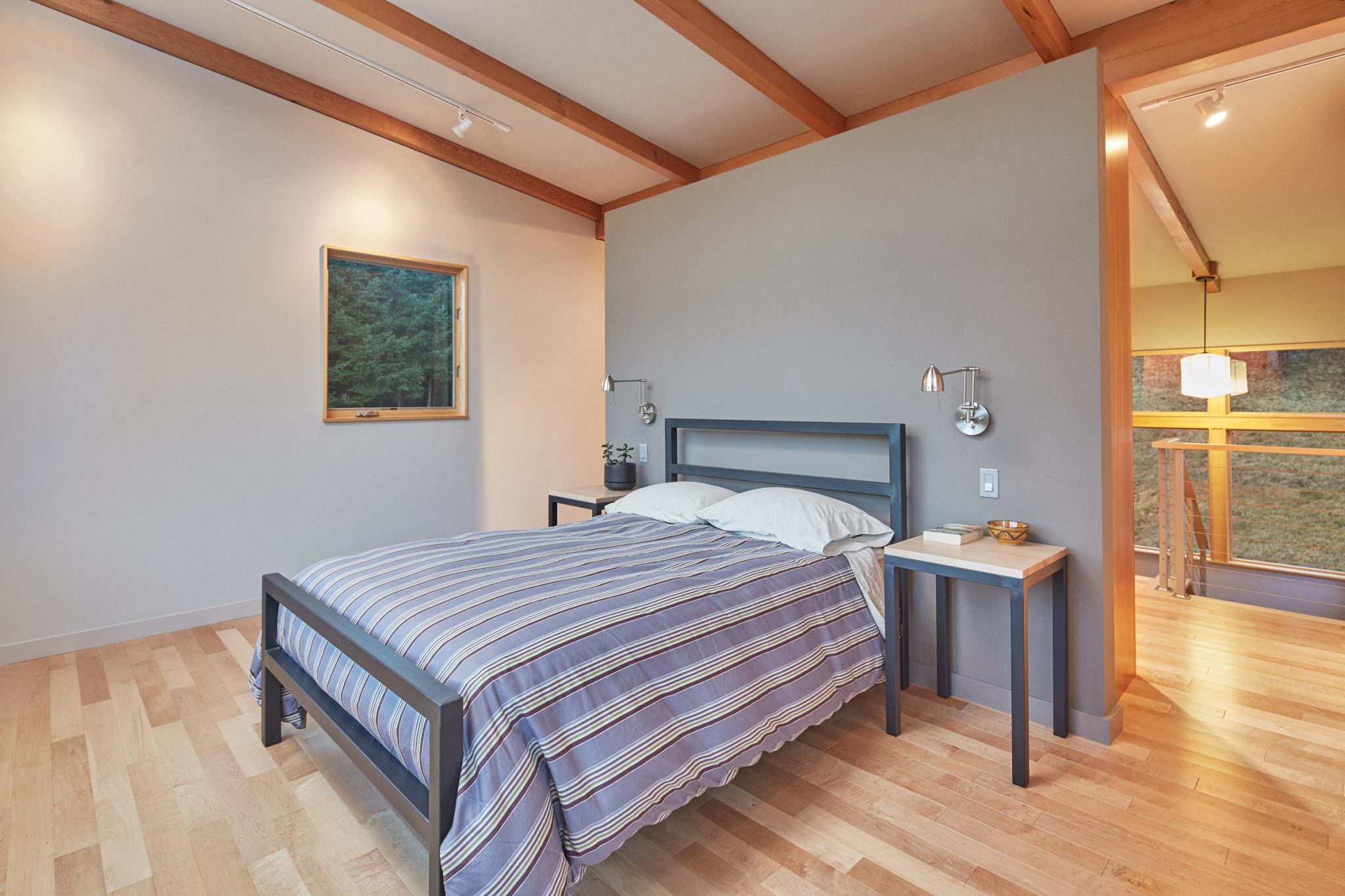 The great room’s lower roof lifts North towards the forested slope above, bringing consistent Northern daylight, while supporting a solar panel array and sheltering expansive, south-facing patios. The dining room’s stout timber-framed ceiling supports the second-floor master suite. Echoing the original cabin’s orientation, the upper roof tilts to the South, reaching up to the sun’s path and to distant views of the Cascades.