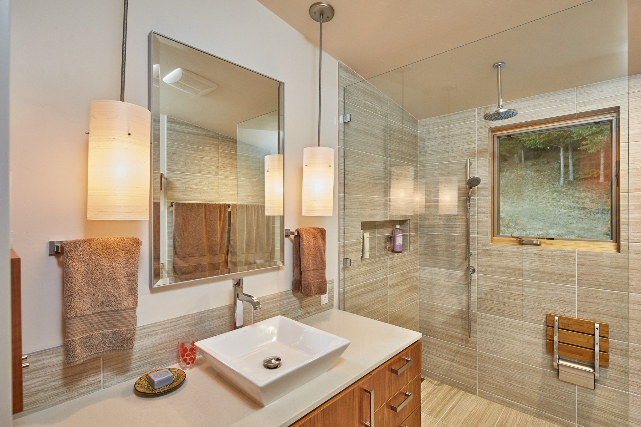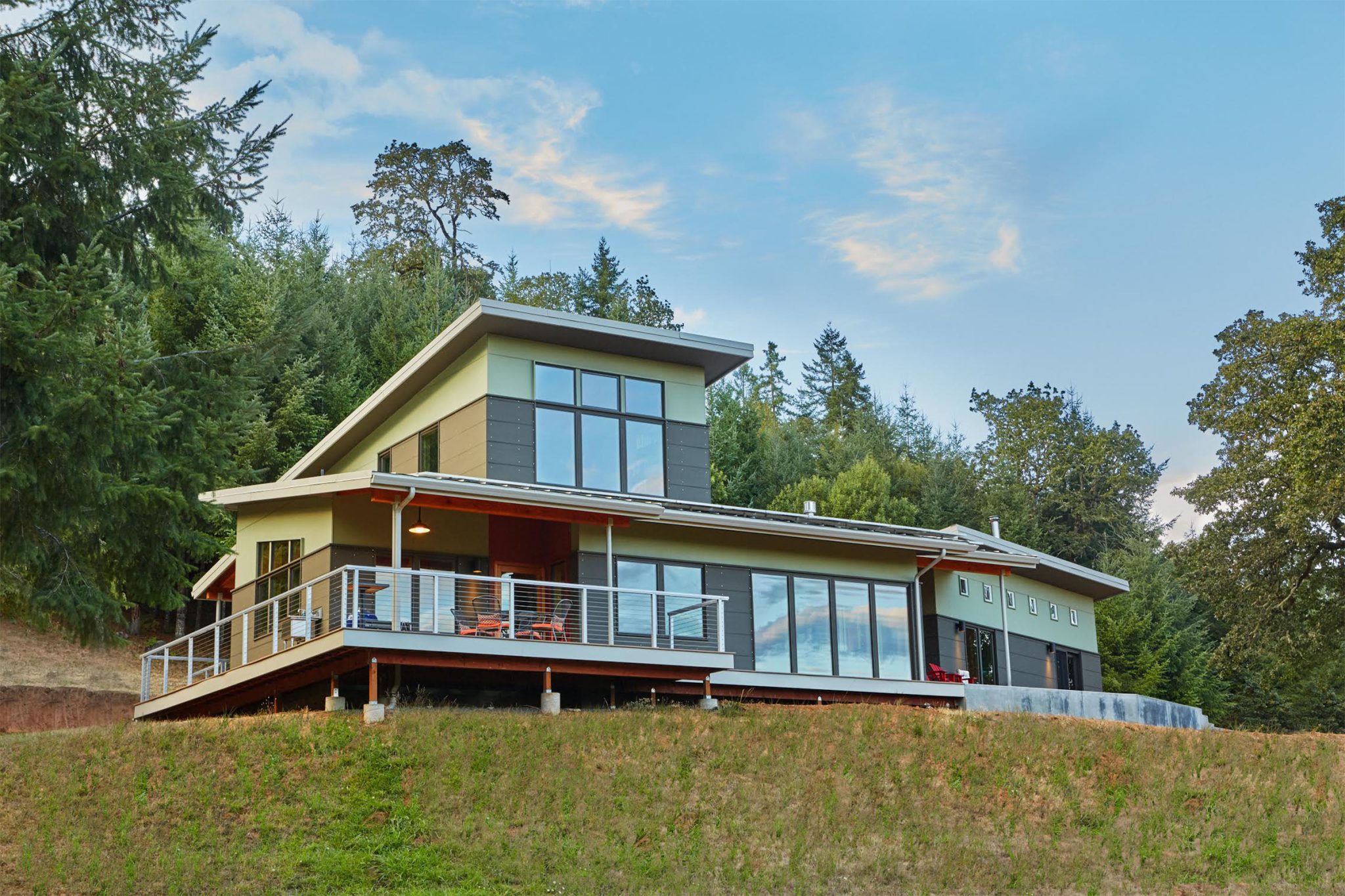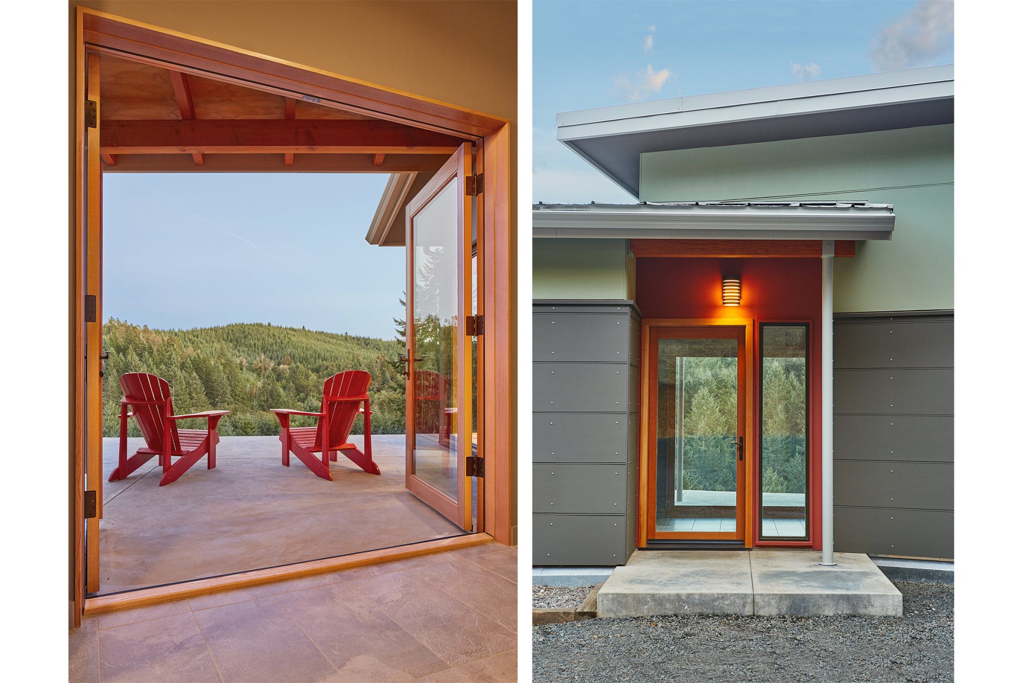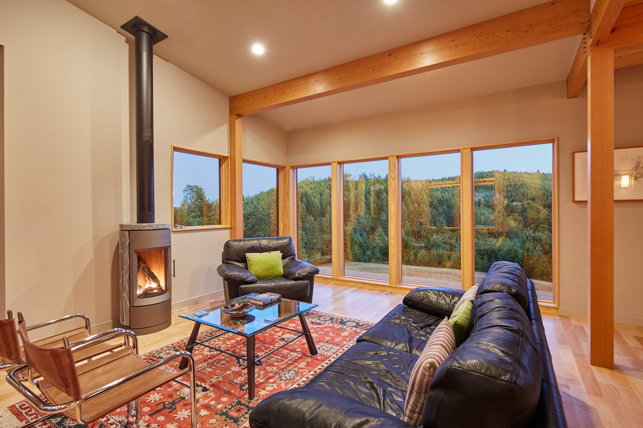 The great room’s lower roof lifts North towards the forested slope above, bringing consistent Northern daylight, while supporting a solar panel array and sheltering expansive, south-facing patios. The dining room’s stout timber-framed ceiling supports the second-floor master suite. Echoing the original cabin’s orientation, the upper roof tilts to the South, reaching up to the sun’s path and to distant views of the Cascades.