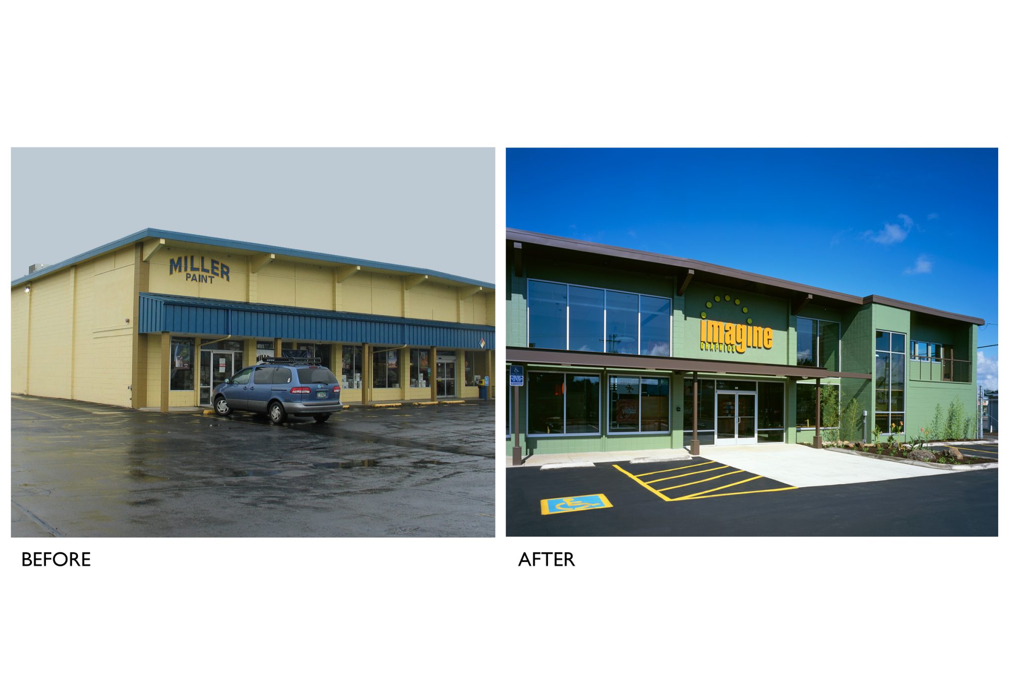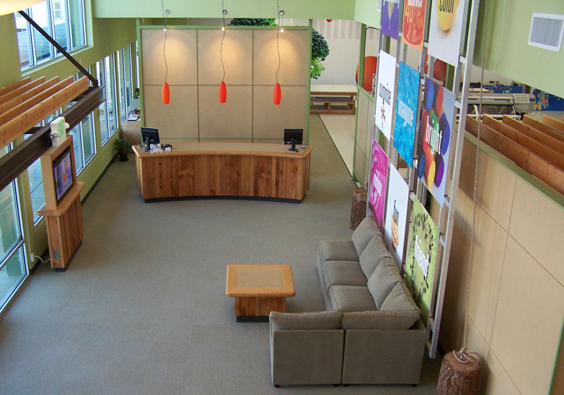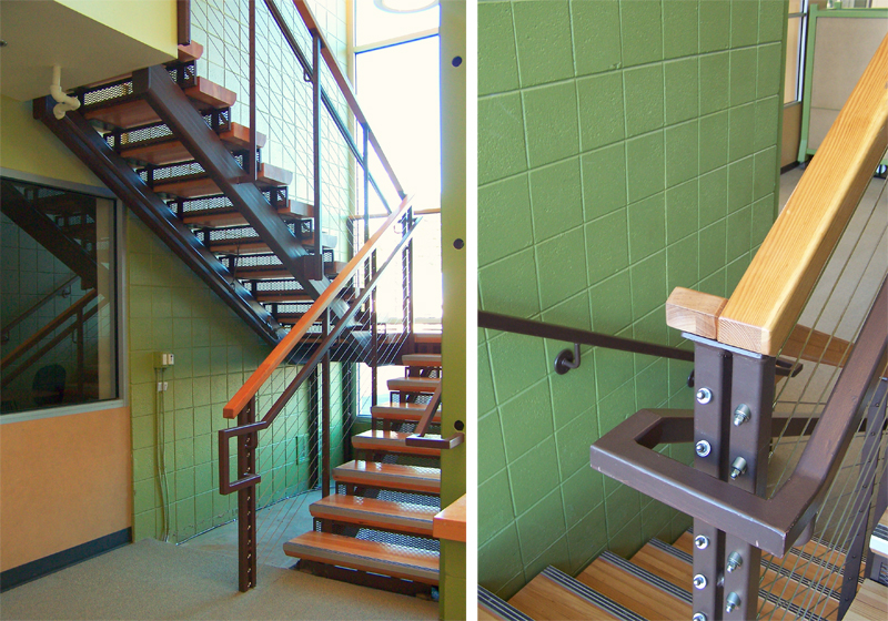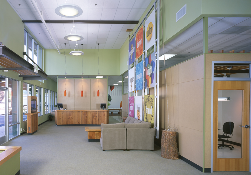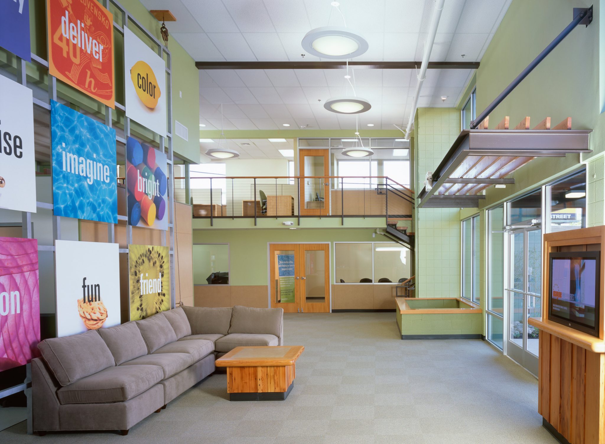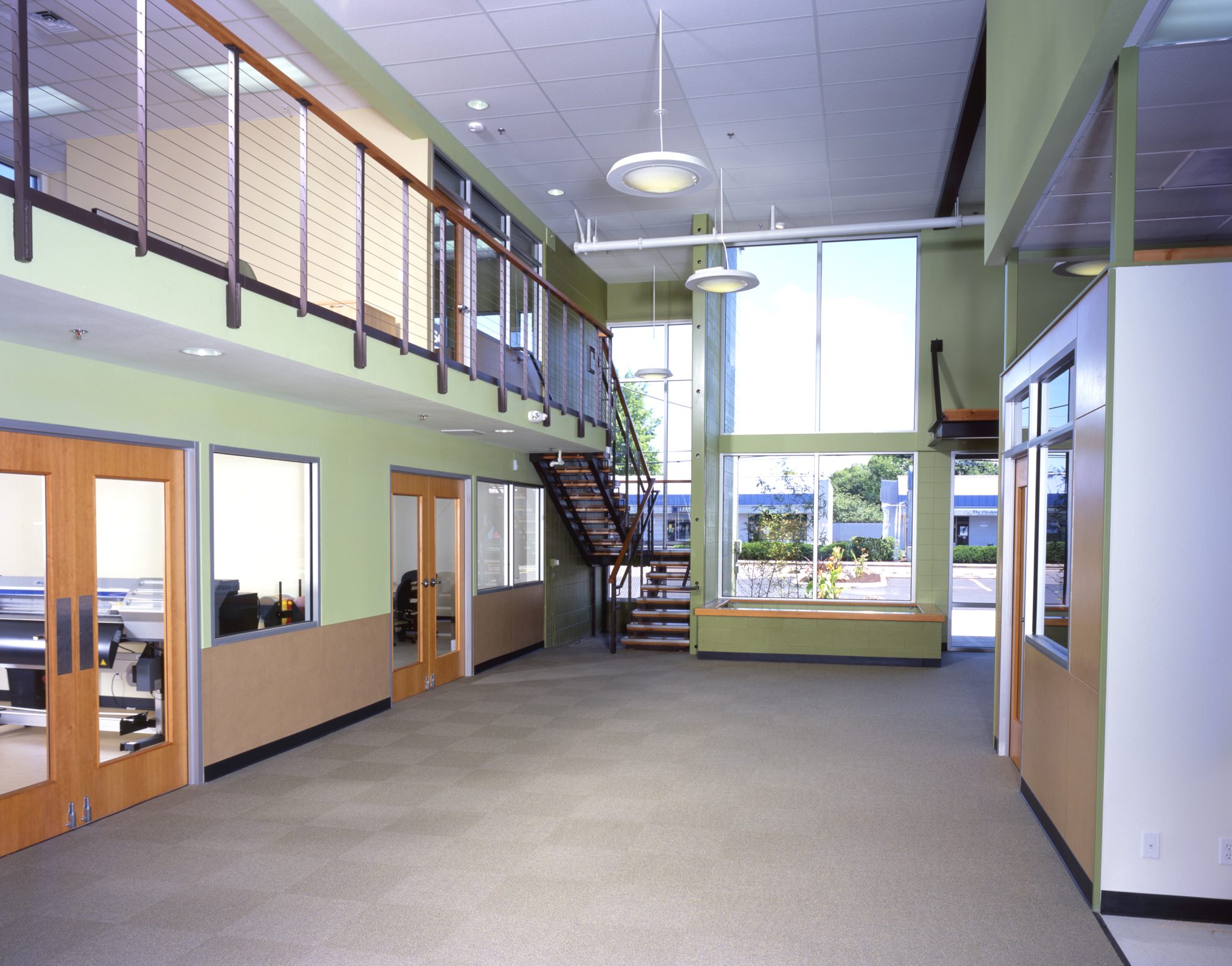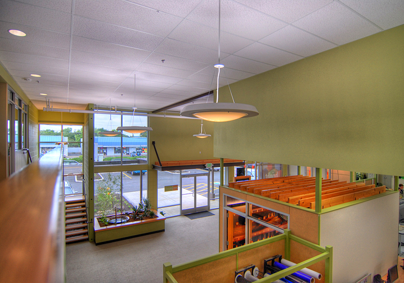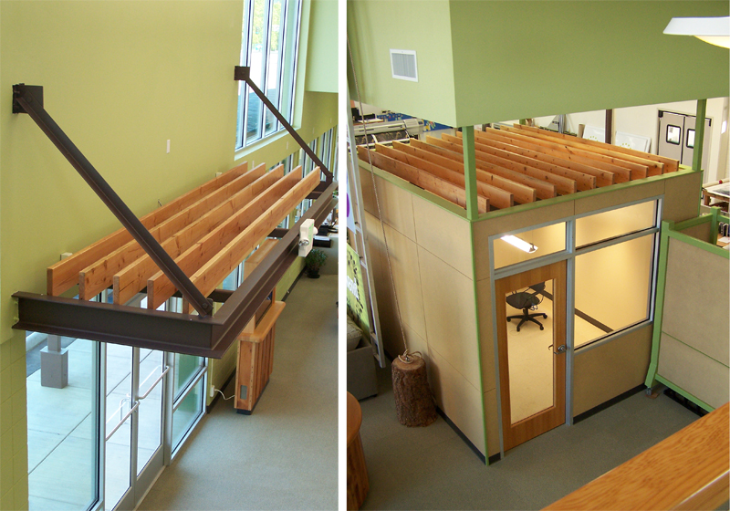 New clerestory windows minimize the need for artificial lighting, while the canopy and deep roof overhangs provide summer shading. Light fixtures are controlled with daylight zoning and motion-sensors. Interior casework, trim, and railings are made of reclaimed Doug-Fir boards, sustainable FSC-certified lumber, and straw-board. Natural linoleum and replaceable carpet tiles comprise the flooring.