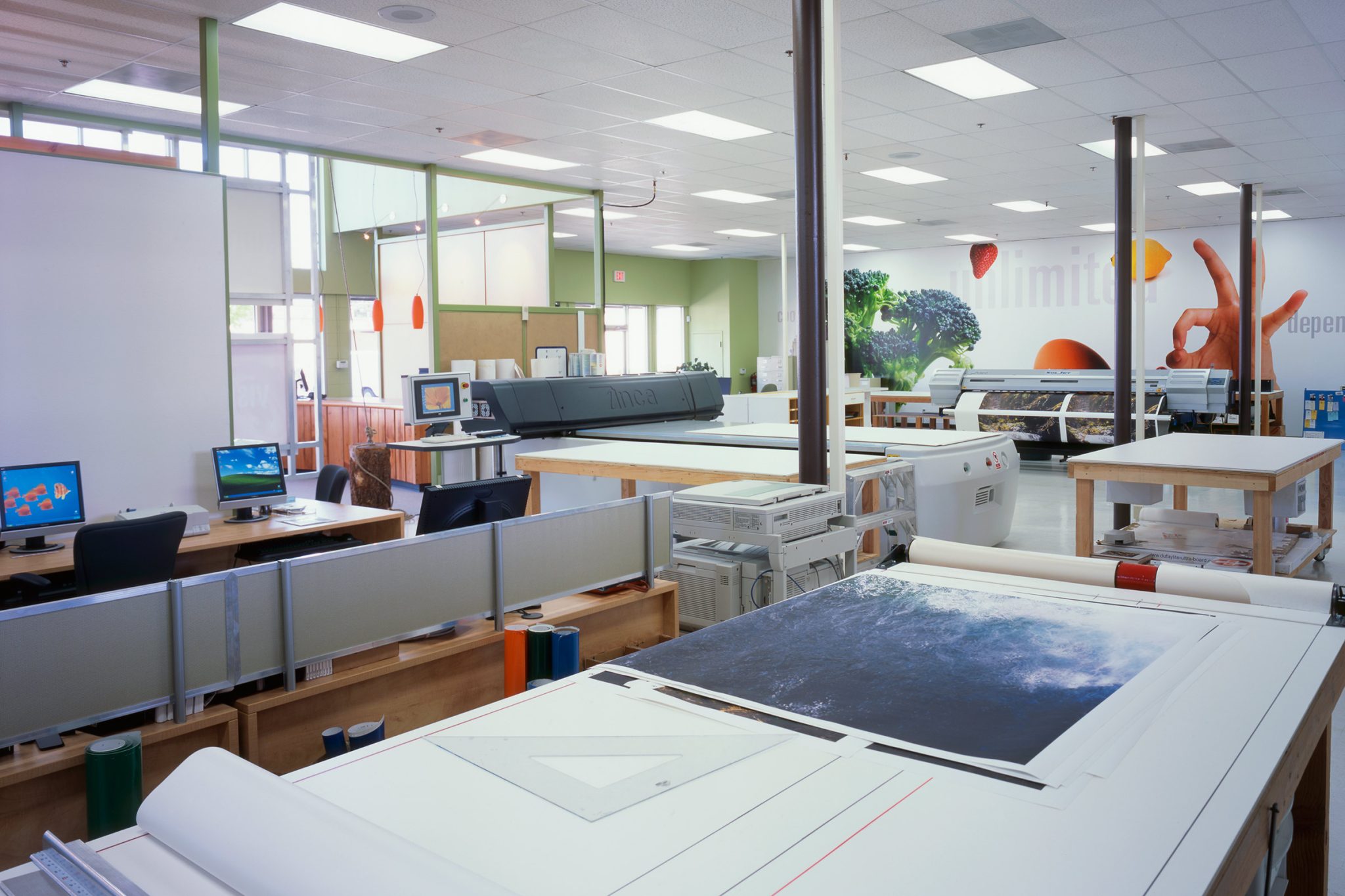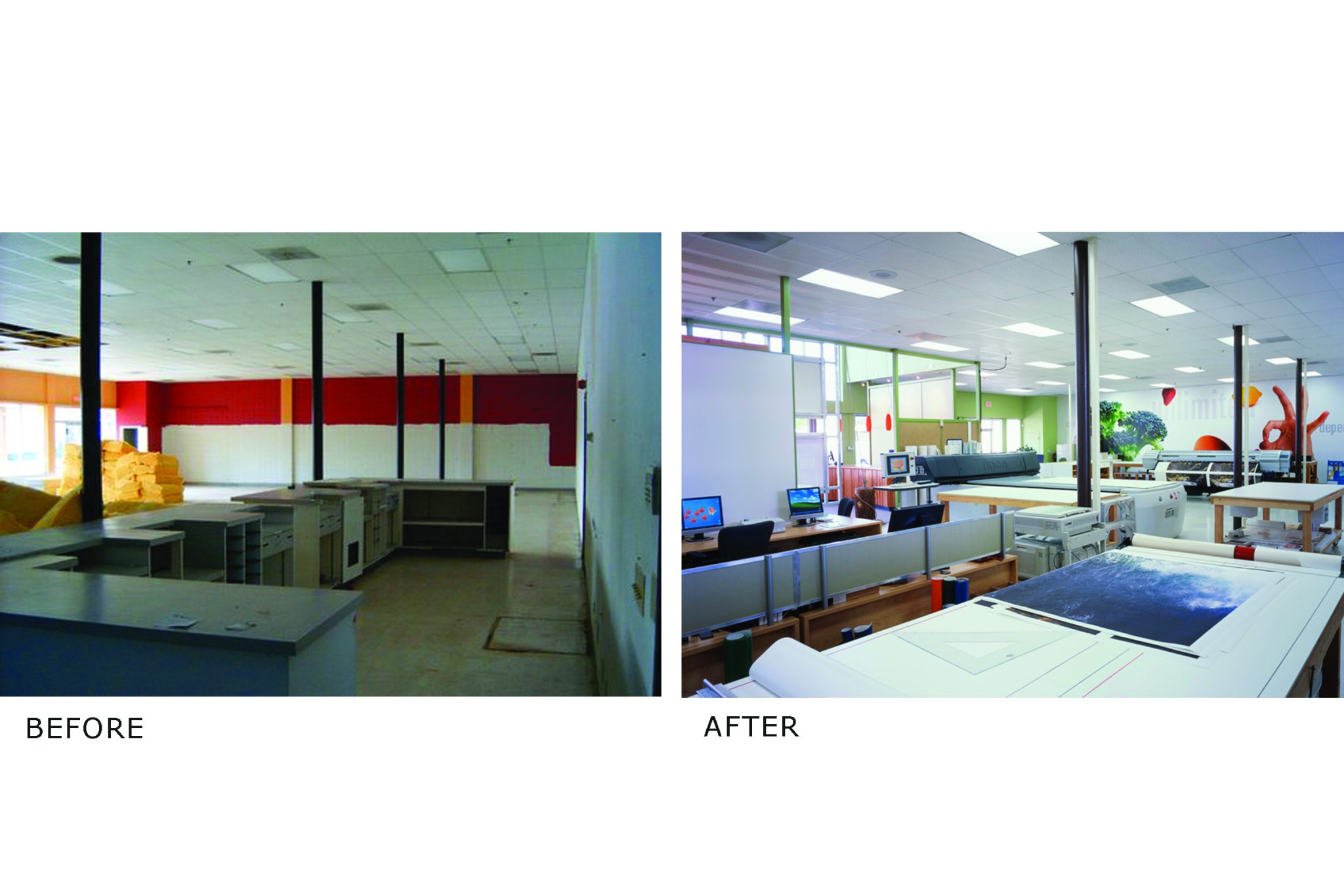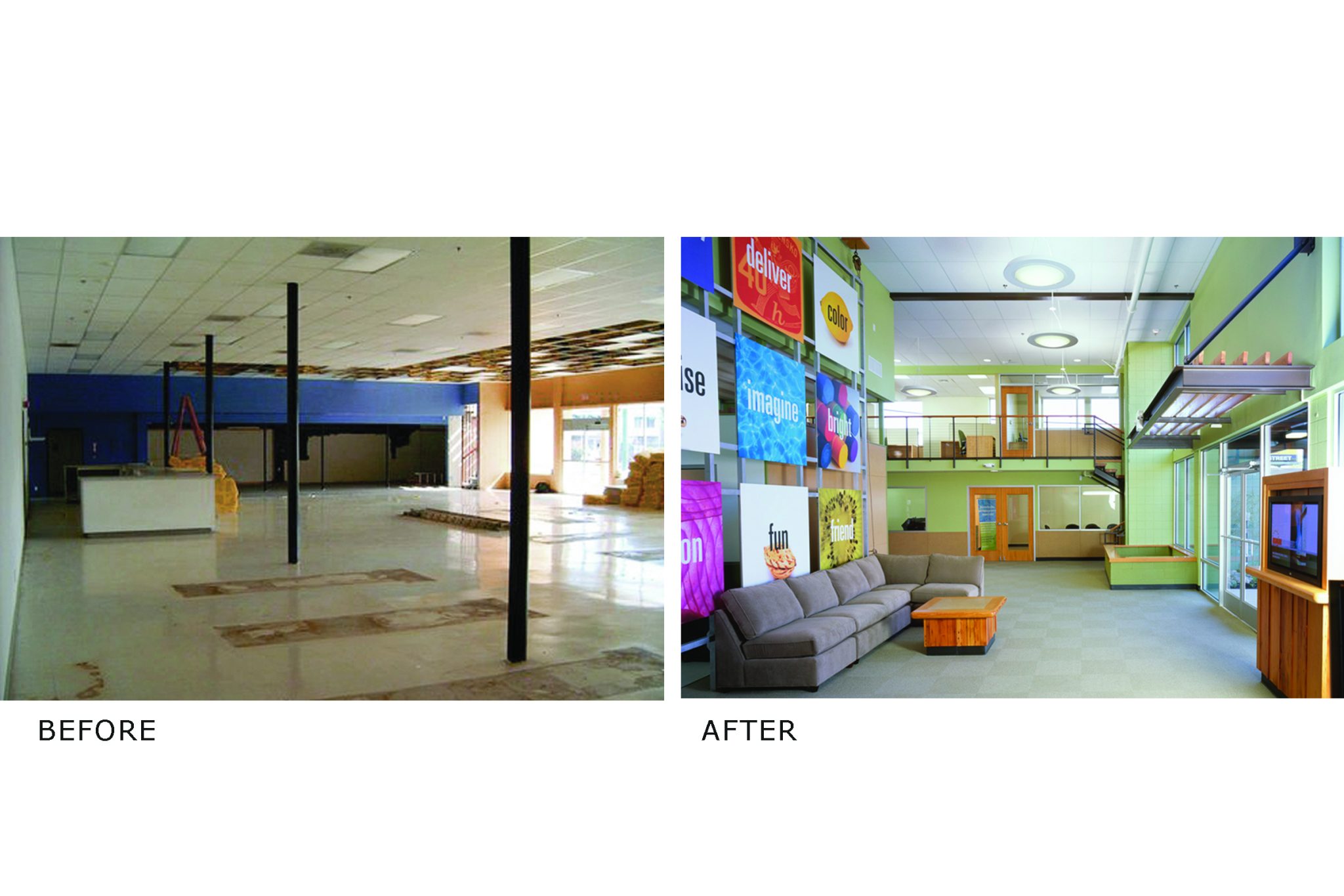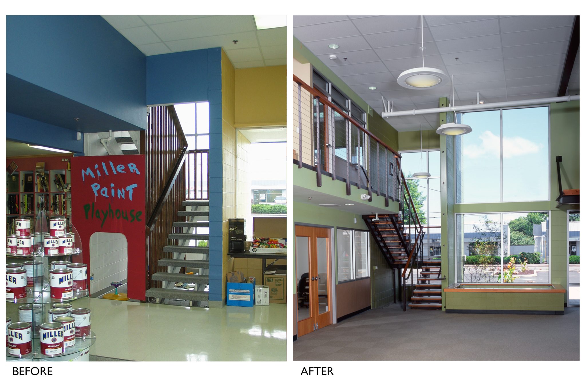 A new delicate structural steel colonnade buffers the building façade from the parking lot and marks the sheltered entryway. Inside, a section of the original low ceiling was raised, exposing roof beams and allowing new clerestory windows to illuminate the sales area. The new double-height building hub horizontally links the sales area and the outdoor garden, stairs, conference and production areas, while opening the office mezzanine to the floor below. Architectural materials such as wood, steel, concrete block and aluminum remain un-treated and express their distinct nature in form, texture, and color.
