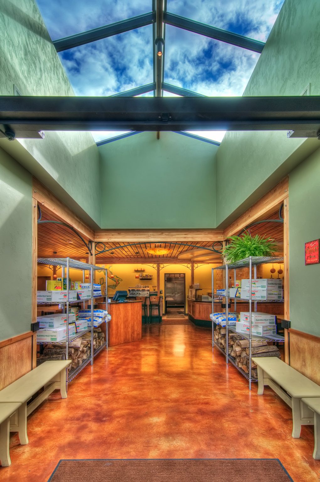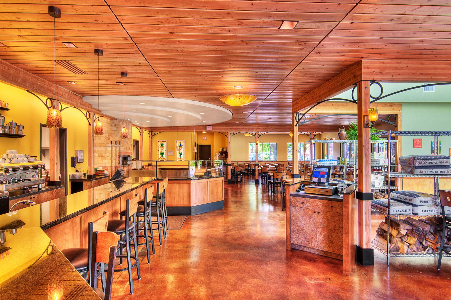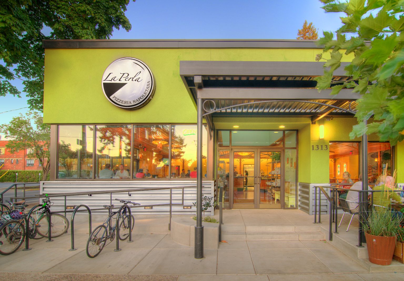 Transforming this aging yet familiar western-style ice cream parlor into a unique, iconic and authentic Neapolitan Pizzeria involved numerous changes inside and out. A transparent ‘film’ of tall windows wraps the building corner, engaging the outdoor bustle with the celebratory energy within. A steel colonnade shelters outdoor seating and marks the entrance. Inside, the entryway opens onto expansive seating areas, the wine and espresso bar, and the pizza baking area fronting a massive wood-fired oven. Old Italy is infused into this contemporary Northwest building via subtle interpretive gestures: an ordered indoor-outdoor grid of columns, a sky-lit gabled atrium, decorative steel arches, and a rich palette of textures and earthy colors. Construction materials are left partially undressed in a contemporary composition of concrete, stone, wood, steel, plaster, and sparkling colored glass.