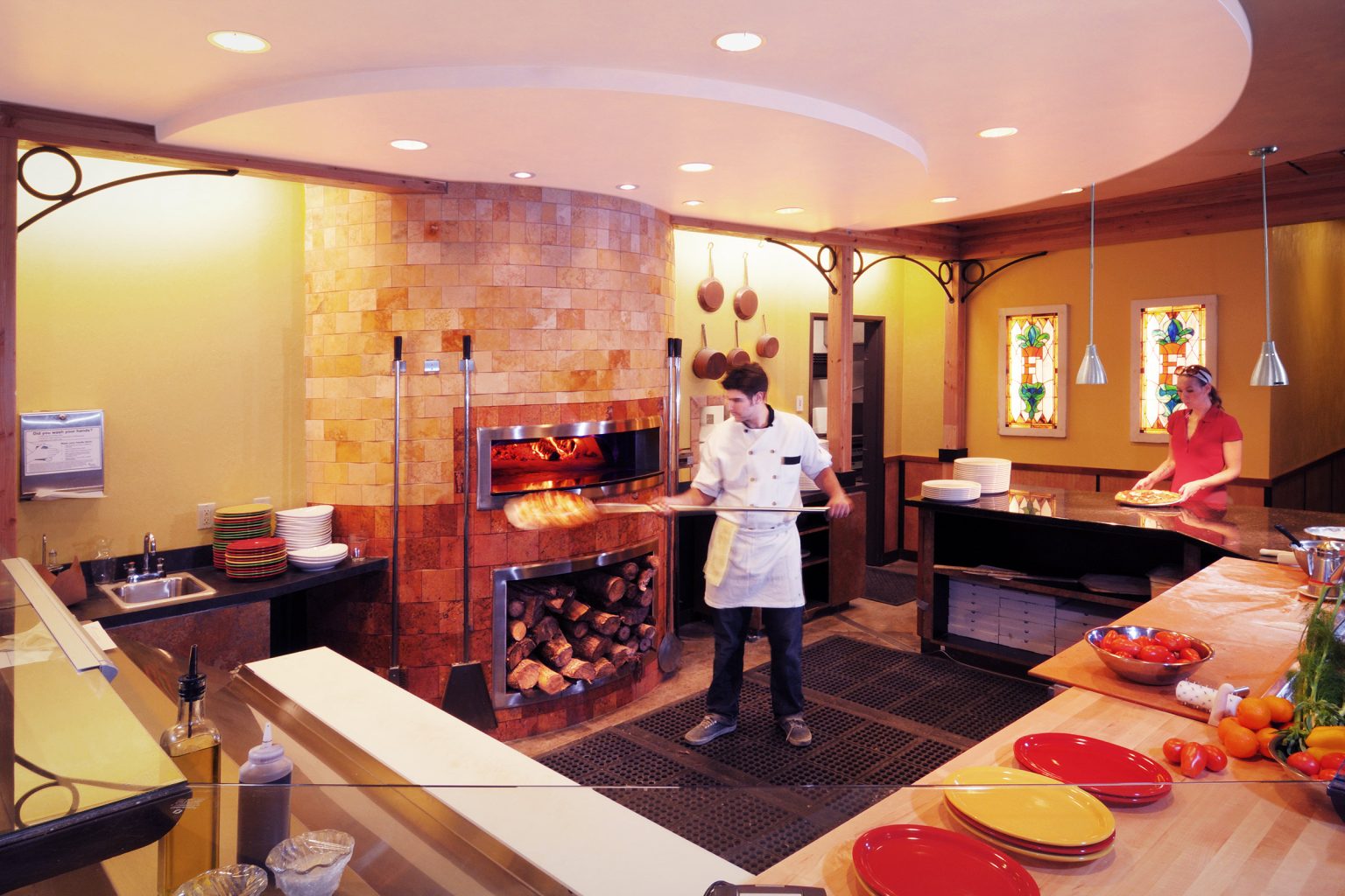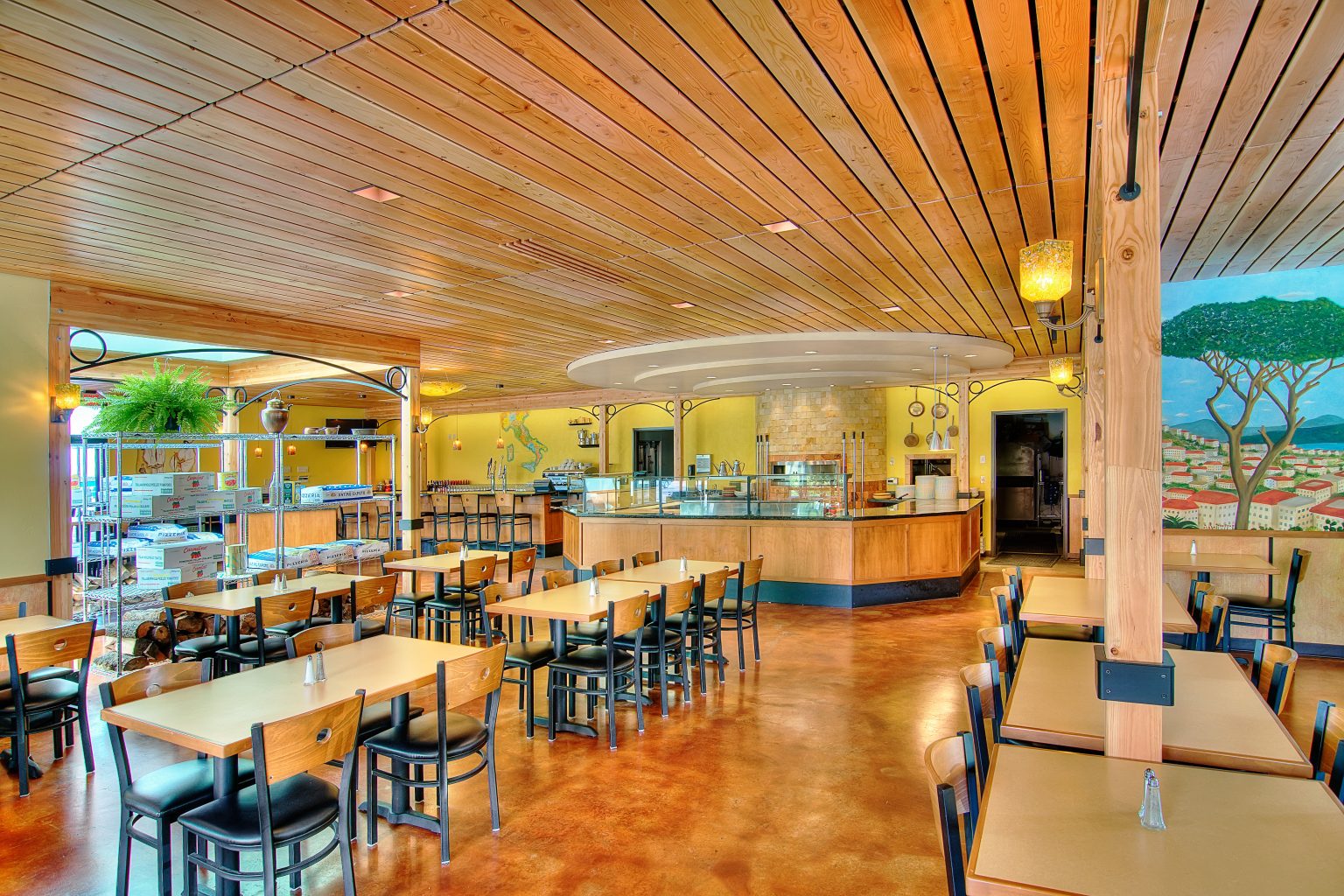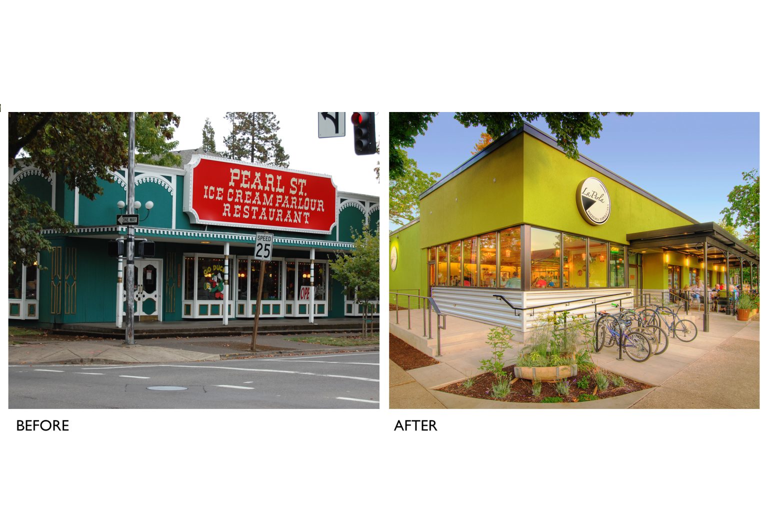 Transforming this aging yet familiar western-style ice cream parlor into a unique, iconic and authentic Neapolitan Pizzeria involved numerous changes inside and out. A transparent ‘film’ of tall windows wraps the building corner, engaging the outdoor bustle with the celebratory energy within. A steel colonnade shelters outdoor seating and marks the entrance. Inside, the entryway opens onto expansive seating areas, the wine and espresso bar, and the pizza baking area fronting a massive wood-fired oven. Old Italy is infused into this contemporary Northwest building via subtle interpretive gestures: an ordered indoor-outdoor grid of columns, a sky-lit gabled atrium, decorative steel arches, and a rich palette of textures and earthy colors. Construction materials are left partially undressed in a contemporary composition of concrete, stone, wood, steel, plaster, and sparkling colored glass.
