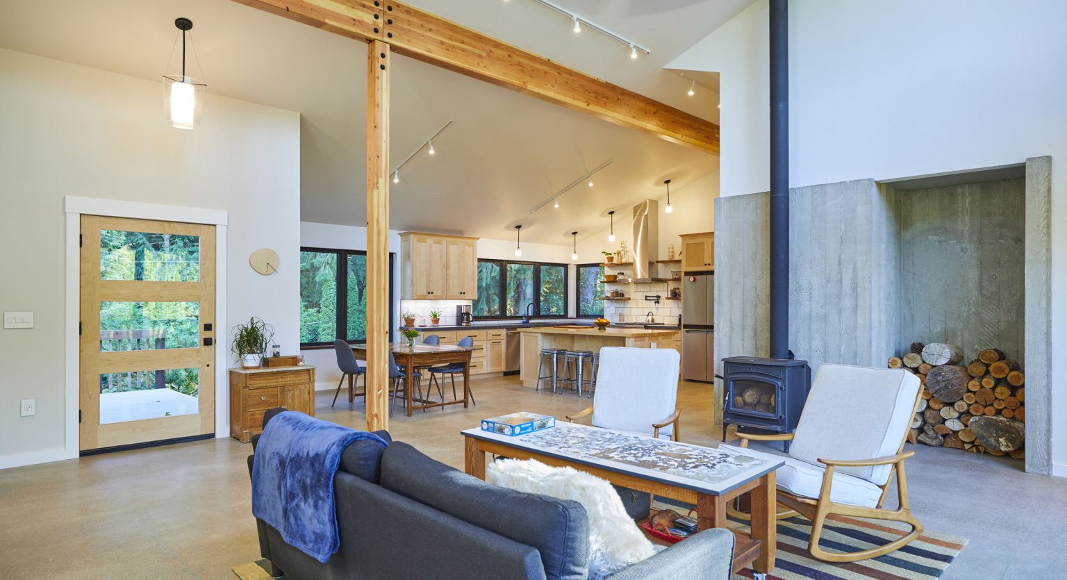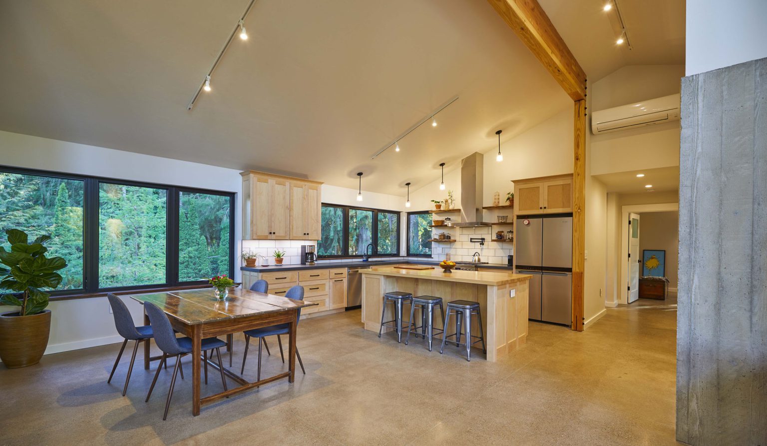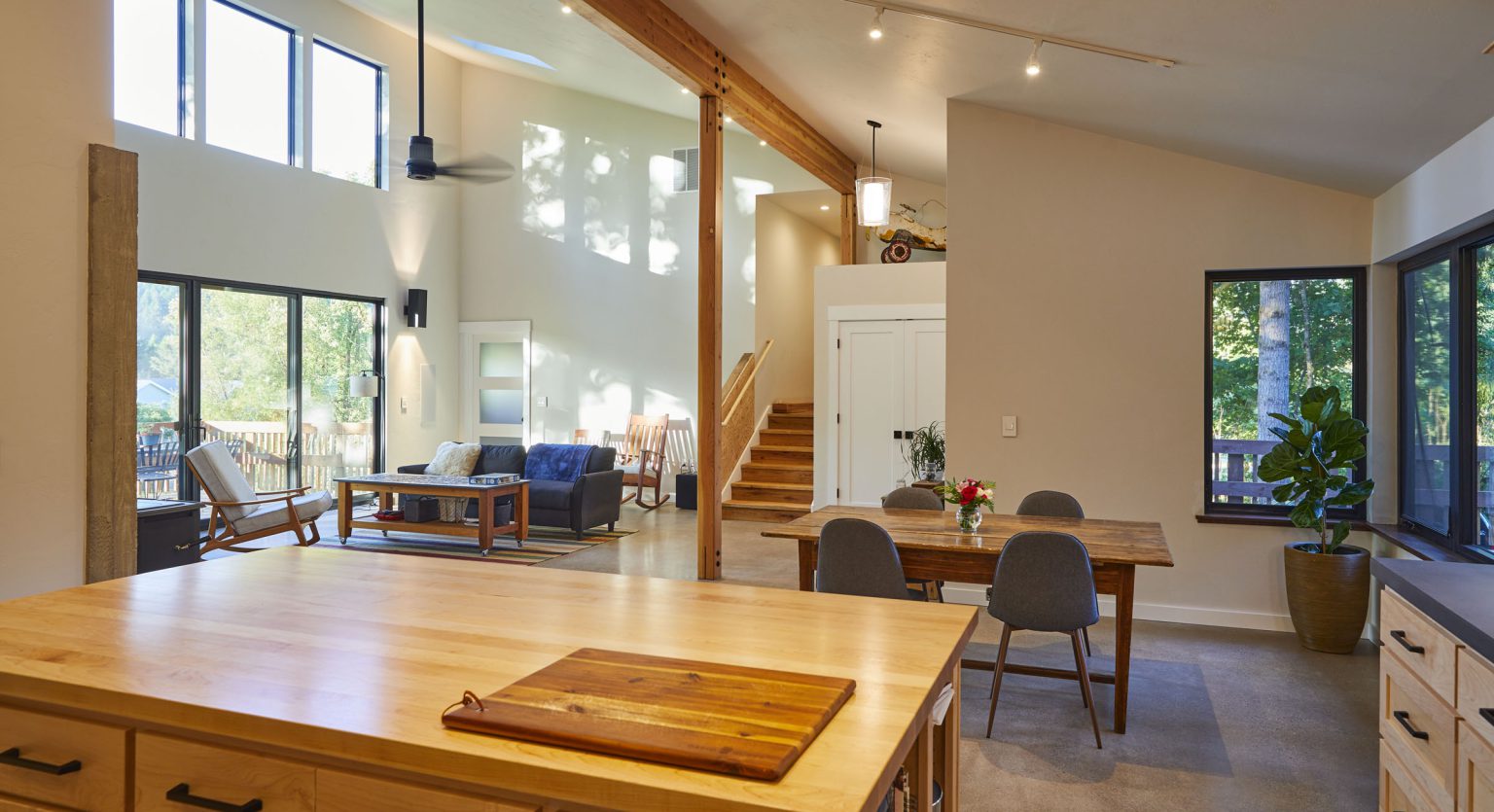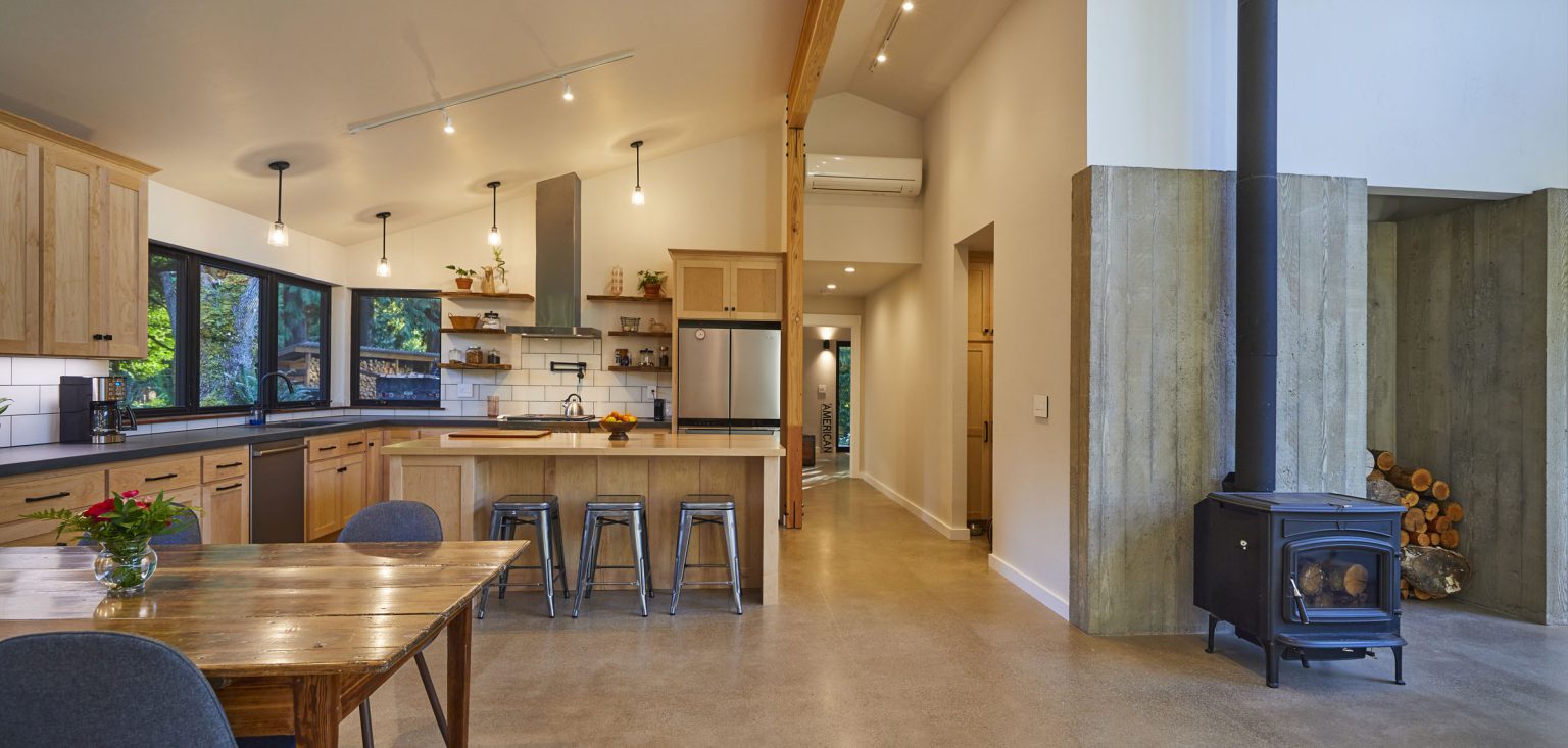 This project provided an opportunity to extend the usage and life of a beloved, yet outdated home. The existing building fabric was rebuilt, updated and extended, making intergenerational family living possible. The result is a durable, beautiful, accessible home that will serve this family for generations to come. Timber accents frame expansive views to the verdant Mckenzie hills. A reconfigured kitchen flows into a stunning living room and deck.