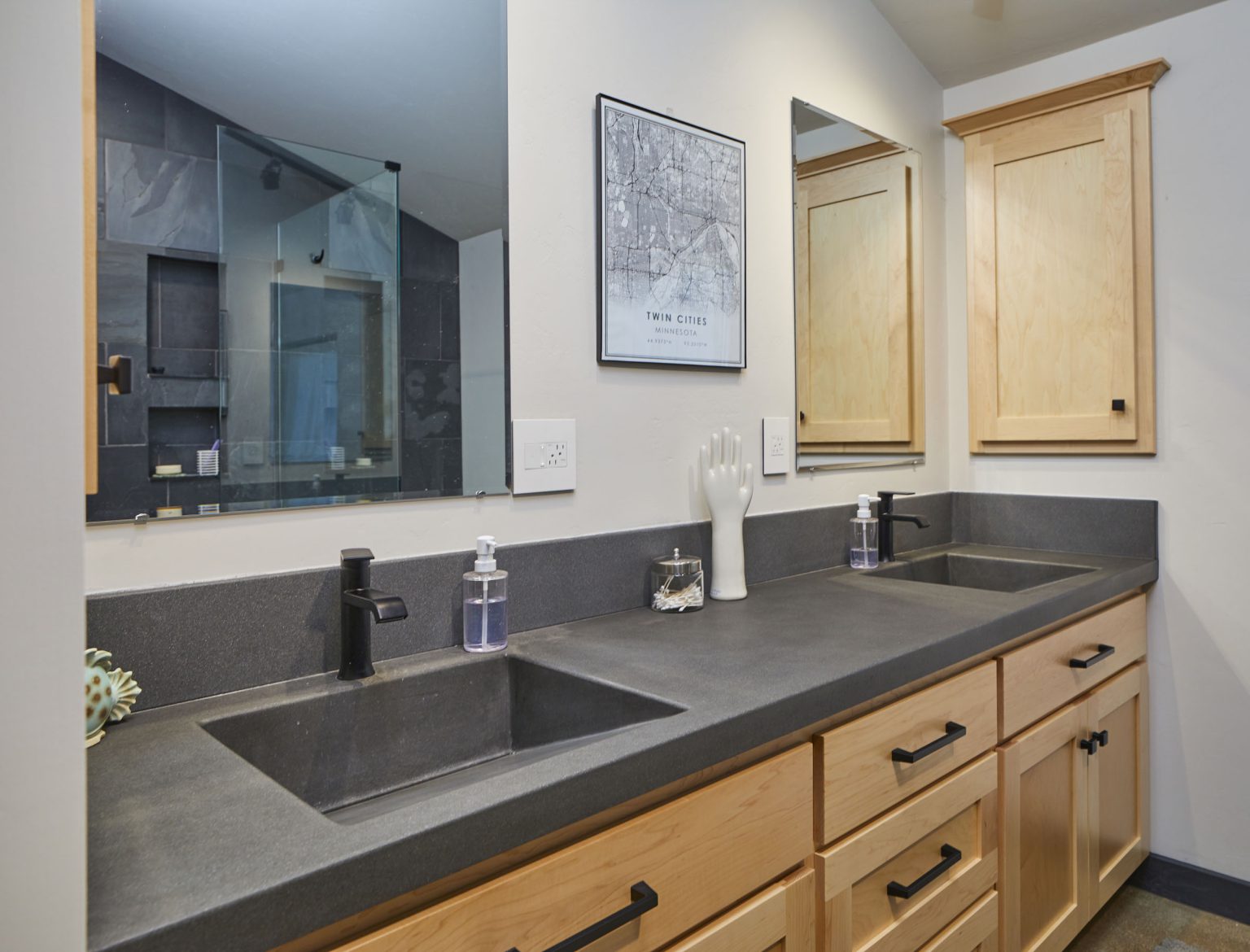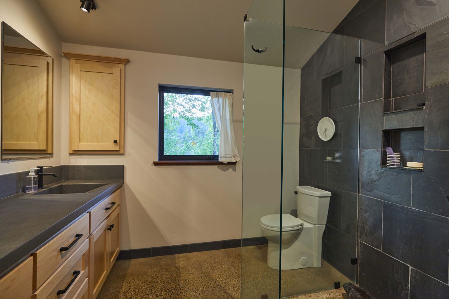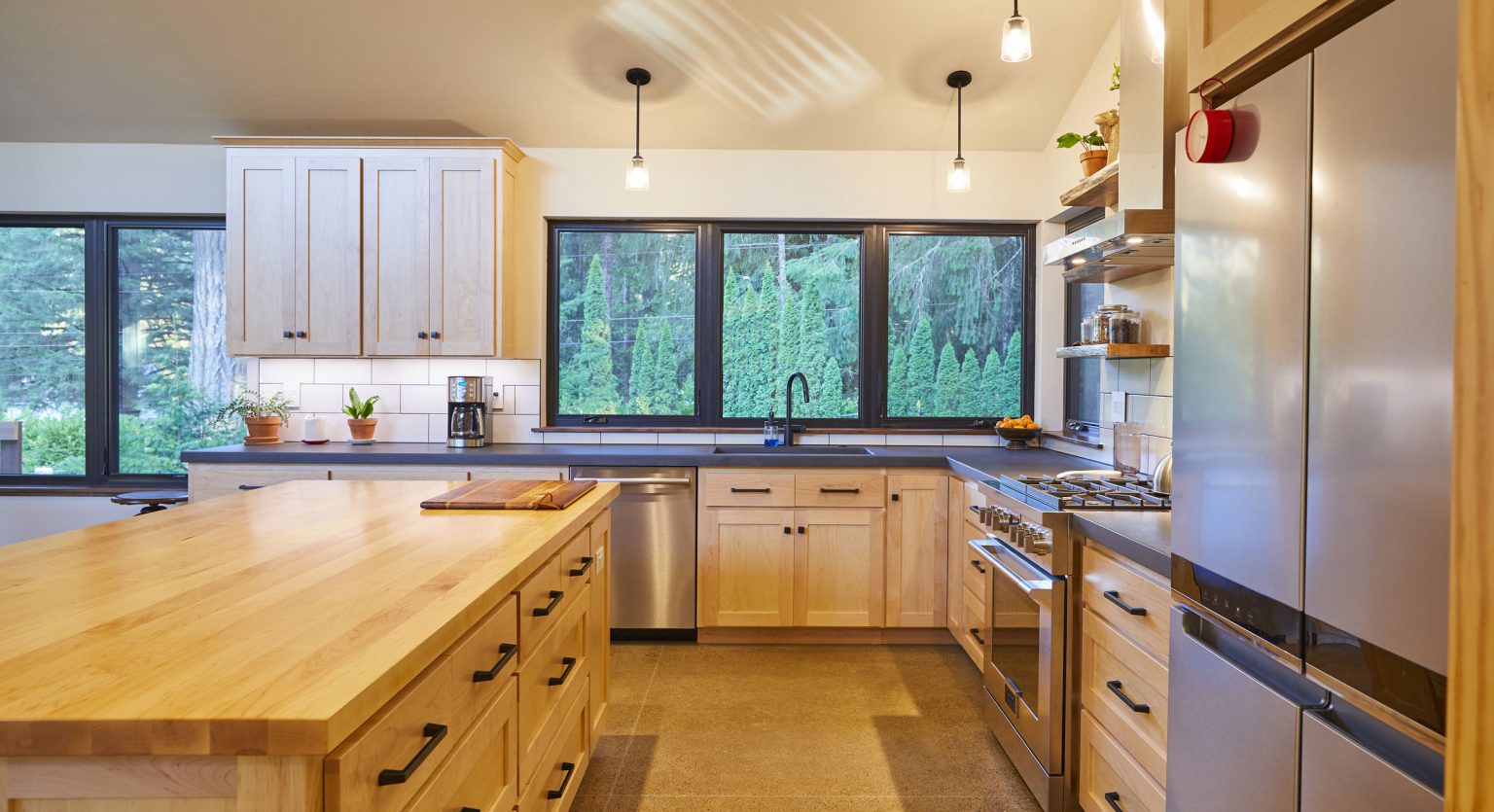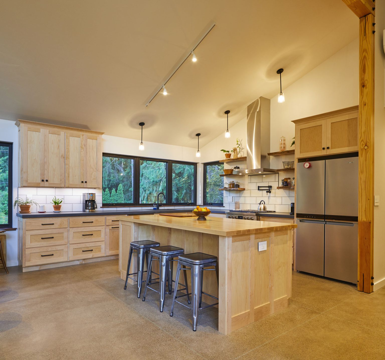 This project provided an opportunity to extend the usage and life of a beloved, yet outdated home. The existing building fabric was rebuilt, updated and extended, making intergenerational family living possible. The result is a durable, beautiful, accessible home that will serve this family for generations to come. Timber accents frame expansive views to the verdant Mckenzie hills. A reconfigured kitchen flows into a stunning living room and deck.