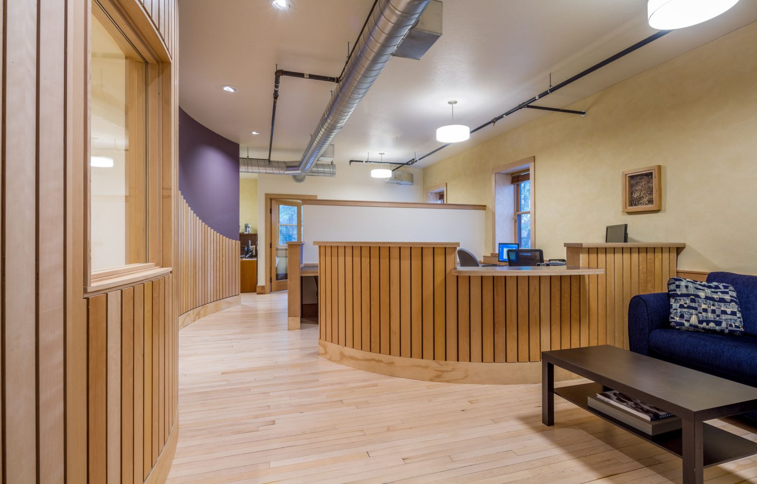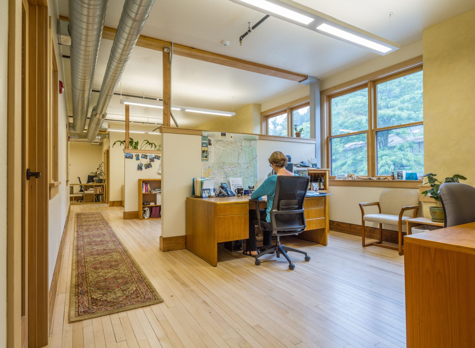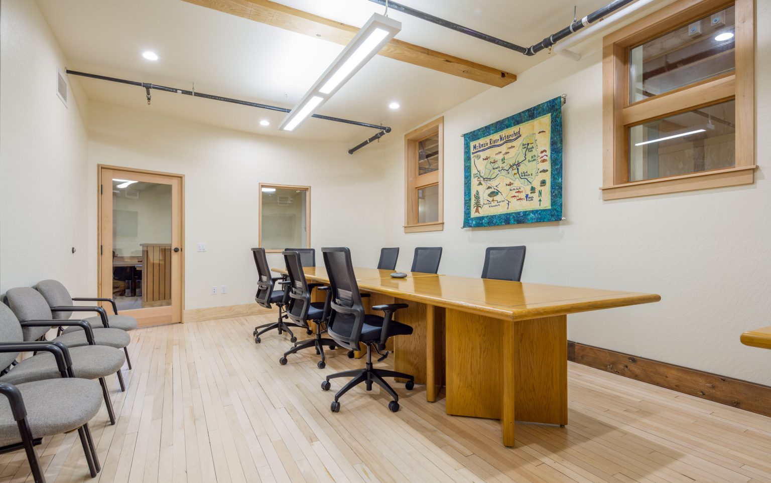 Aligned Architecture designed the new home for the McKenzie River Trust, a nonprofit dedicated to protecting and caring for lands and waters across Western Oregon. Located within the Mahonia Building in Eugene, the tenant-infill project created a welcoming, light-filled space that reflects the organization’s conservation values. Natural materials, thoughtful detailing, and flexible gathering areas foster collaboration. The design balances function with inspiration, giving this vital community nonprofit a home that supports its mission and future growth.
