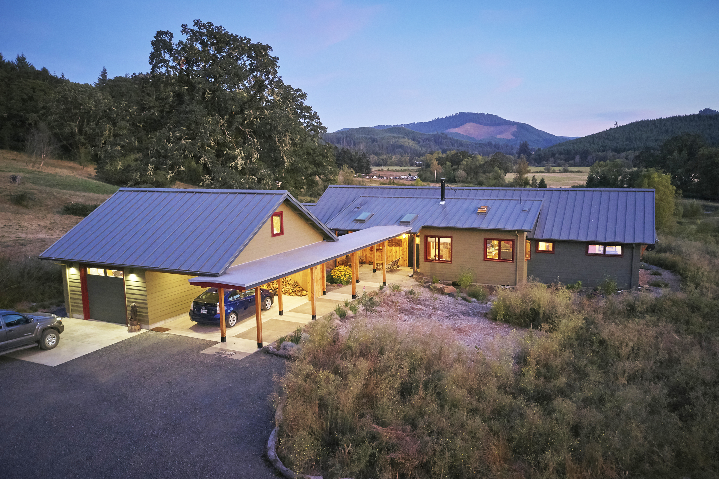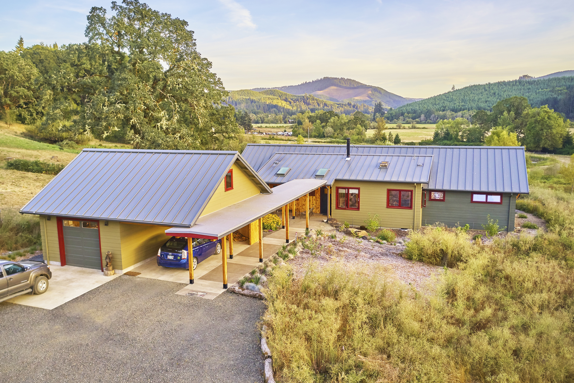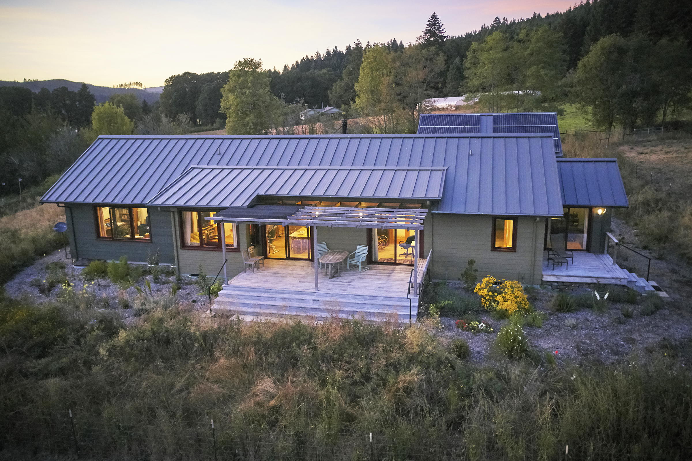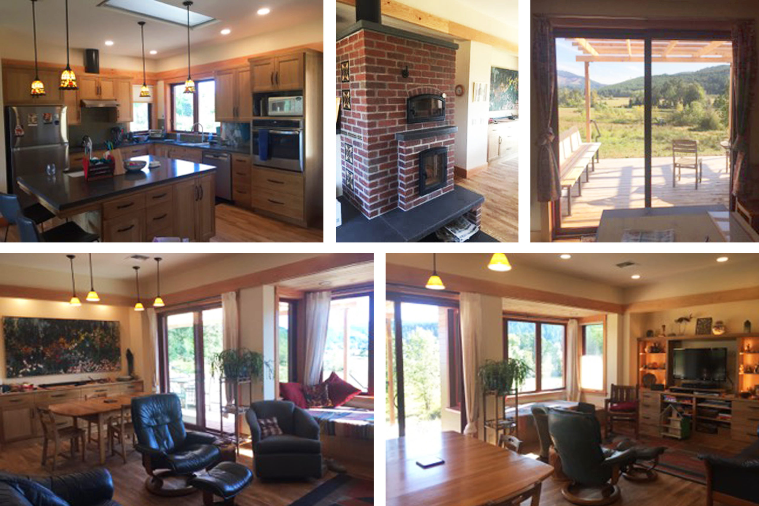 Sustainability was integrated throughout the design, including optimized solar orientation and daylighting, a solar PV system, a high-performance building envelope, and an engineered mechanical system paired with an efficient wood-burning heater. The result is a home that balances efficiency, comfort, and connection to its scenic surroundings. The super-insulated walls are wrapped with continuous rock wool insulation, and fitted with high-performance windows and doors. Abundant daylight is provided via windows, doors and skylights. The mechanical system includes a highly efficient heat pump, an Energy Recovery Ventilator, and a system of ducts that draws additional heat from a masonry heater. The entire south-facing carport roof plane carries a solar PV array, generating electricity through much of the year.
