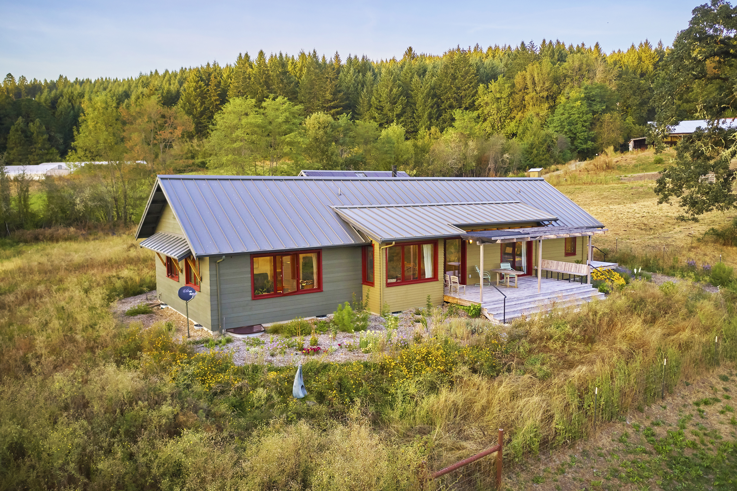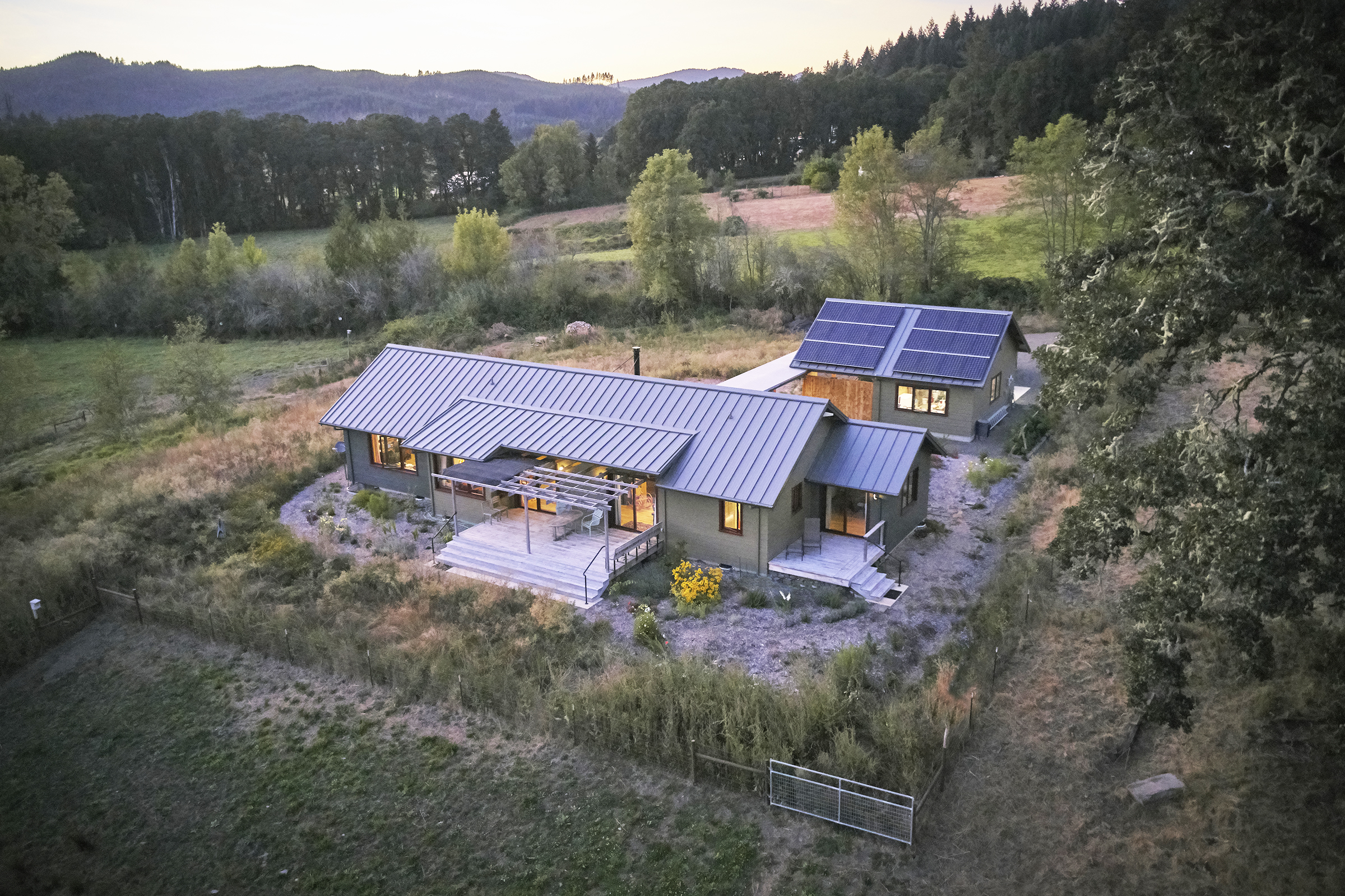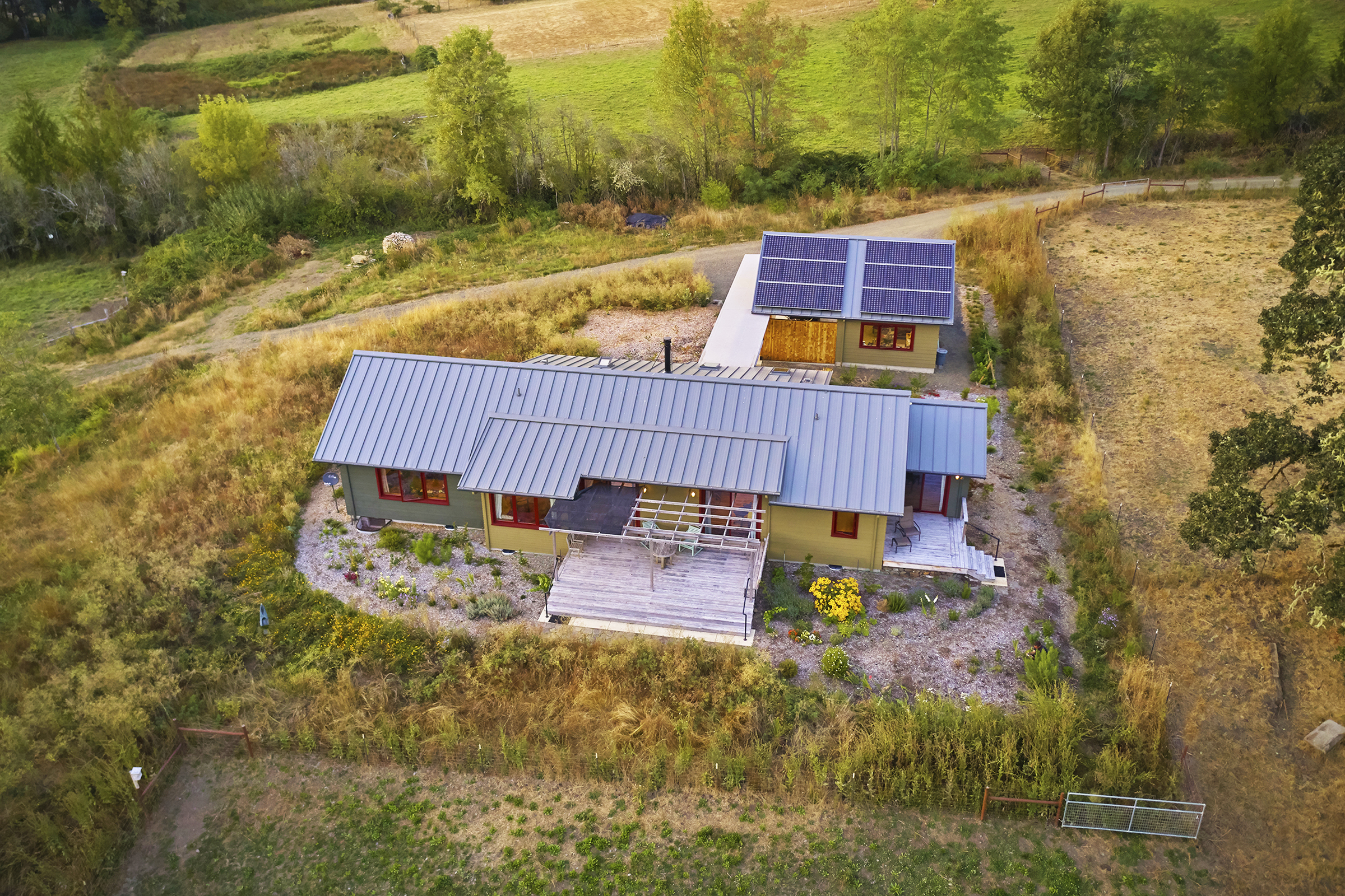 Sustainability was integrated throughout the design, including optimized solar orientation and daylighting, a solar PV system, a high-performance building envelope, and an engineered mechanical system paired with an efficient wood-burning heater. The result is a home that balances efficiency, comfort, and connection to its scenic surroundings. The super-insulated walls are wrapped with continuous rock wool insulation, and fitted with high-performance windows and doors. Abundant daylight is provided via windows, doors and skylights. The mechanical system includes a highly efficient heat pump, an Energy Recovery Ventilator, and a system of ducts that draws additional heat from a masonry heater. The entire south-facing carport roof plane carries a solar PV array, generating electricity through much of the year.