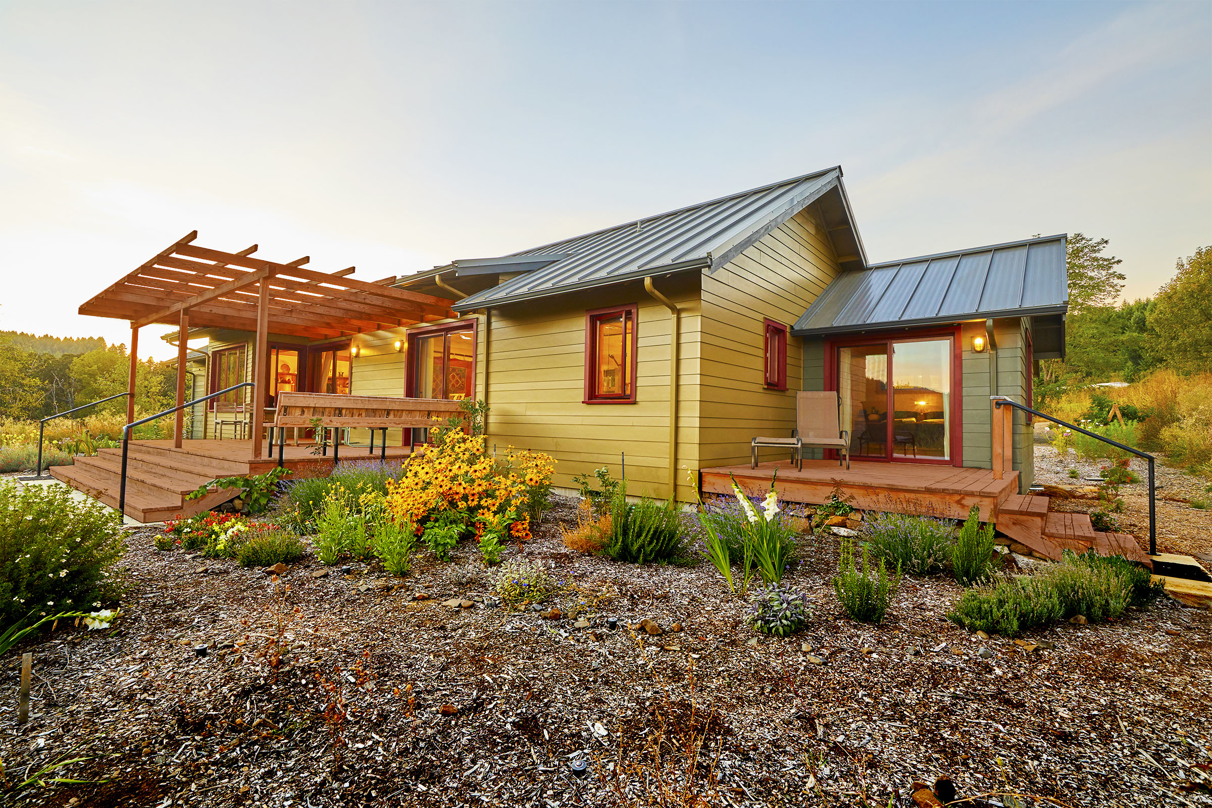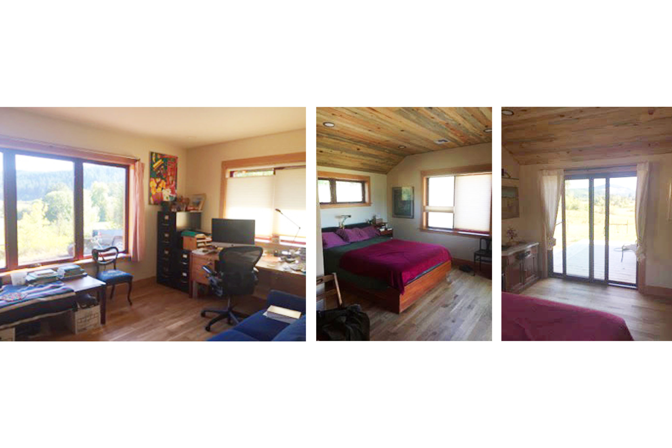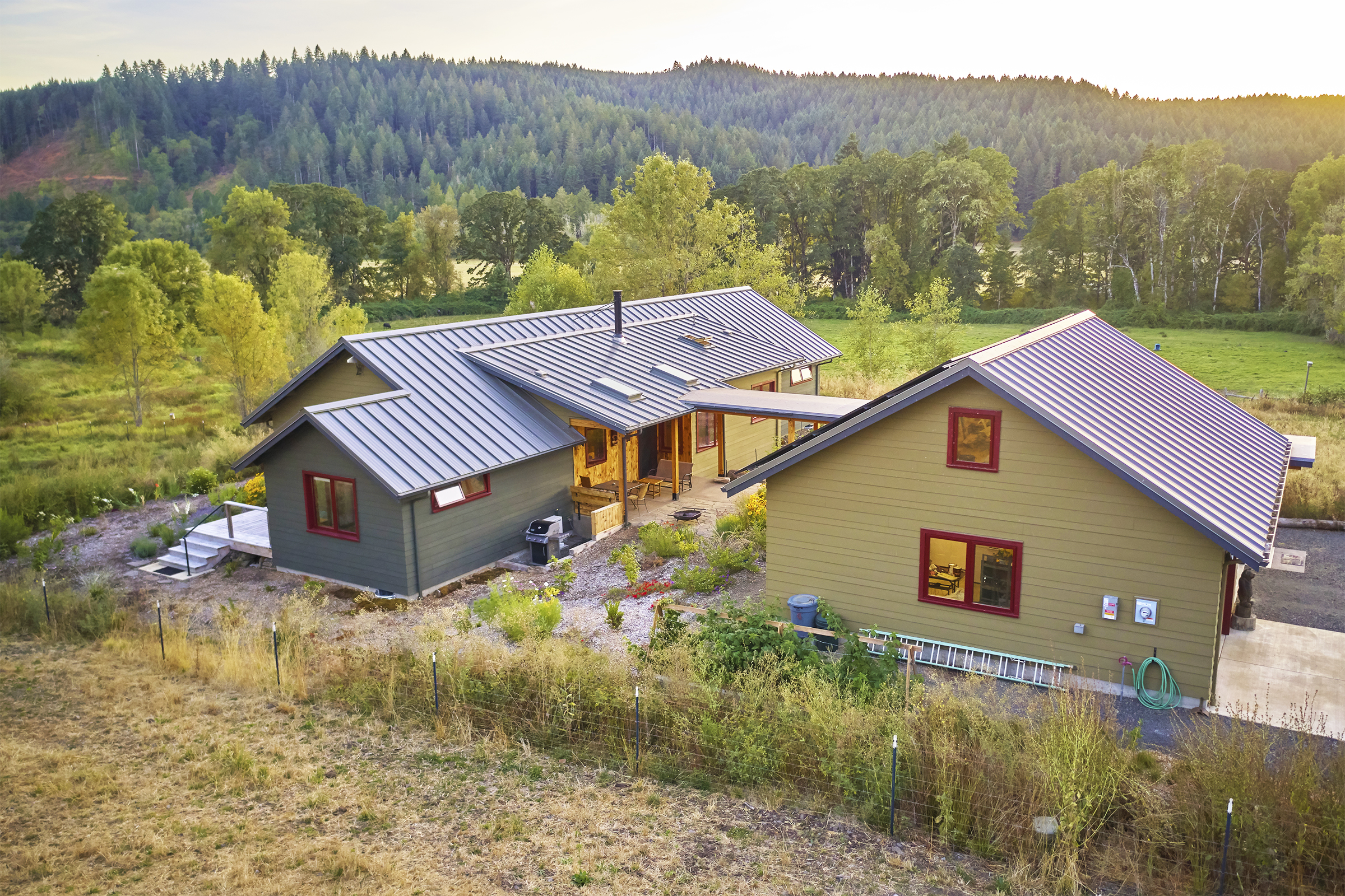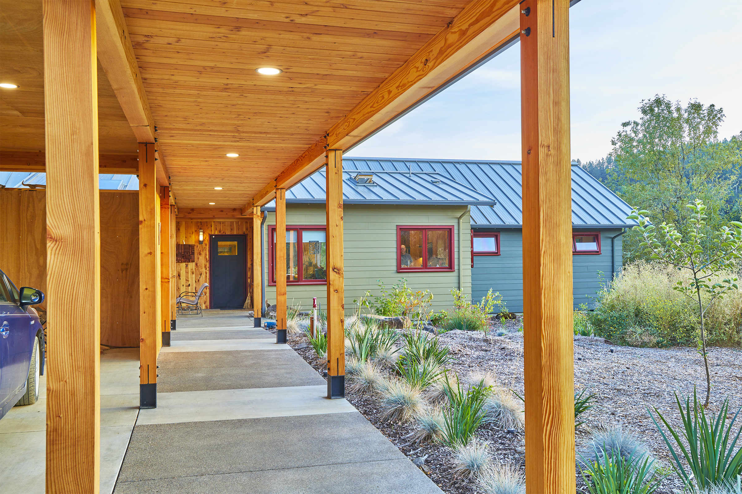 Sustainability was integrated throughout the design, including optimized solar orientation and daylighting, a solar PV system, a high-performance building envelope, and an engineered mechanical system paired with an efficient wood-burning heater. The result is a home that balances efficiency, comfort, and connection to its scenic surroundings. The super-insulated walls are wrapped with continuous rock wool insulation, and fitted with high-performance windows and doors. Abundant daylight is provided via windows, doors and skylights. The mechanical system includes a highly efficient heat pump, an Energy Recovery Ventilator, and a system of ducts that draws additional heat from a masonry heater. The entire south-facing carport roof plane carries a solar PV array, generating electricity through much of the year.