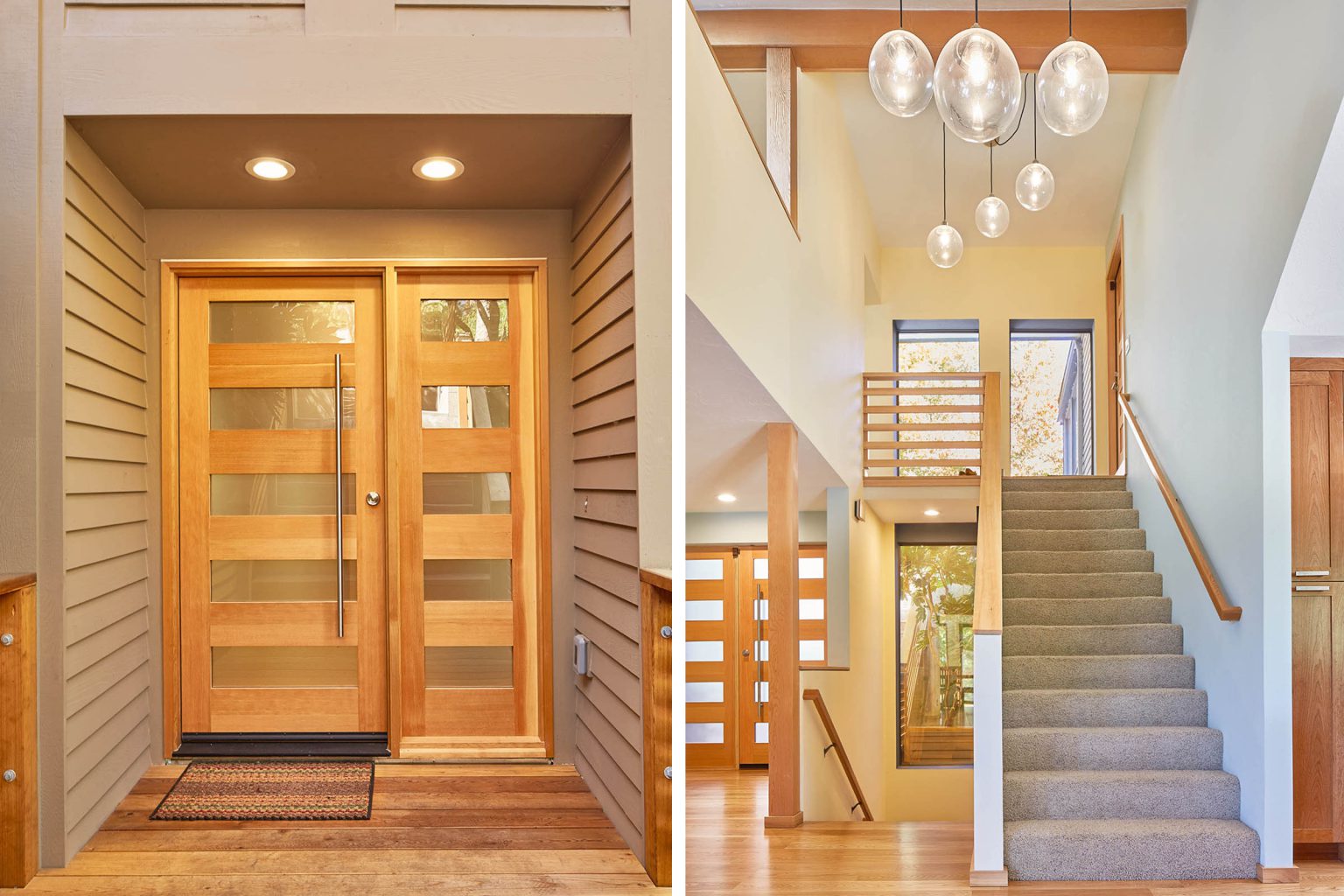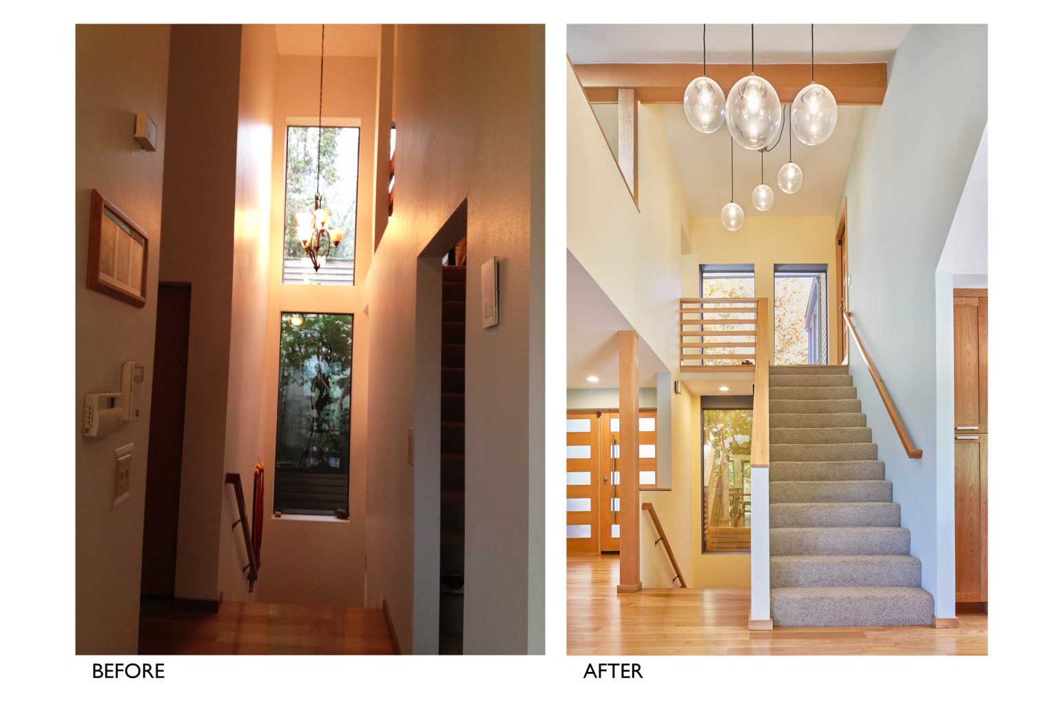 At this hillside residence, the challenge was to unify a series of disconnected spaces while enhancing privacy for the master suite. Our design introduced light and visual connections throughout the home, expanding the entry to create a seamless, welcoming transition between exterior and interior spaces and thoughtfully linking to the adjacent staircase.