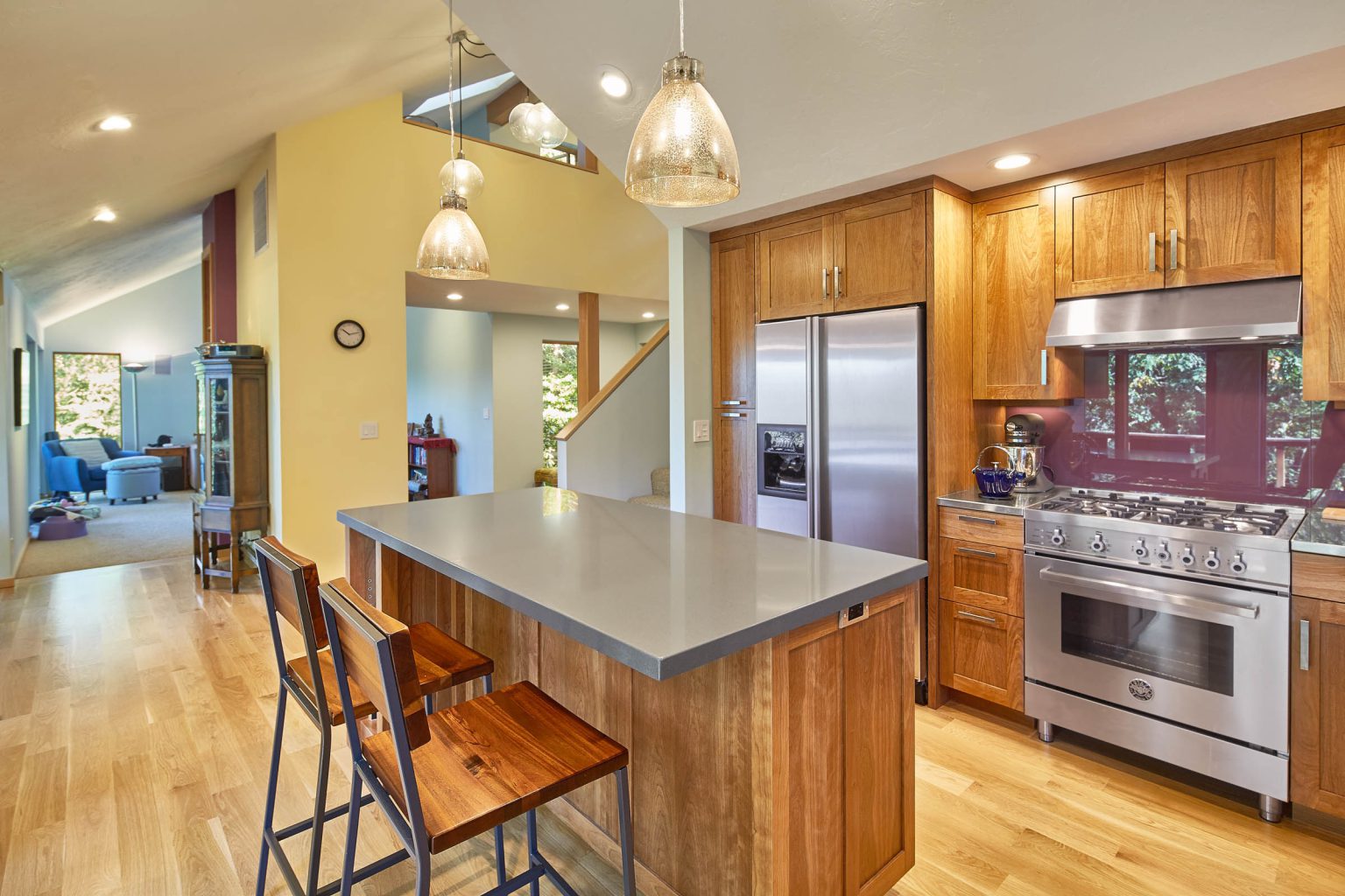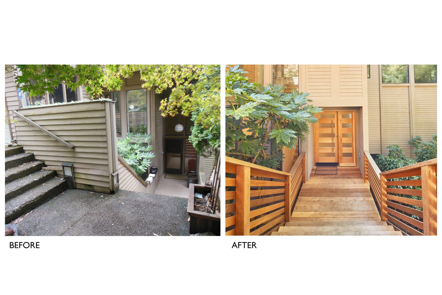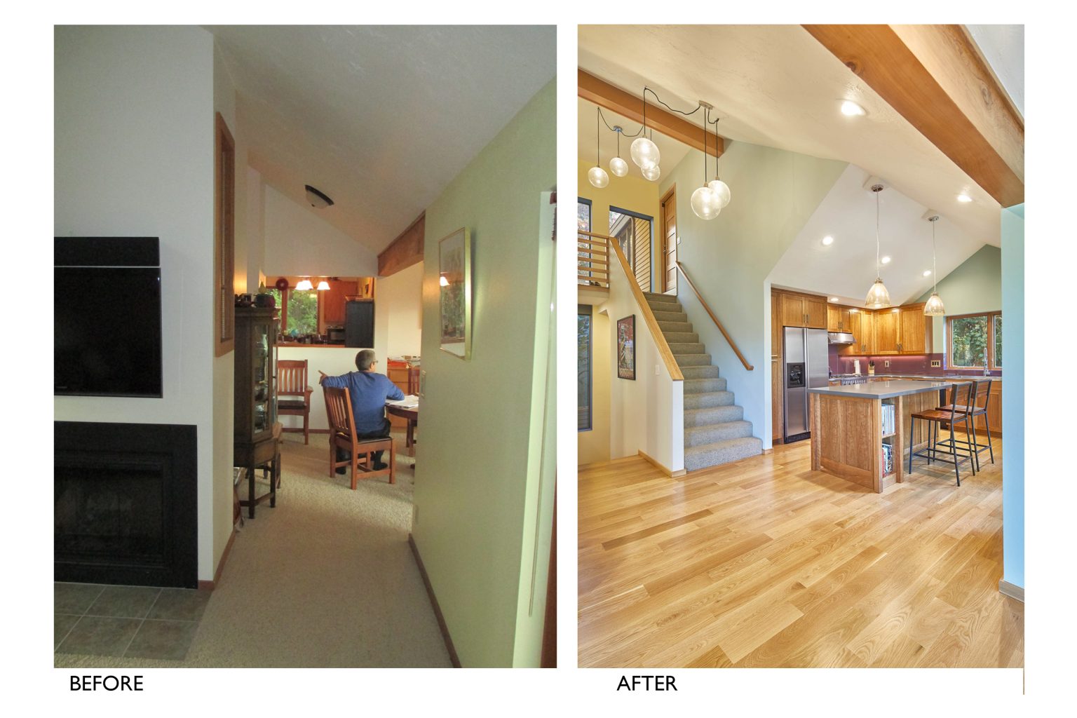 A previously unused attic was transformed into a bright, functional study overlooking the main living area, maximizing both space and views. Privacy for the master suite was achieved with the strategic addition of a guest half bath and laundry room. The entry deck and patio were also refreshed, completing a cohesive design that balances openness, connection, and separation.