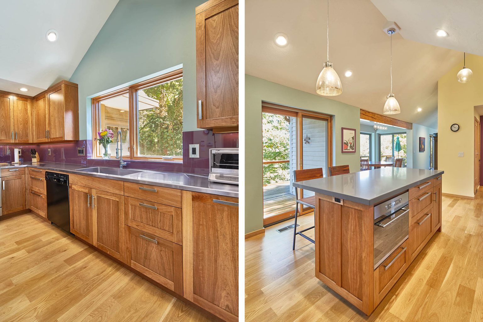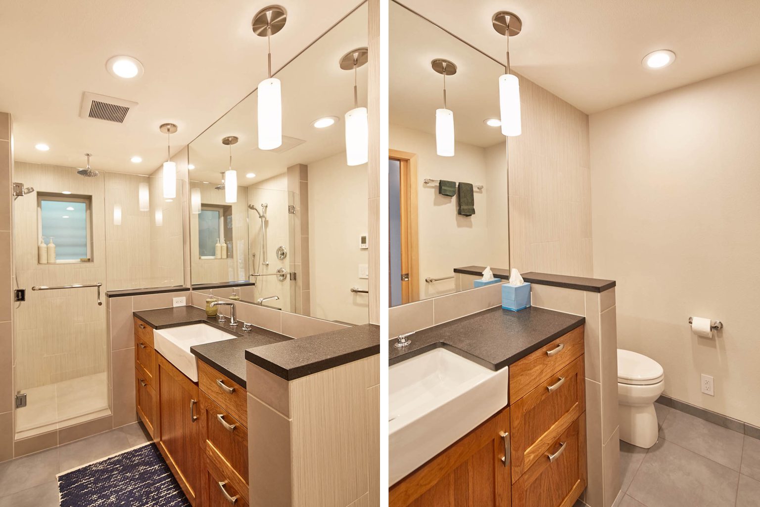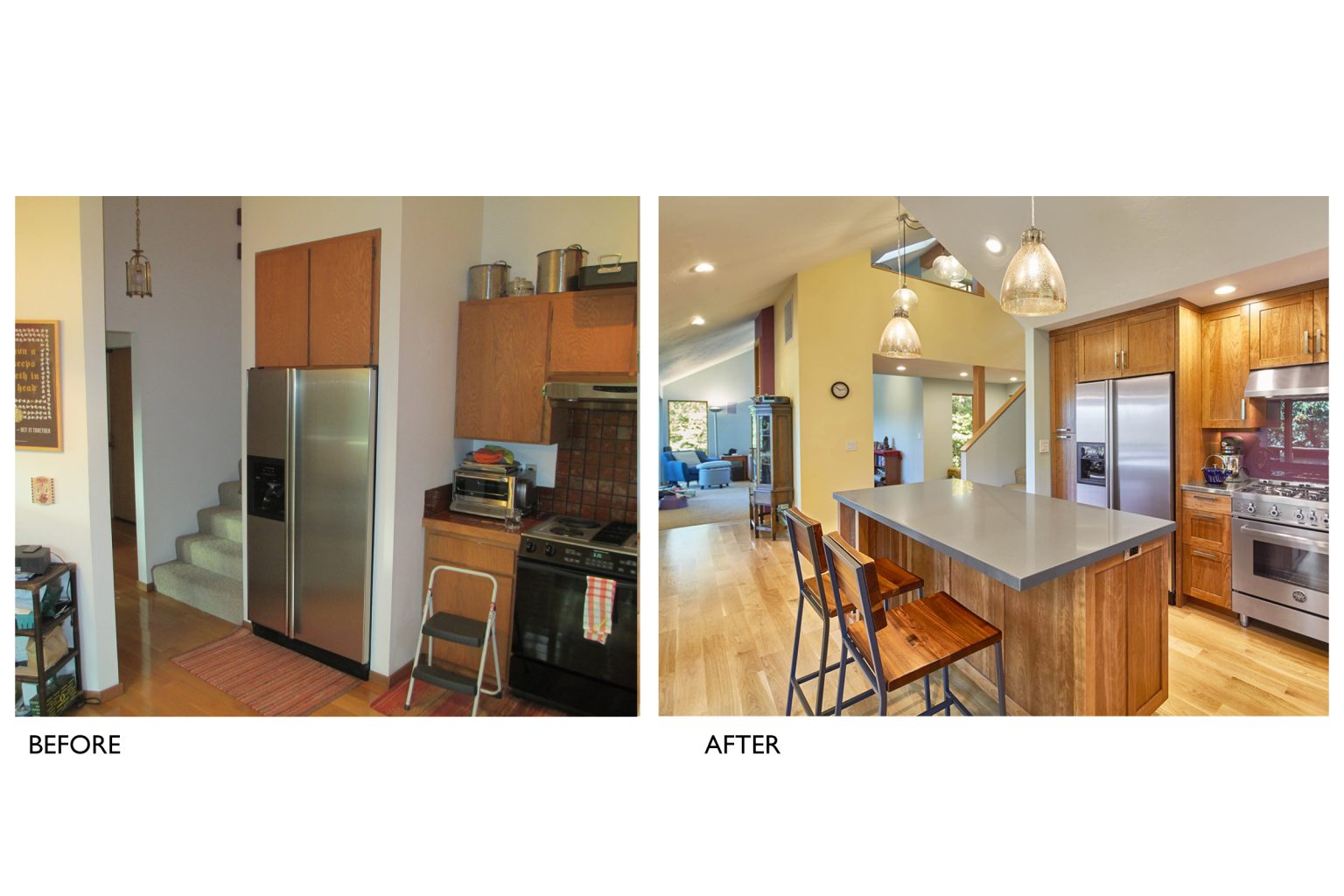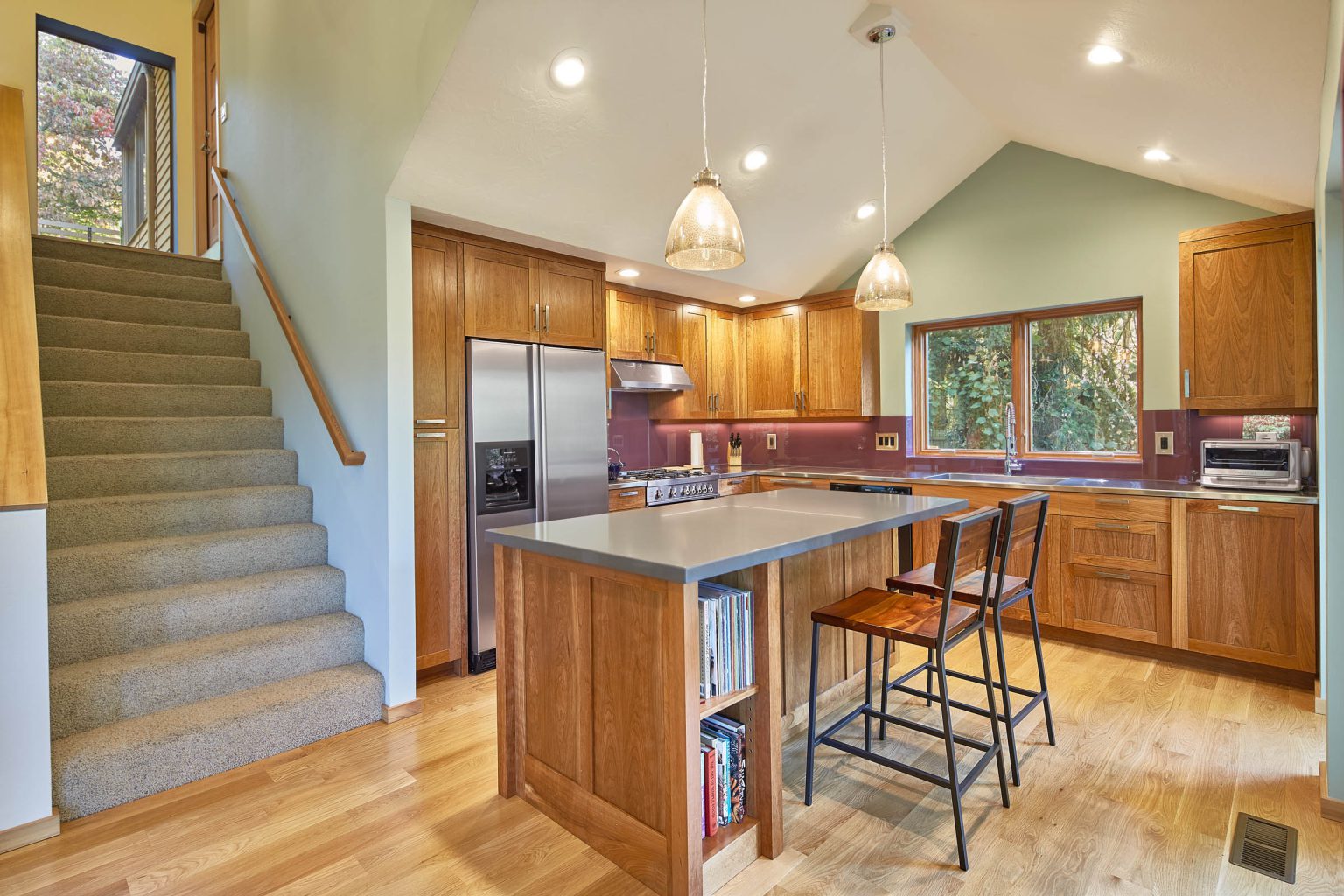 A previously unused attic was transformed into a bright, functional study overlooking the main living area, maximizing both space and views. Privacy for the master suite was achieved with the strategic addition of a guest half bath and laundry room. The entry deck and patio were also refreshed, completing a cohesive design that balances openness, connection, and separation.