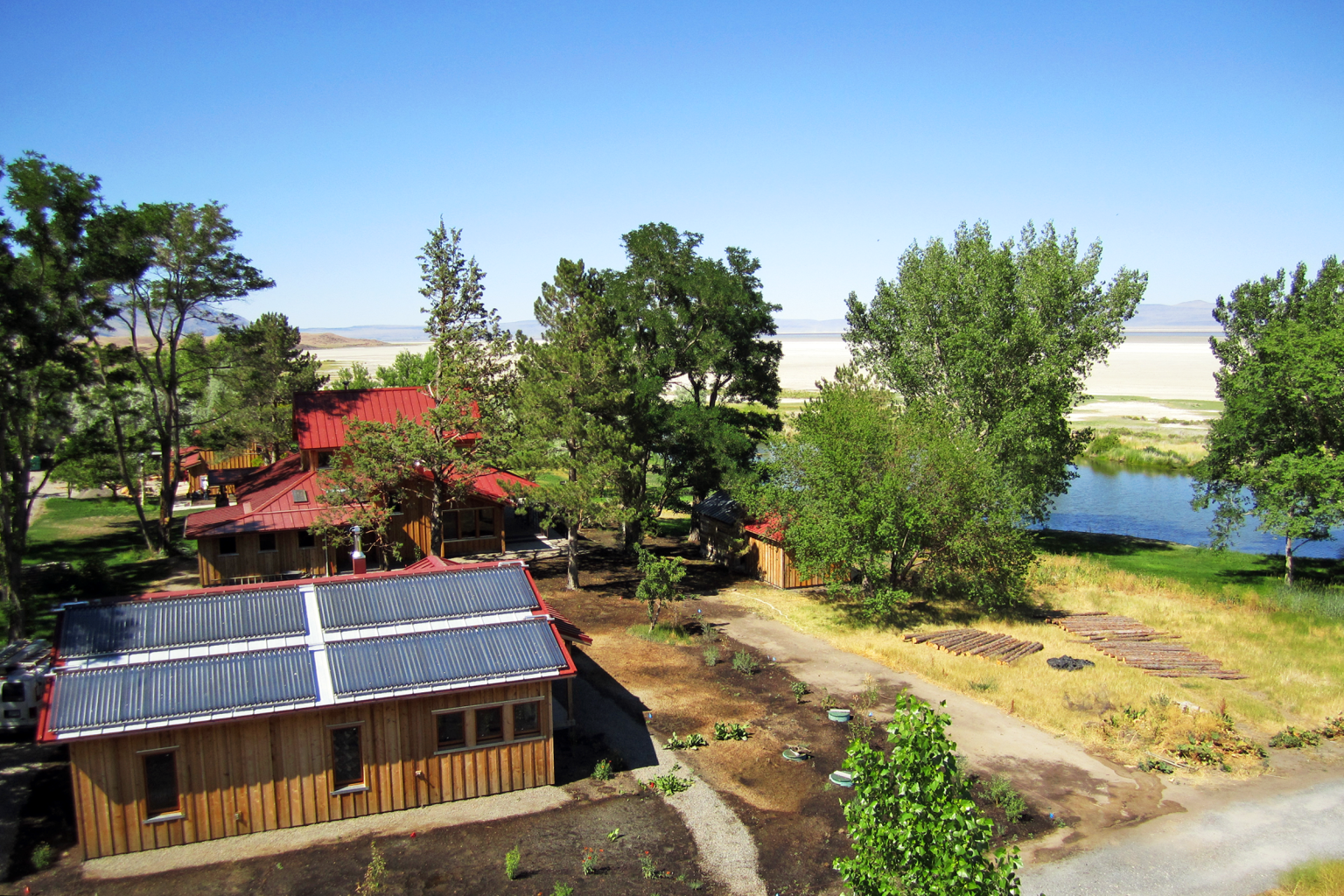 At this artist retreat in Summer Lake, Oregon, a new master plan weaves driveways, walkways, outdoor spaces, and a mix of new, existing, and relocated buildings into a cohesive whole. The campus includes a common house, service wing, bathhouse, and remodeled cabins and residences—all designed in a clean vernacular that highlights the natural beauty of materials and exposed structure. Views to the seasonal lake, surrounding mountains, and pond are both abundant and carefully framed.