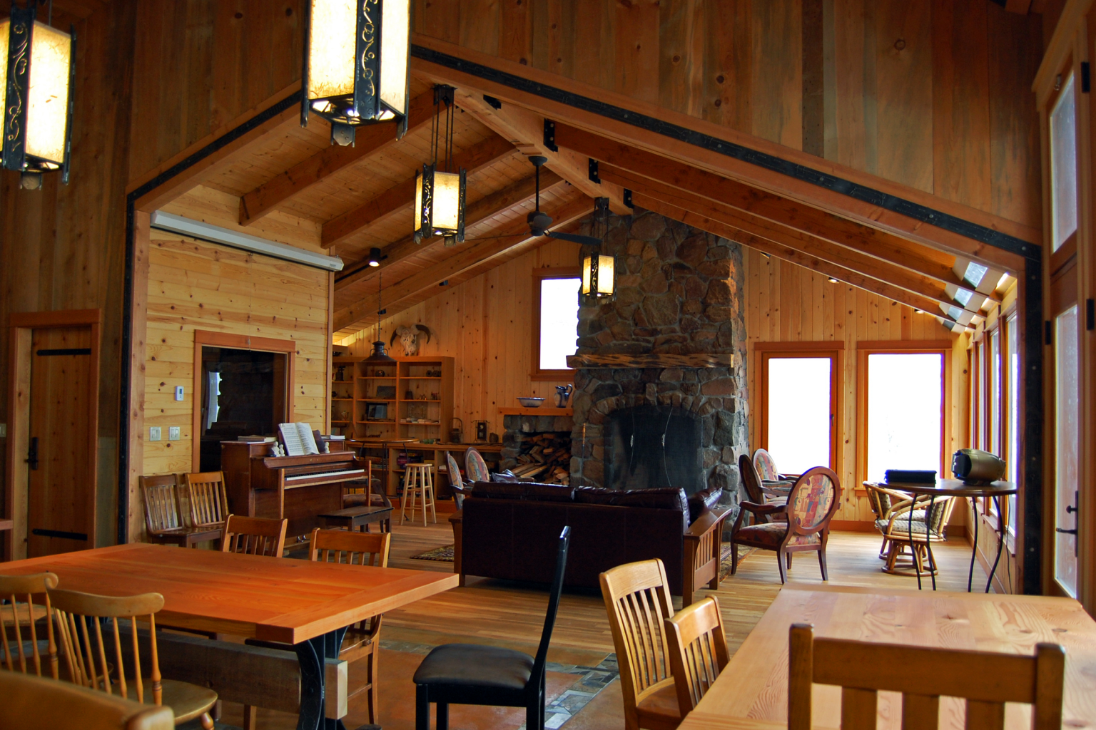 Sustainability guided every decision. Extensive reuse of existing buildings and salvaged materials reduced embodied energy, while minimal finishes—appropriate to the desert climate—limited the use of new resources. Daylighting strategies bring natural light deep into each building, strengthening connections to the land. A 1,500-gallon cistern in the common house, rooftop solar panels, and provisions for future solar thermal systems support the retreat’s energy and water conservation goals.