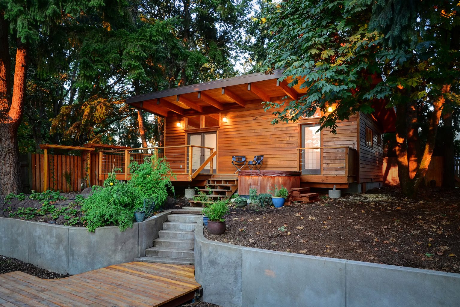 Tucked among tall firs behind an existing hillside residence, this modernist studio feels both grounded and expansive. A westward lifting shed roof with high transom windows floods the interiors with daylight, frames views of sky and trees, and creates generous vertical storage. Deep overhangs provide shelter for entries, a deck, and storage racks, while inside, a large multi-purpose room and smaller adjoining space offer flexibility for future conversion of the current shop and office into a small residence. The bathroom includes a dry sauna, and just outside, a hot tub nestles into the terraced garden between the two buildingsāblurring the line between indoor retreat and outdoor sanctuary.