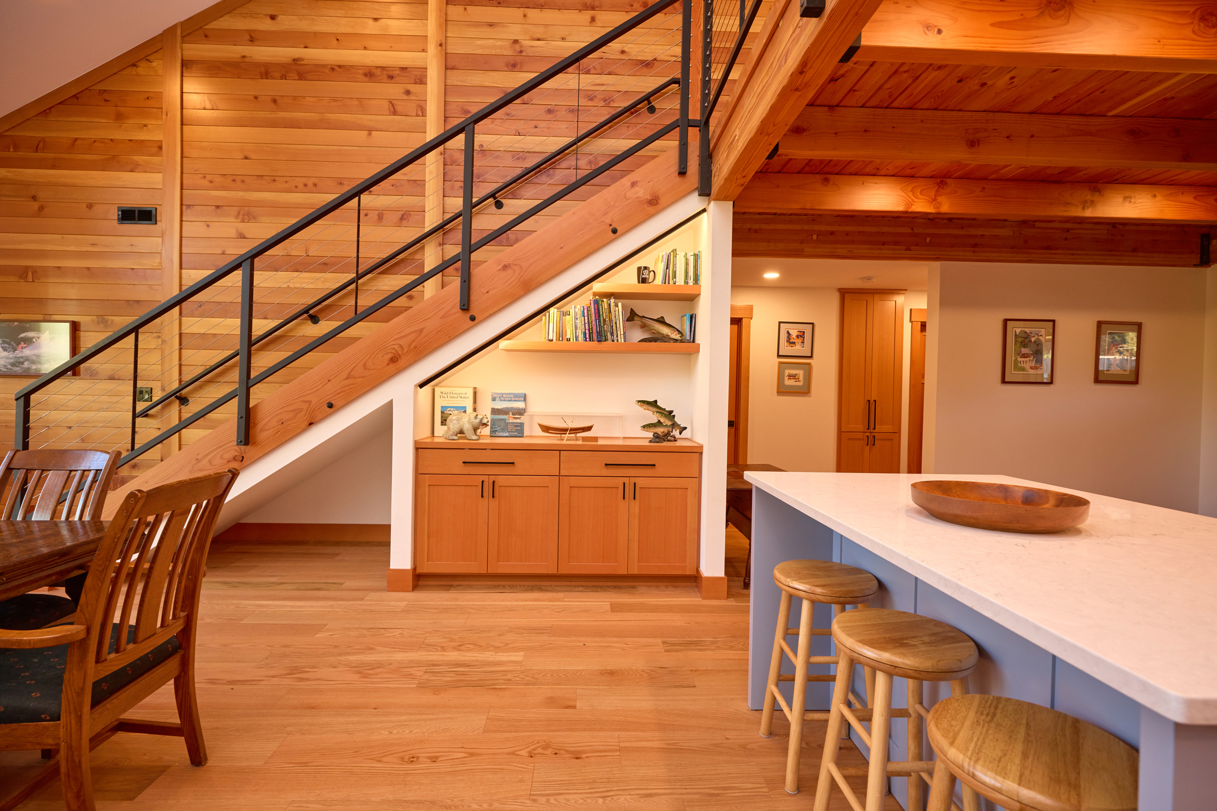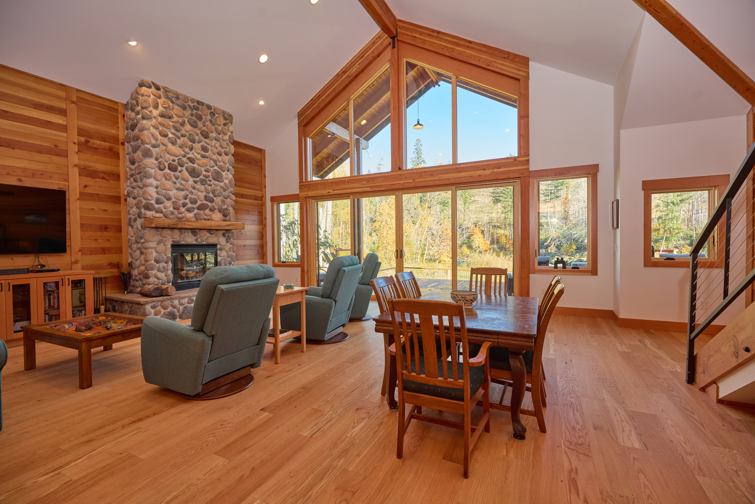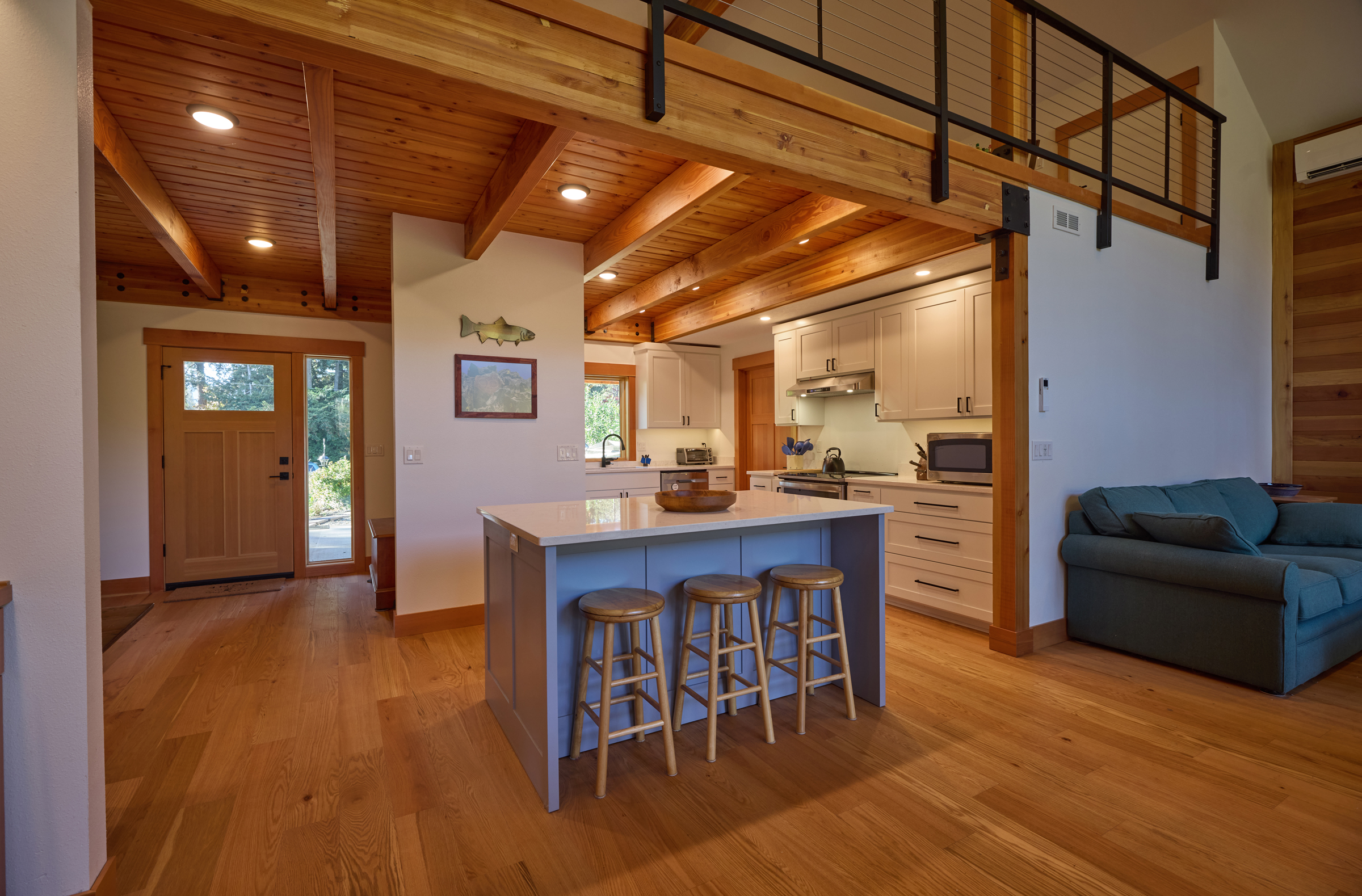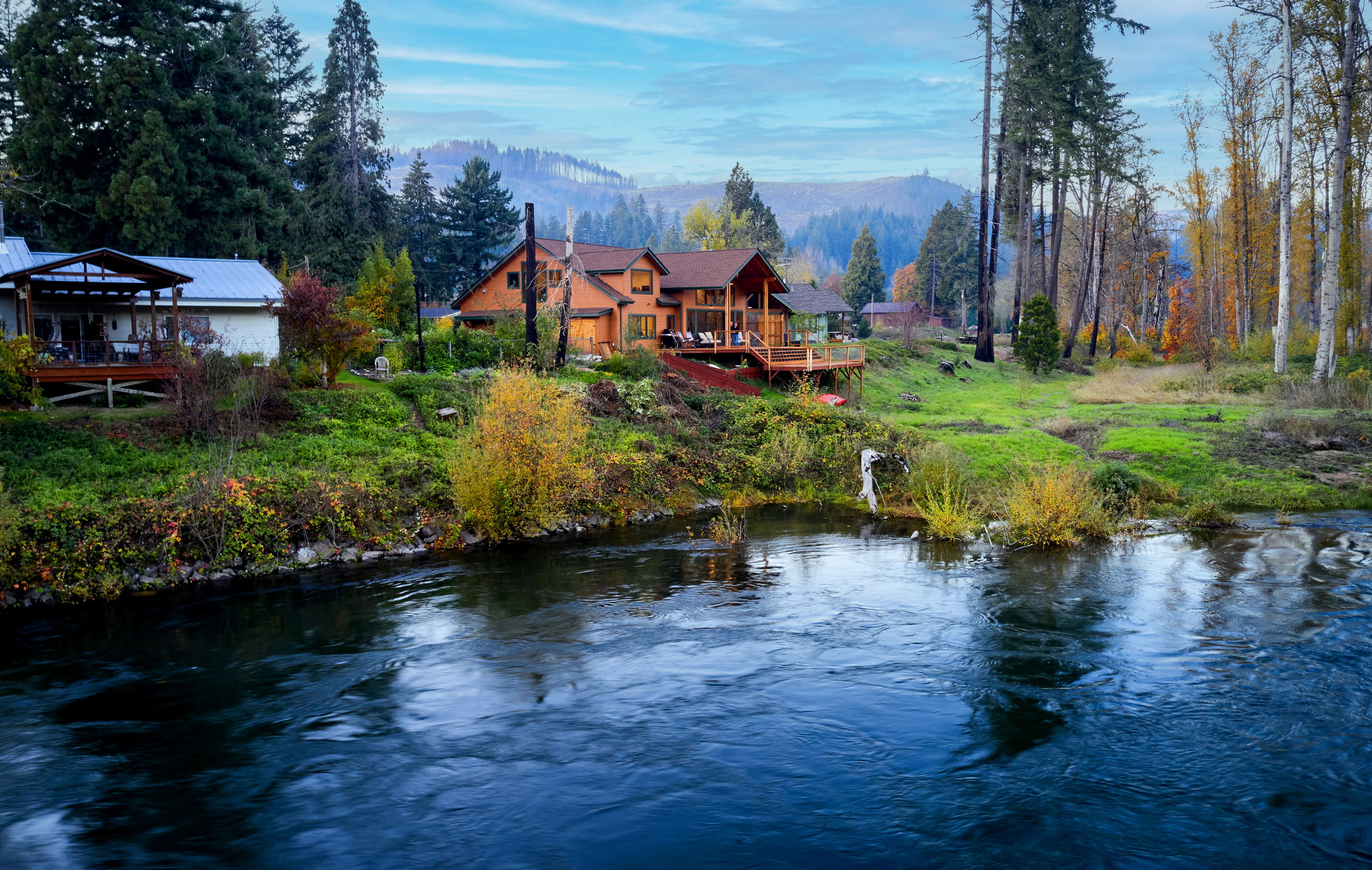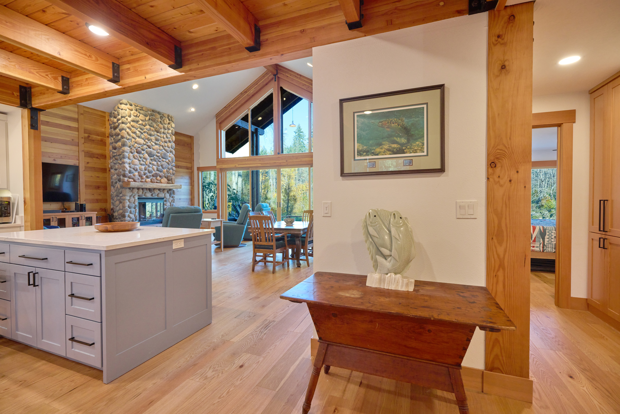 This residence along the McKenzie River rests along a tree dappled bend. The owners sought to replace and improve upon the previous cabin which had been destroyed in the 2020 Holiday Farm Fire. Aligned Architecture’s design embraces the river views, drawing upon traditional timber building techniques to create an ode to air, water and light.