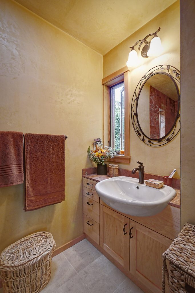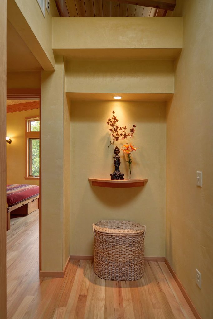 Every detail reflects the owners’ vision of a home that is earth-friendly, filled with natural light, and deeply connected to its garden setting. An open great room unites living, dining, and cooking areas, expanding to a flexible study/guest space and a partly sheltered deck. A central wood stove anchors the room, while natural plaster walls, exposed wood structure, and built-ins create warmth and character. Private spaces include a cozy bedroom bathed in morning light and a bathroom designed with accessibility in mind—an elegant “forever home” solution.
