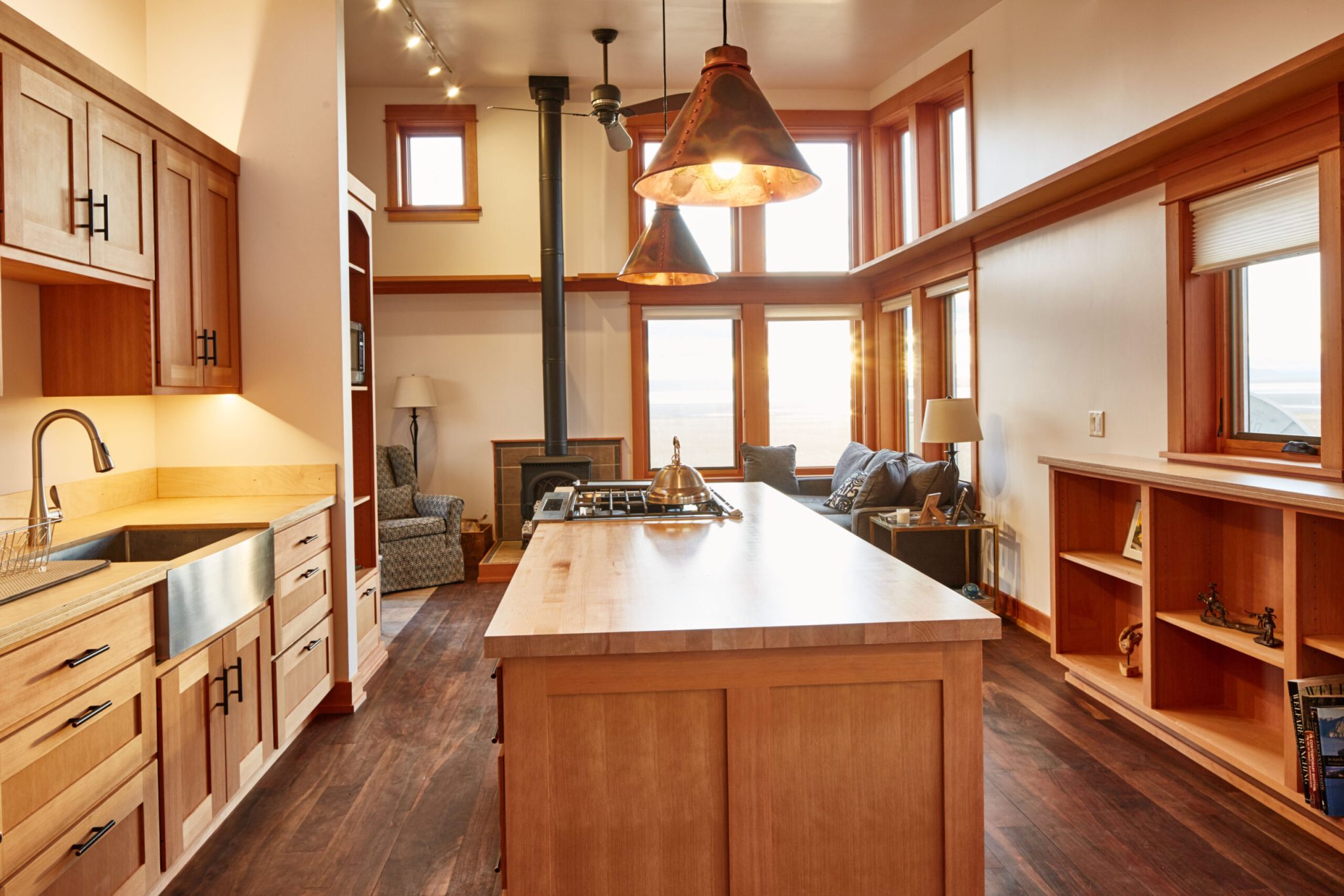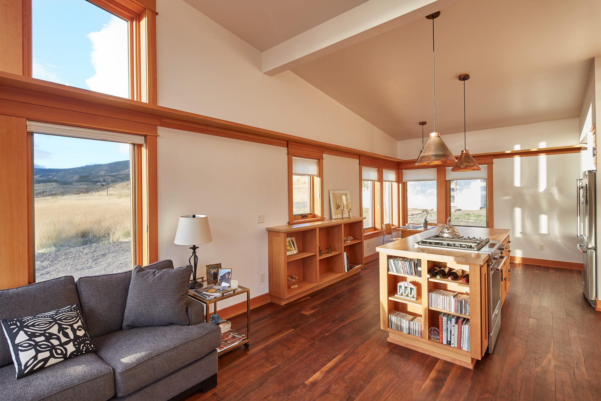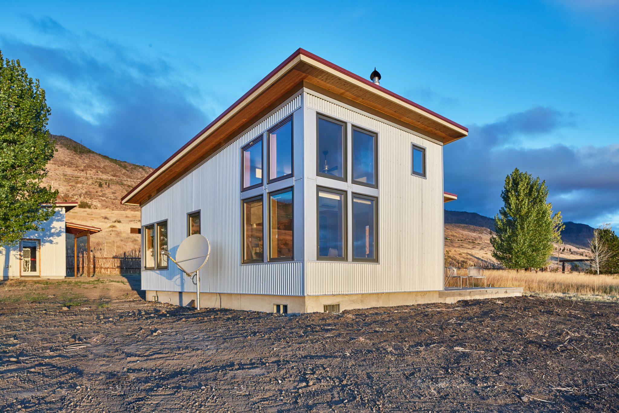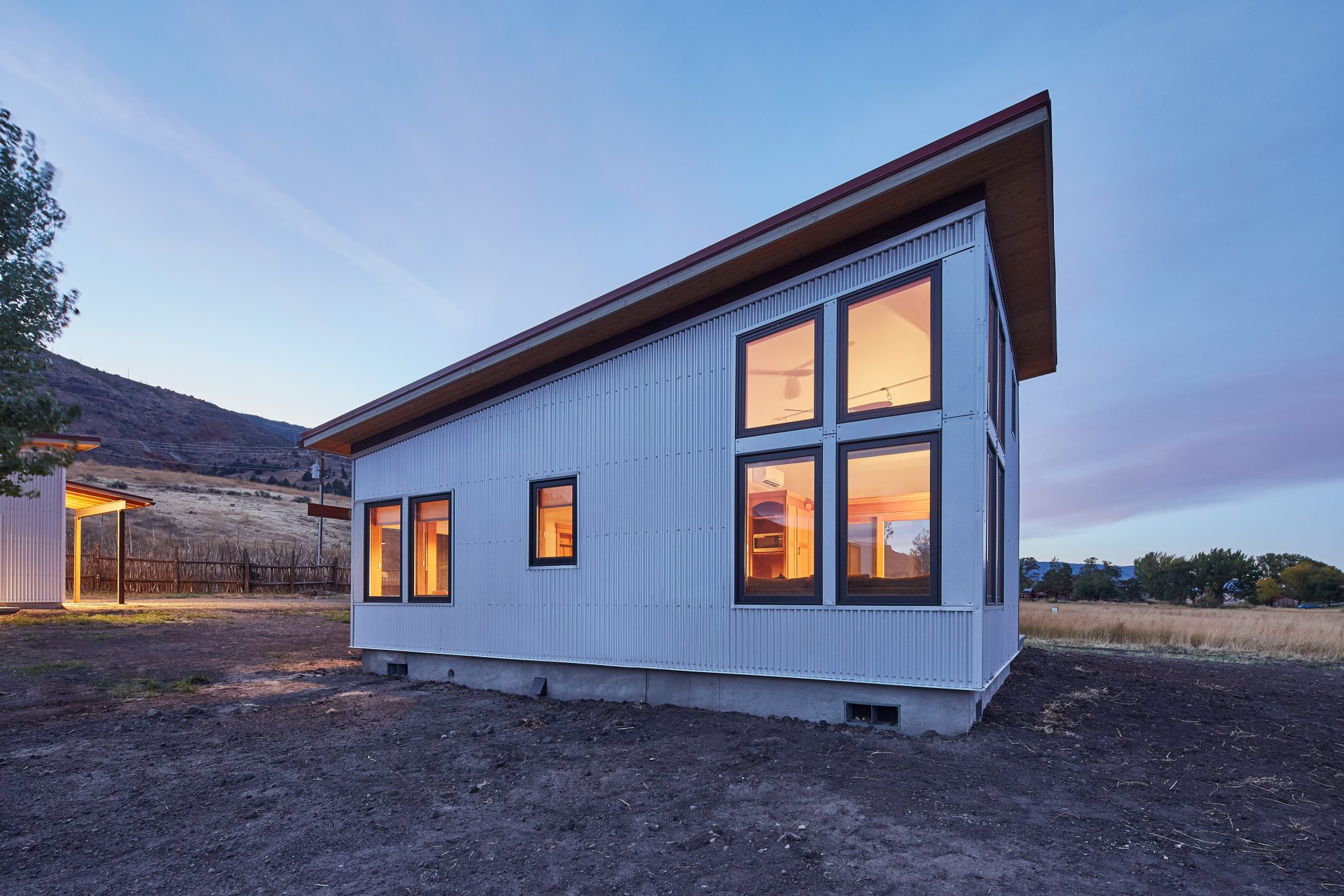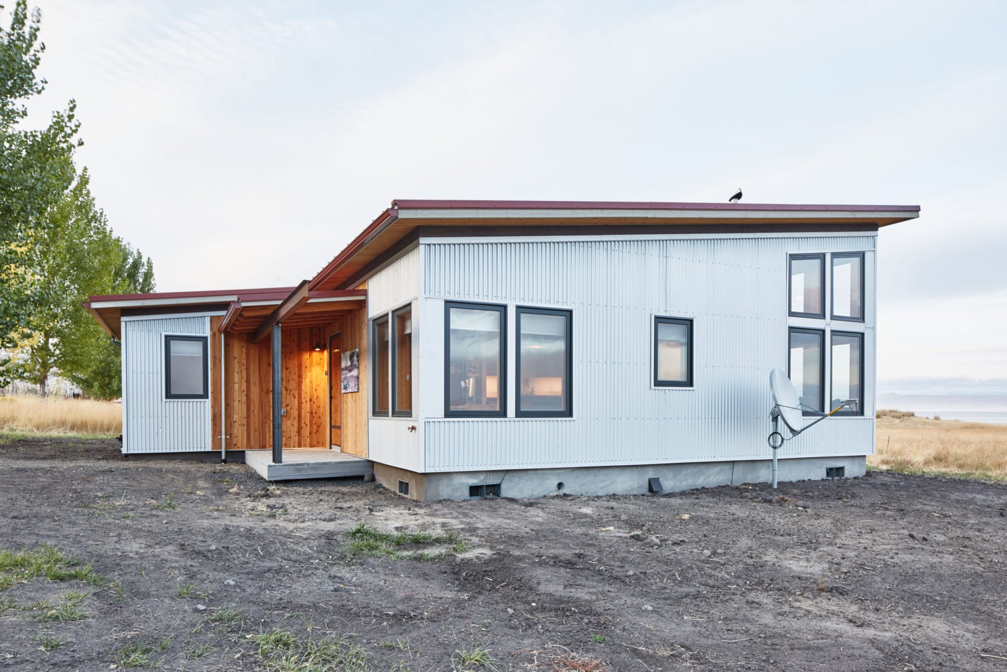 This house prototype is composed of repeating rectangular plan modules, based on a four-foot grid. The structure is constructed with standard light-wood framing materials, pre-fabricated into panels and components that are trucked in and assembled on site. The utility of the metal siding is replaced around the entry areas with the inviting warmth of cedar boards. The continuous low-slope roof plane is simple to construct, provides excellent protection from the prevailing wind and driving rain, and facilitates potential rainwater harvesting. The interior organization, varying ceiling heights, and long vistas through oversized windows, make this compact 960-SF home feel expansive.
