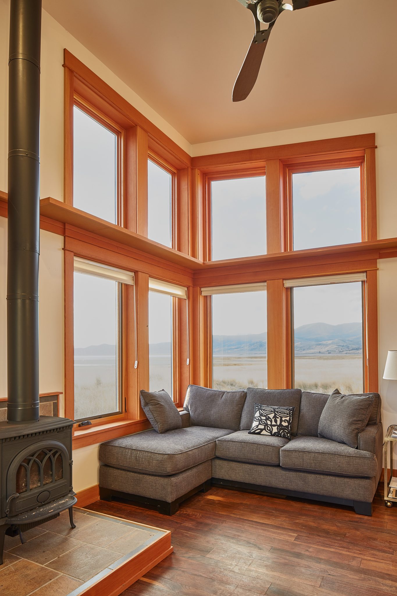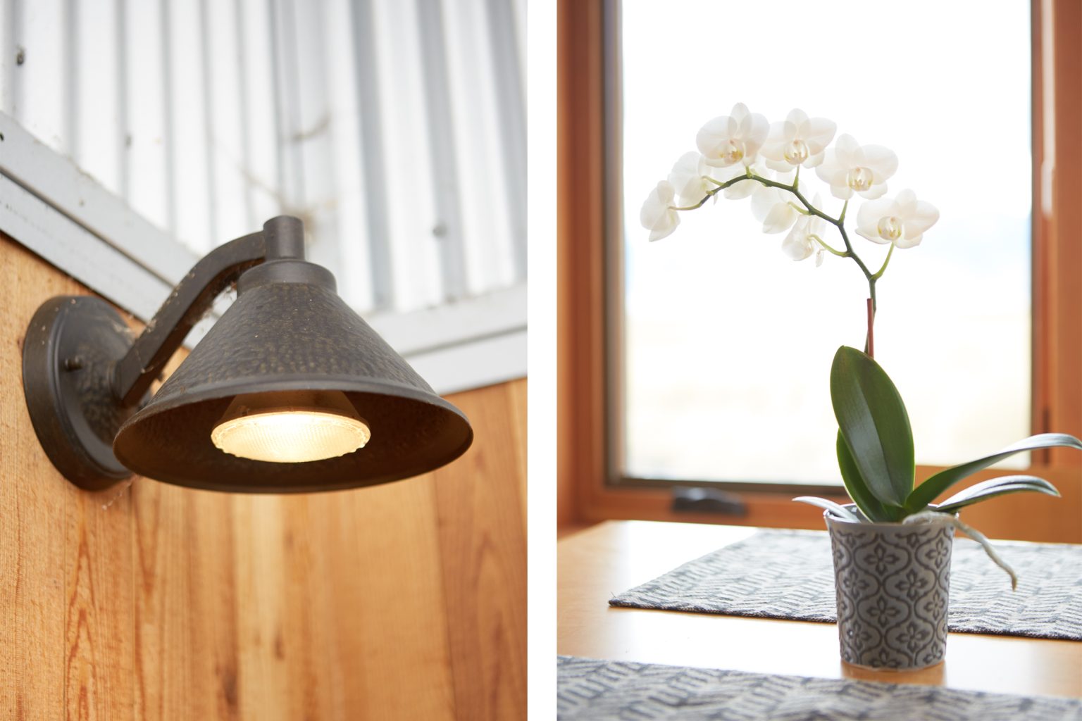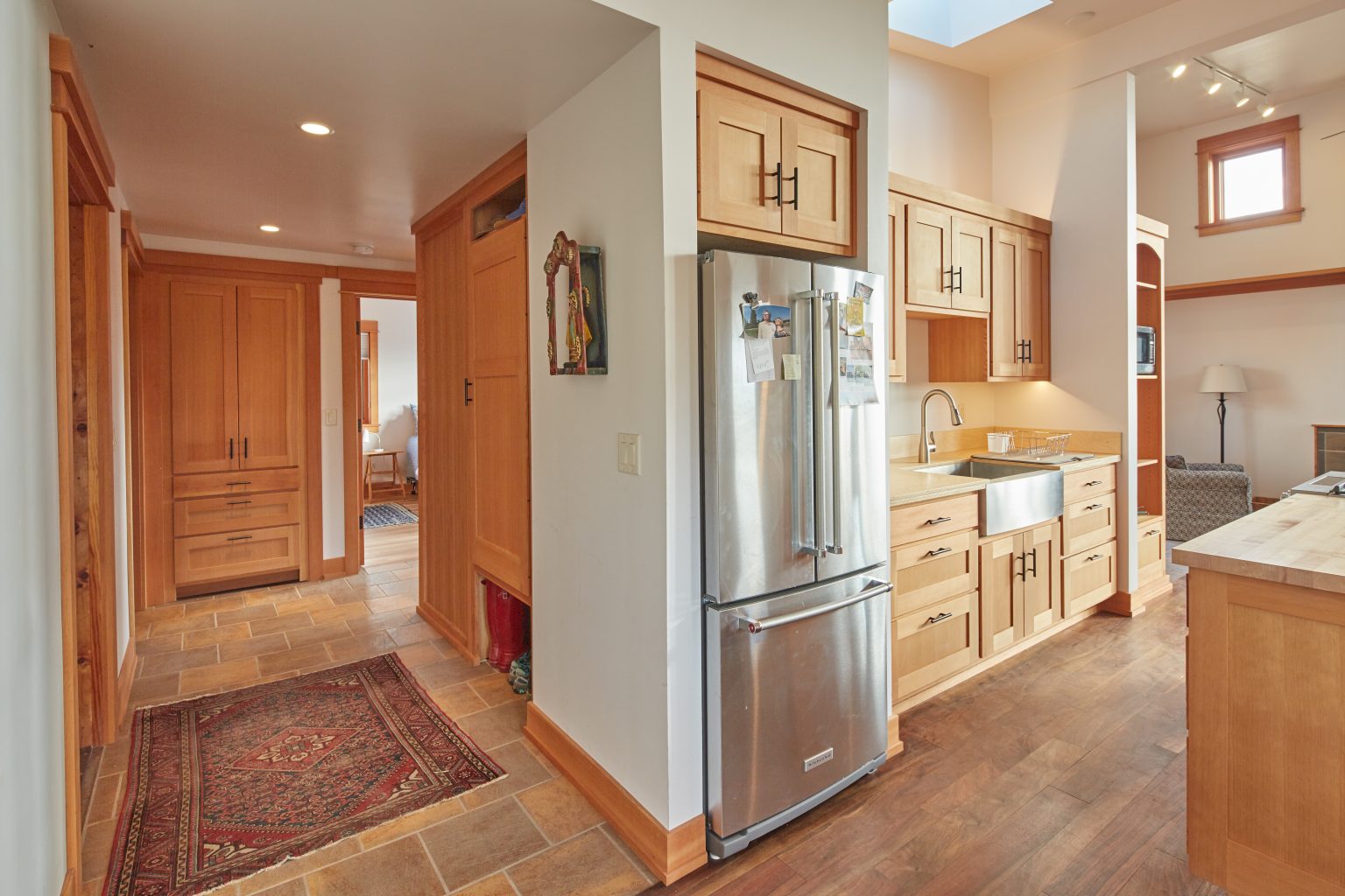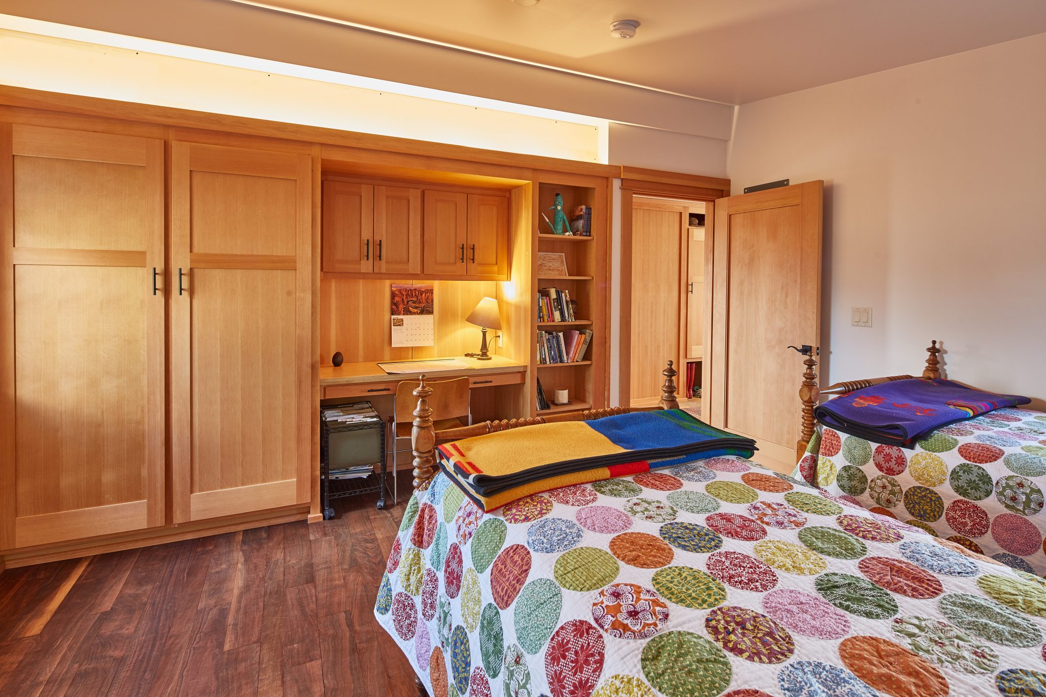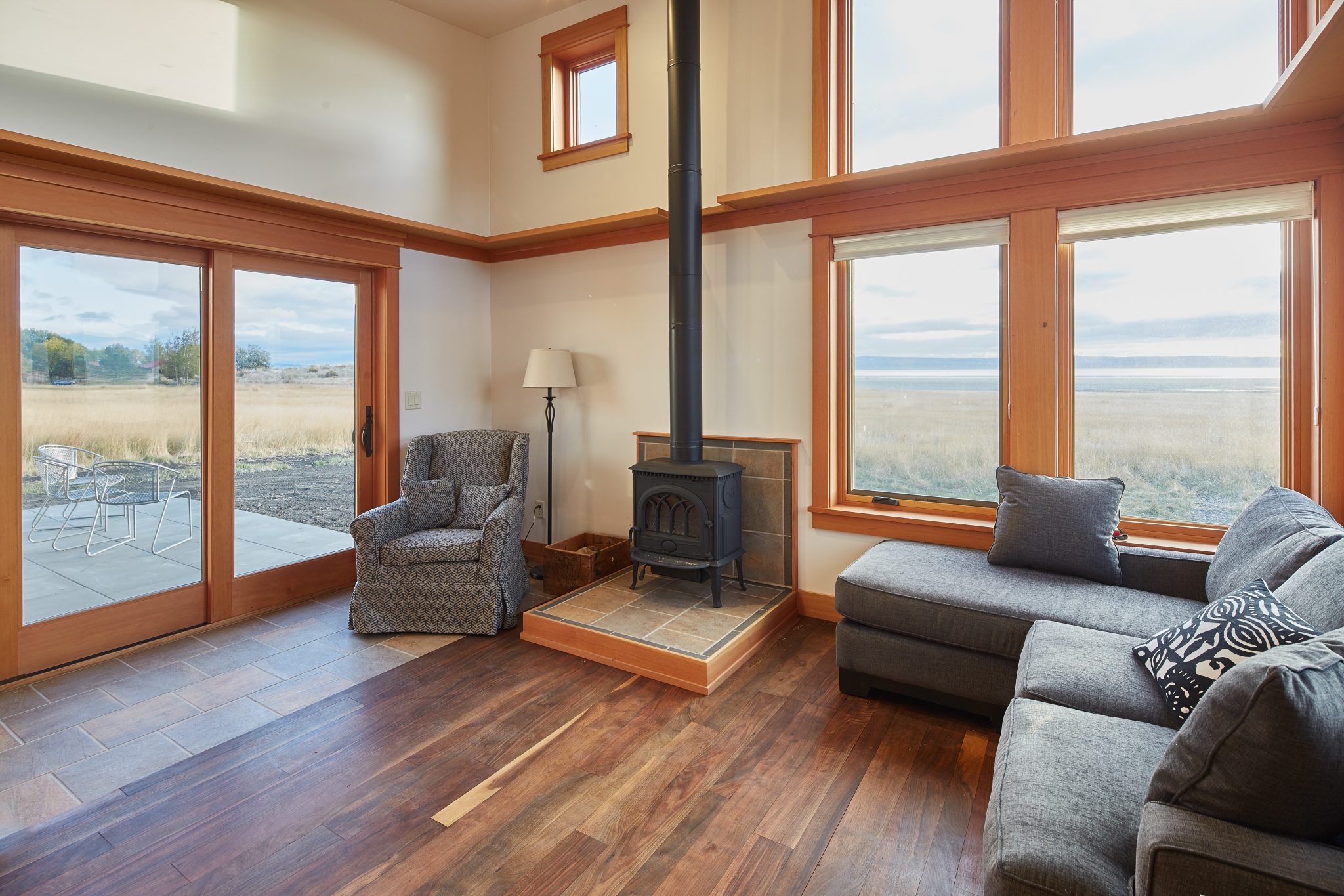 This house prototype is composed of repeating rectangular plan modules, based on a four-foot grid. The structure is constructed with standard light-wood framing materials, pre-fabricated into panels and components that are trucked in and assembled on site. The utility of the metal siding is replaced around the entry areas with the inviting warmth of cedar boards. The continuous low-slope roof plane is simple to construct, provides excellent protection from the prevailing wind and driving rain, and facilitates potential rainwater harvesting. The interior organization, varying ceiling heights, and long vistas through oversized windows, make this compact 960-SF home feel expansive.