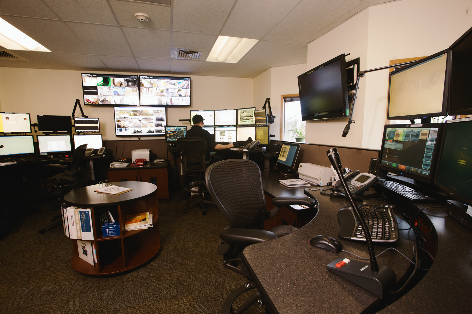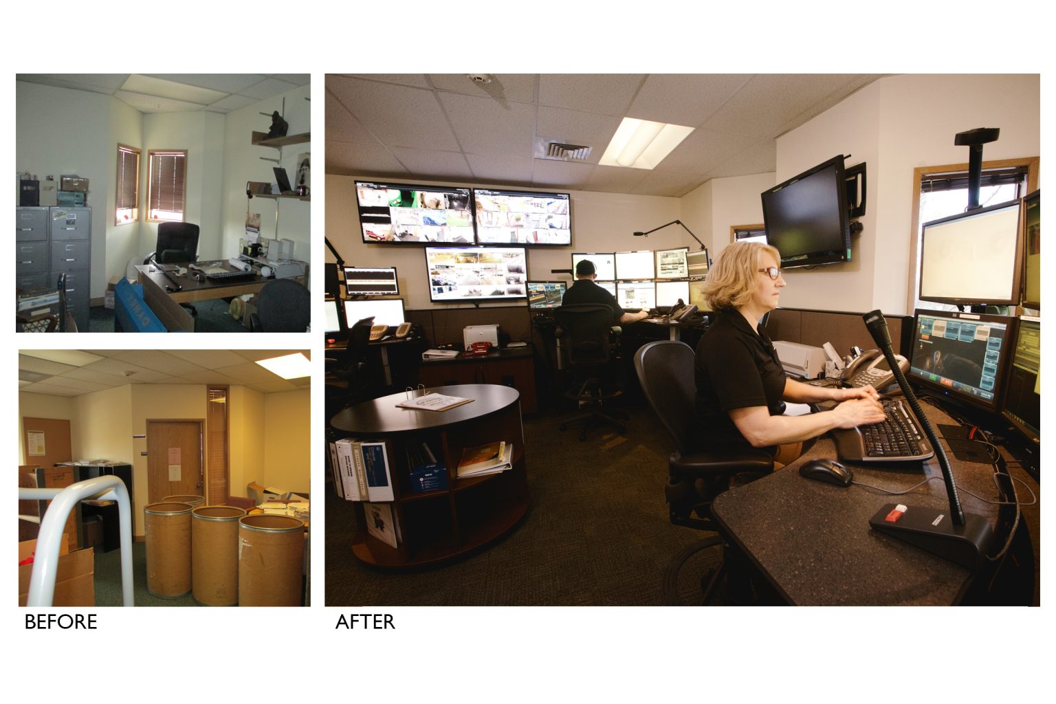 Inserting this state-of-the-art dispatch center into a standard office suite meant a complete remodel along with careful coordination. A secured vestibule protects a central dispatch room, where three high-tech consoles allow personnel to monitor campus security cameras, keep constant links with campus safety and alarm systems, and maintain real-time communications with UOPD patrol staff.