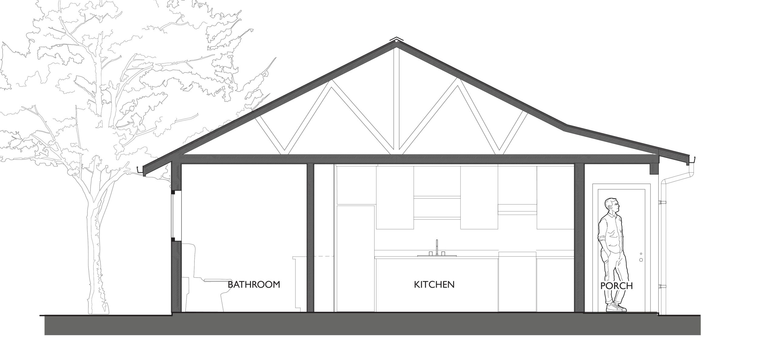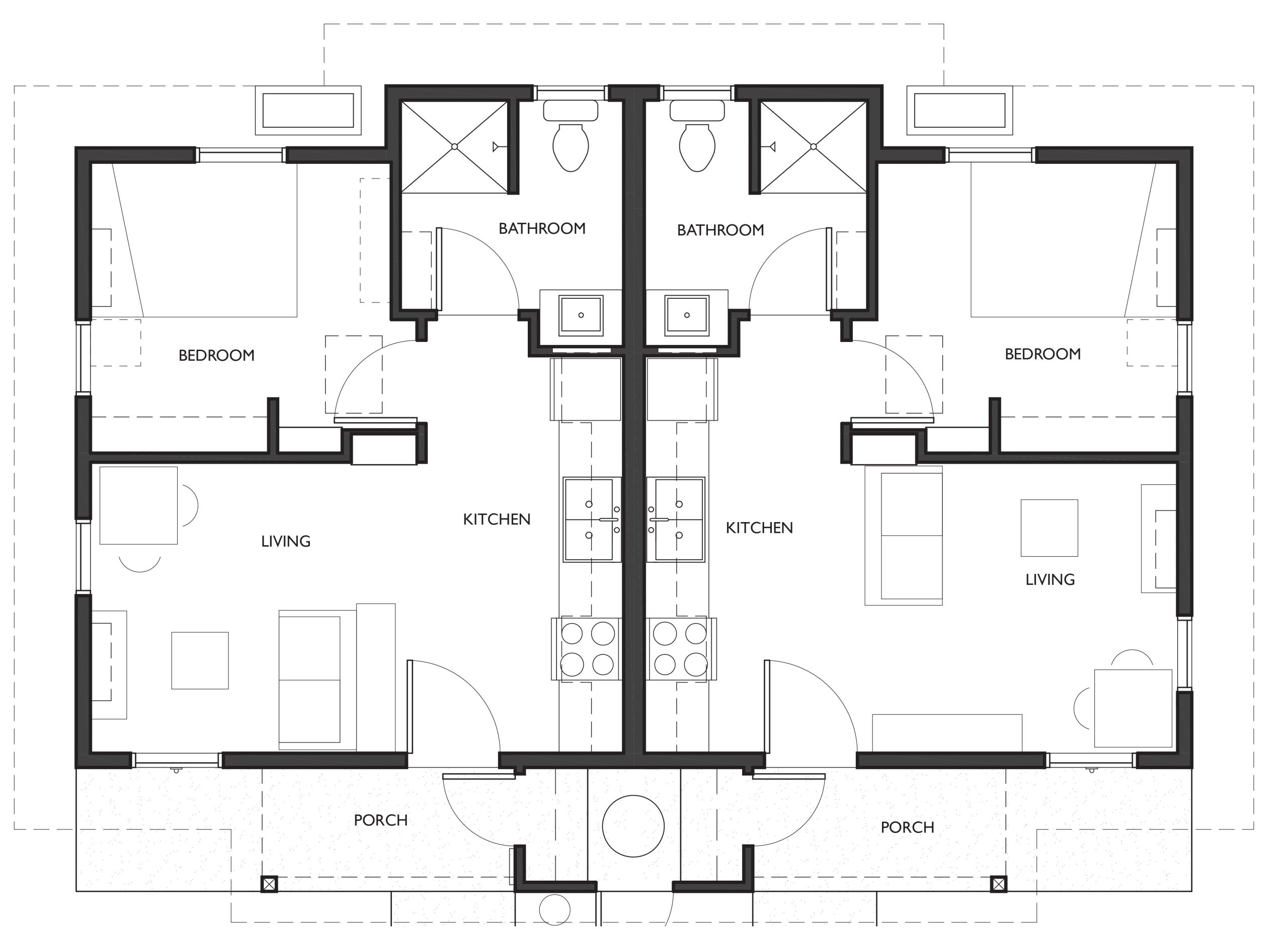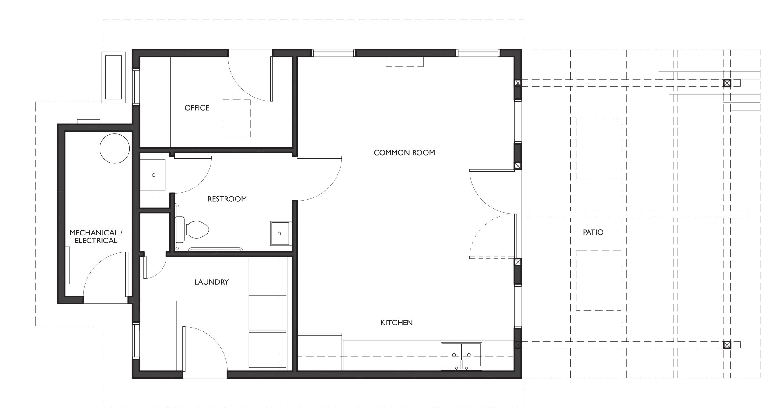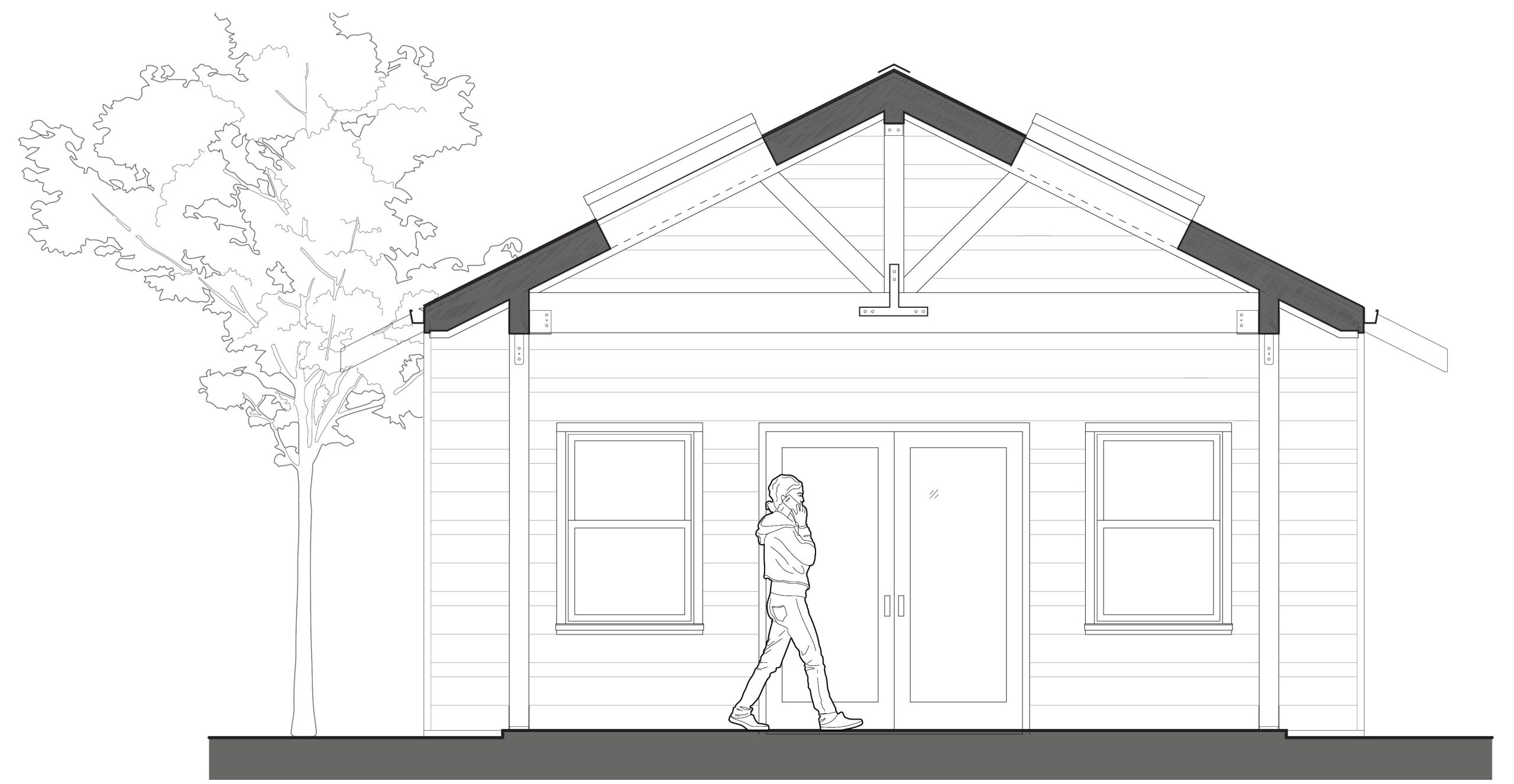 The design includes 12 duplexed tiny homes with a Common Building. These are permanent homes on slab foundations, complete with one bedroom, a living area, a kitchen, a 3-piece bathroom, and storage, all in 380 square feet. These homes meet the California building code and will be powered with electric and solar energy.