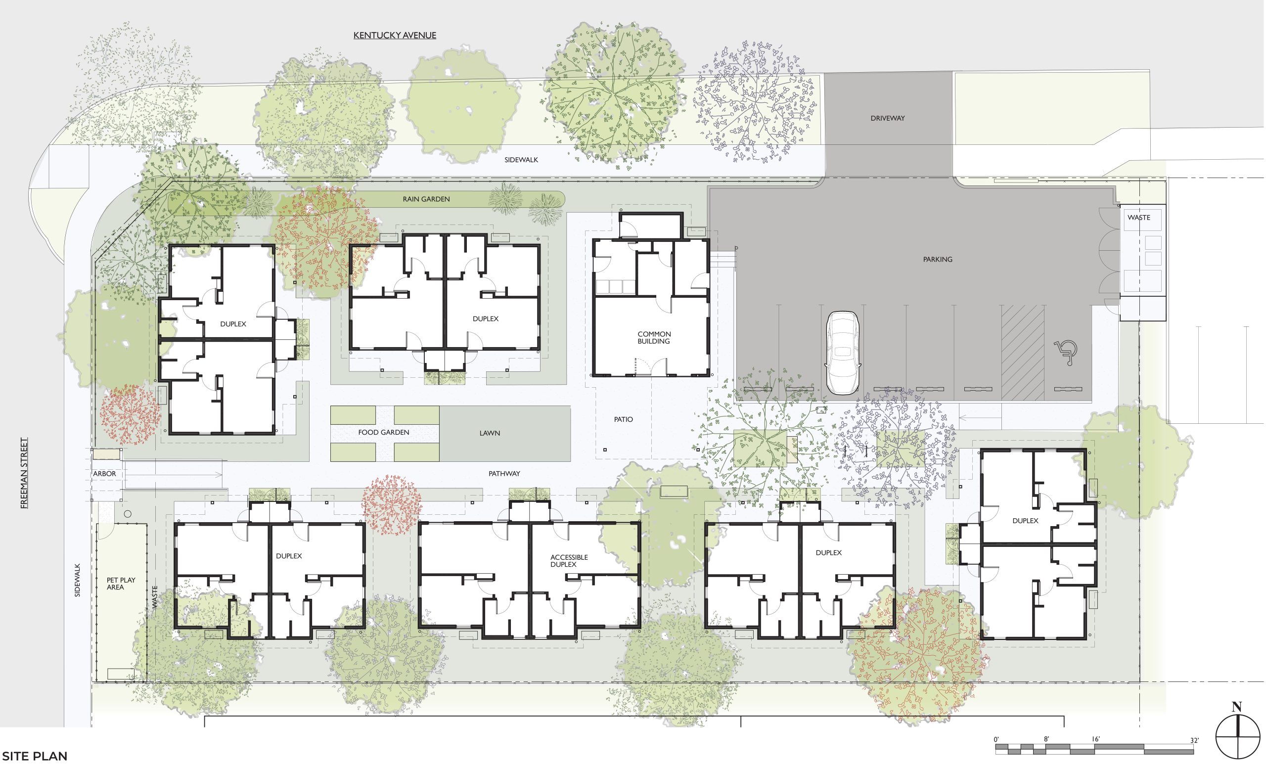 There is a community building with laundry facilities, an office, a gathering room with catering kitchen, an ADA bathroom, and a patio with a shade cover. This common space is designed for community gatherings, meetings, and birthday celebrations. There is a parking lot and street parking, shade trees, wheelchair width cement walkways, drought tolerant landscaping with drip irrigation, a pet relief area, and a grass gathering area. There are raised beds for gardening. The community will be fenced. The site and the Community Building are fully accessible. Ten units are standard design with accessibility in mind. Two units are fully mobility accessible, and one of those units is also communications accessible. There will be a 20-hour per week on-site manager.