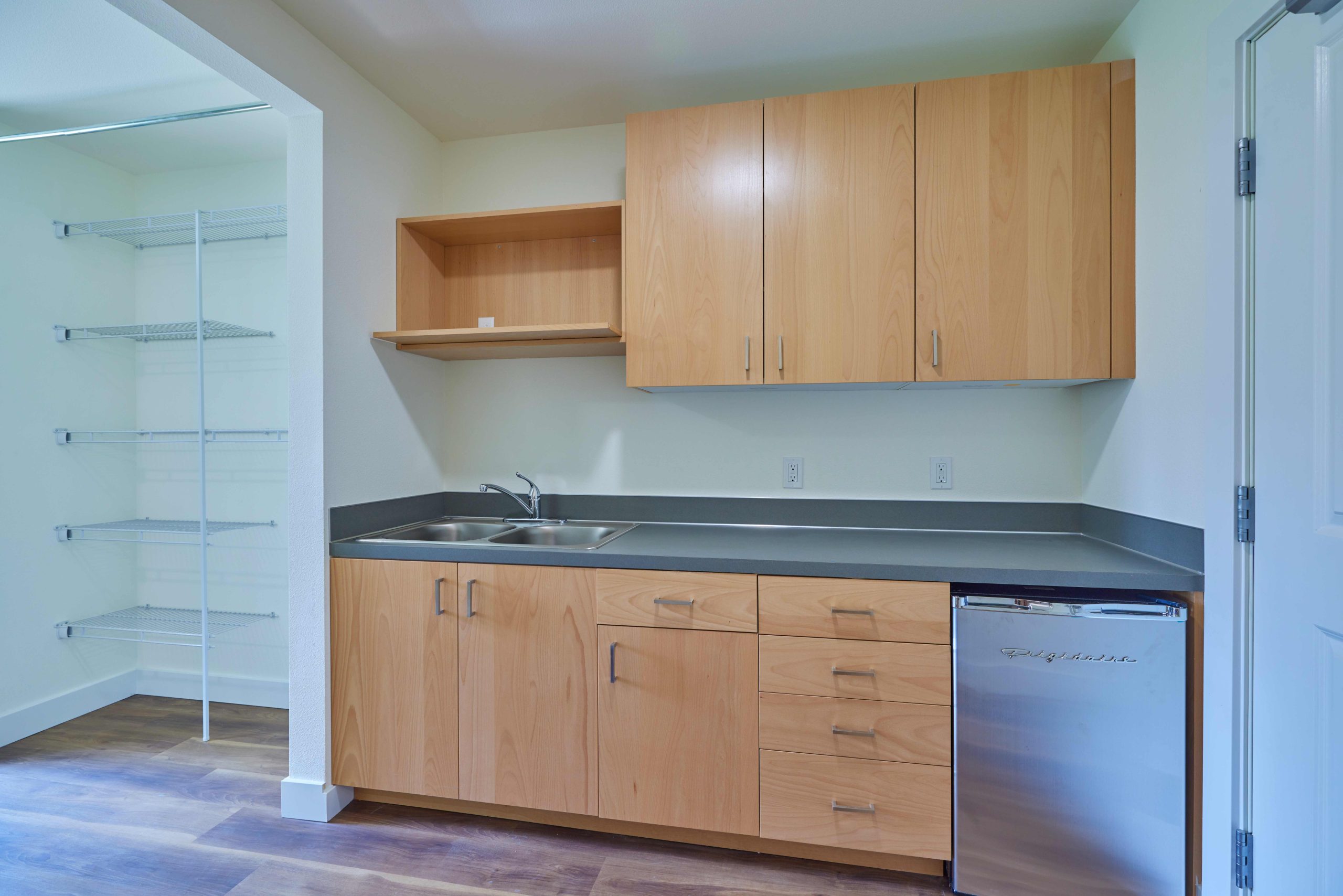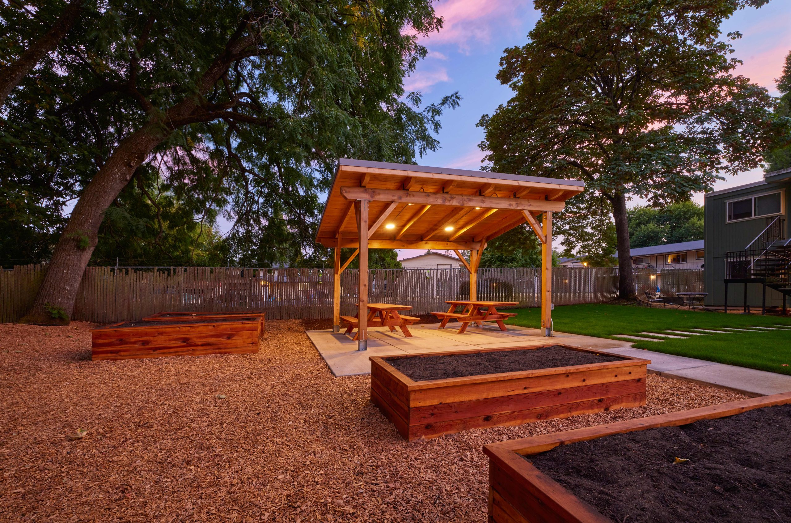 The 6,000-SF infill development adds 12 Single Room Occupancy (SRO) units, a site manager’s apartment, and shared spaces including a community kitchen and dining room, meeting room, laundry, and a flexible gathering space for classes and events. The new L-shaped, two-story building works in harmony with the existing apartments to frame a courtyard featuring an arbor, pavilion, garden beds, recreation lawn, rain garden, and secure bike parking.
