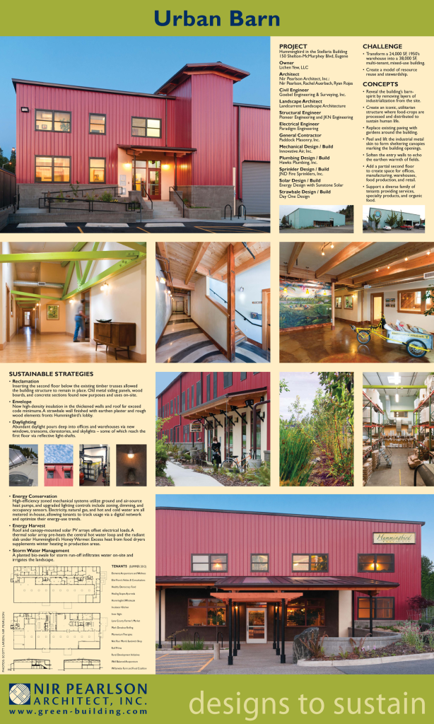 Envelope: New high-density insulation in the thickened walls and roof far exceed code minimums. A strawbale wall finished with earthen plaster and rough wood elements fronts Hummingbird’s lobby.