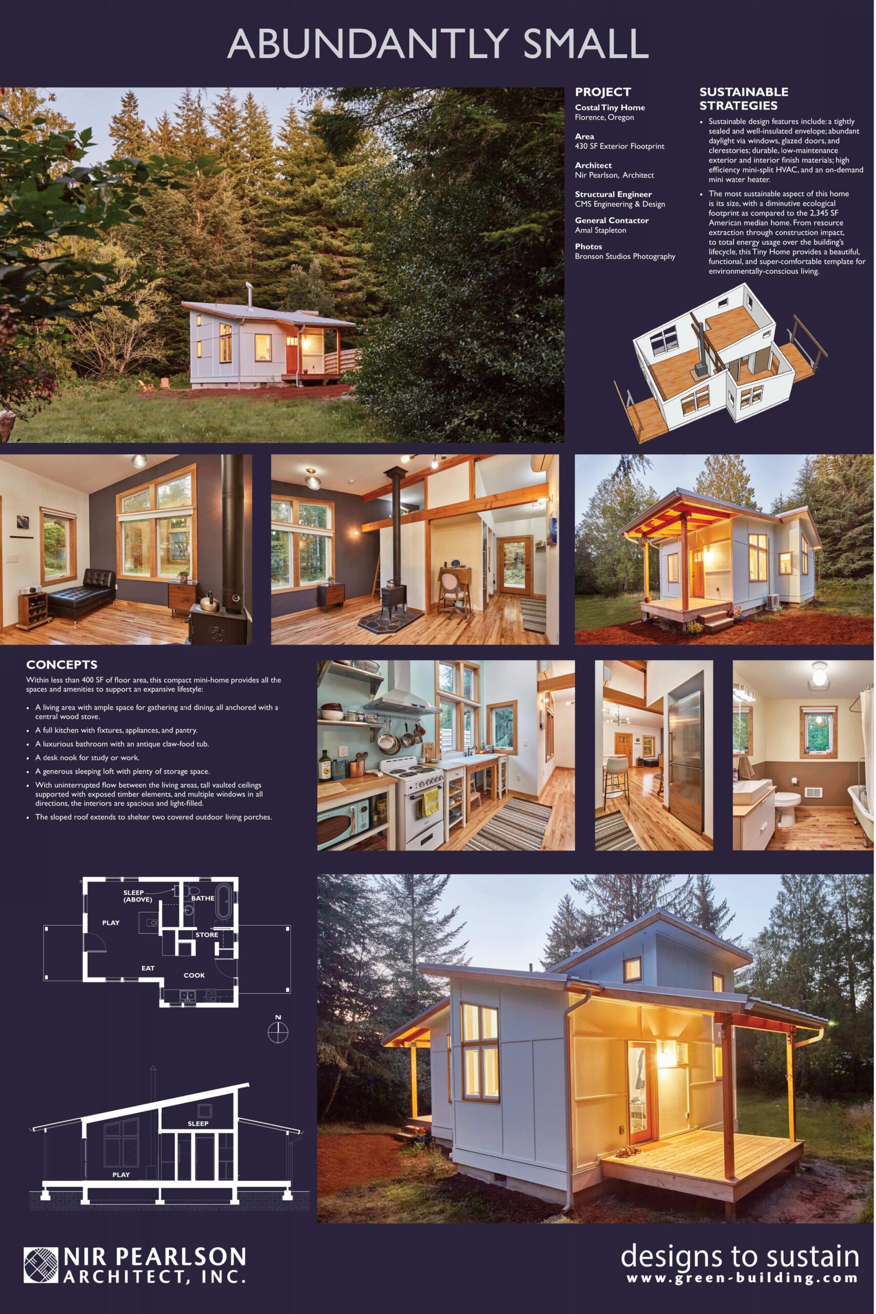 - Sustainable design features include: a tightly sealed and well-insulated envelope; abundant daylight via windows, glazed doors, and clerestories; durable, low-maintenance exterior and interior finish materials; high efficiency mini-split HVAC, and an on-demand mini water heater.